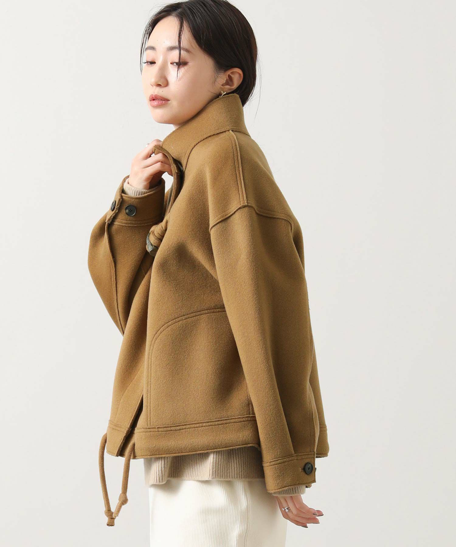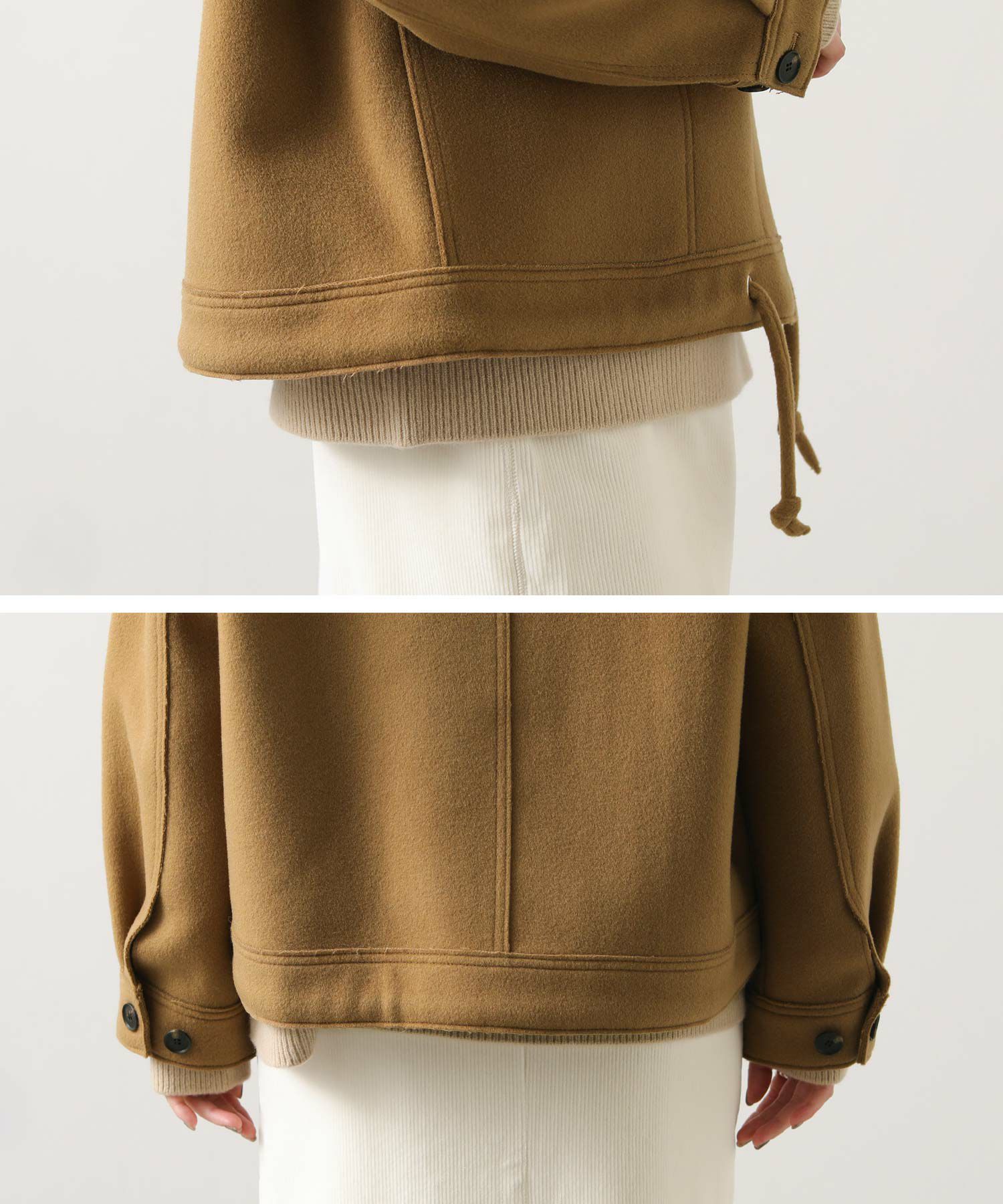 胸元のトグル以外に裾までかくしドットがあるので、ショート丈でもしっかり防寒アイテムとして使えます。