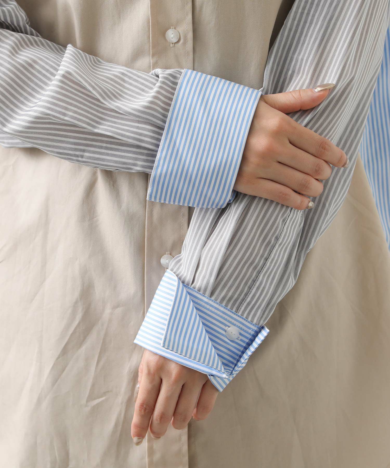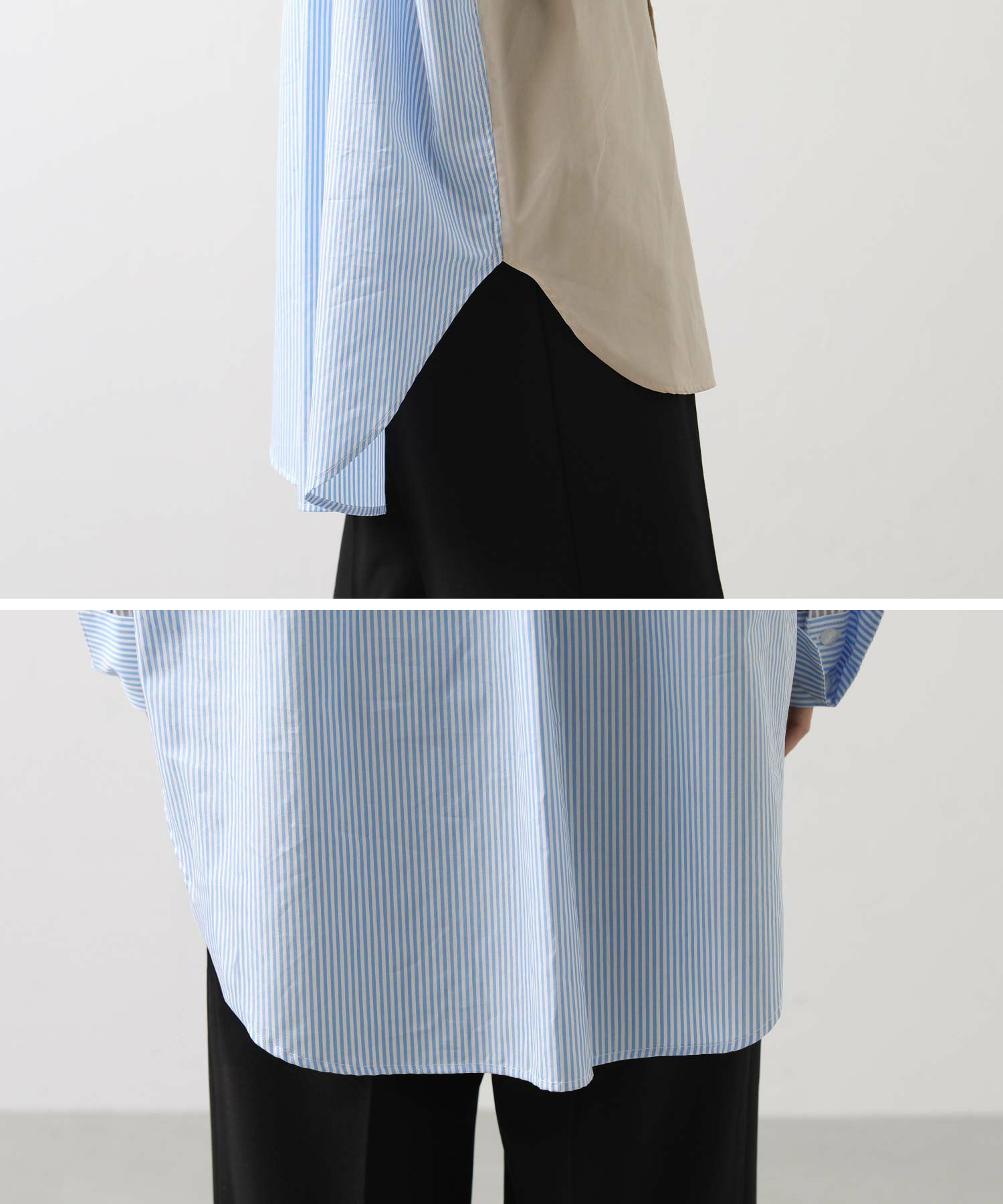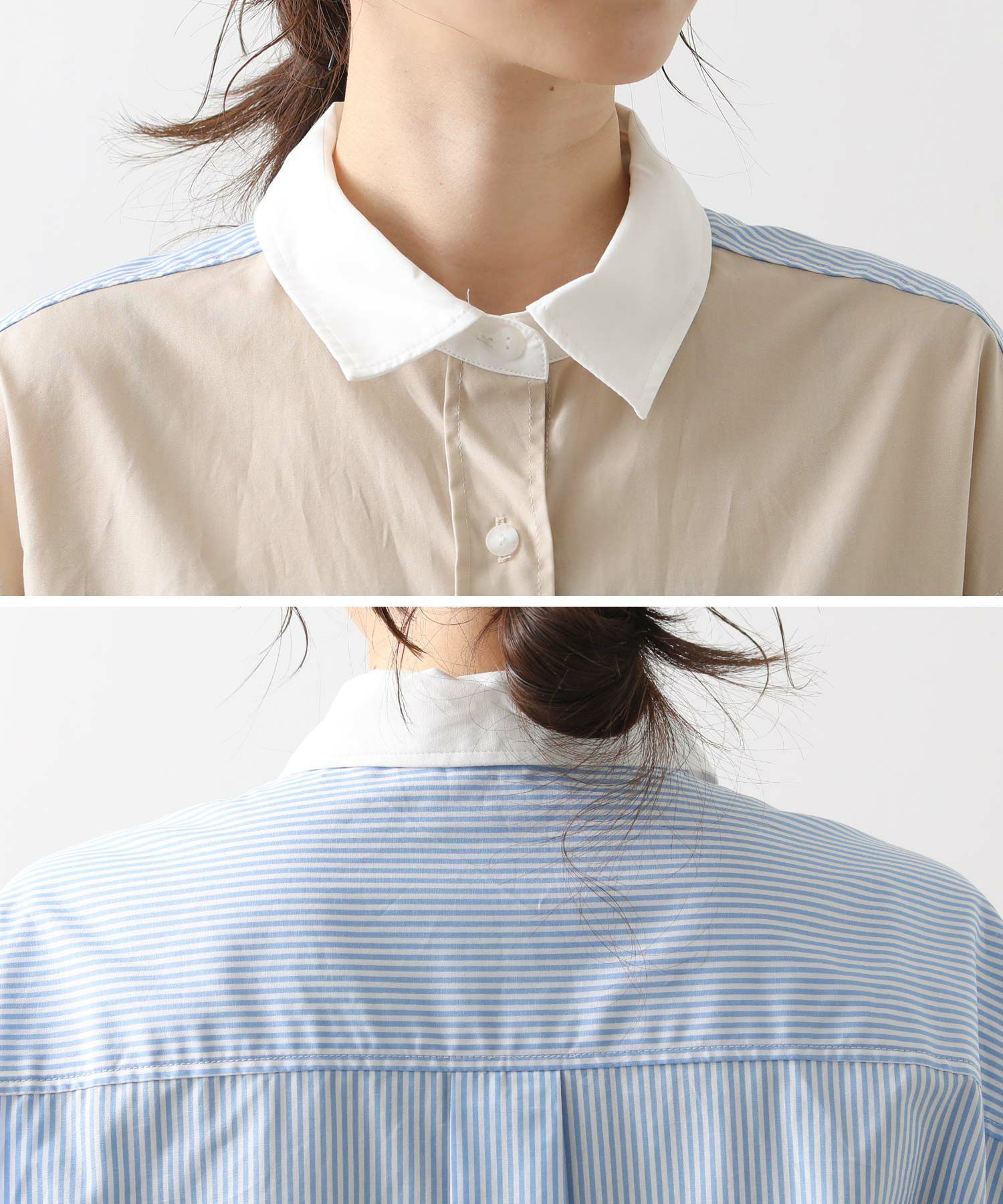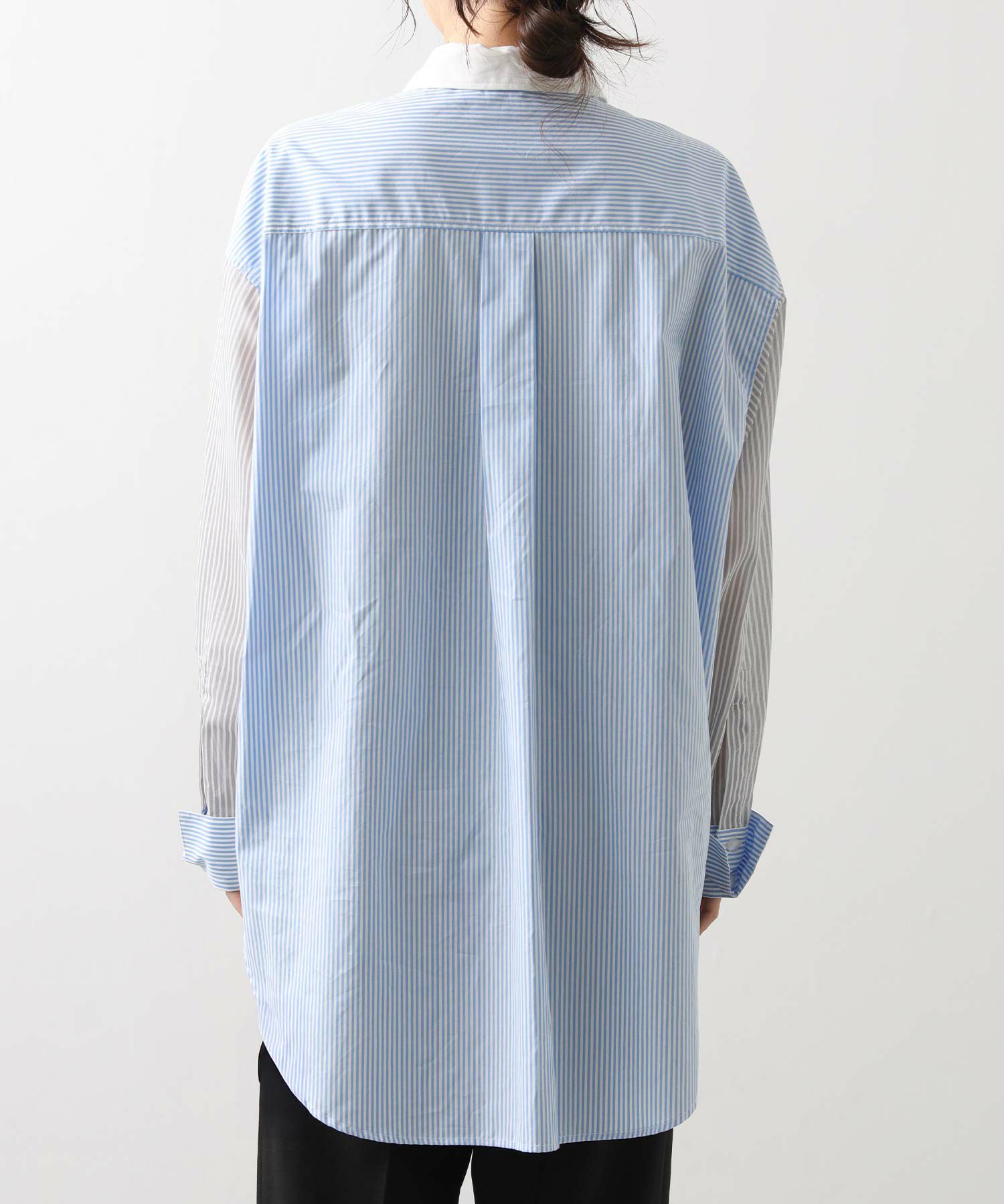 前身頃と衿は色違いのプロード、後身頃とカフスはストライブ、袖はシアーストライプと3種類の素材を使い分けたデザイン。