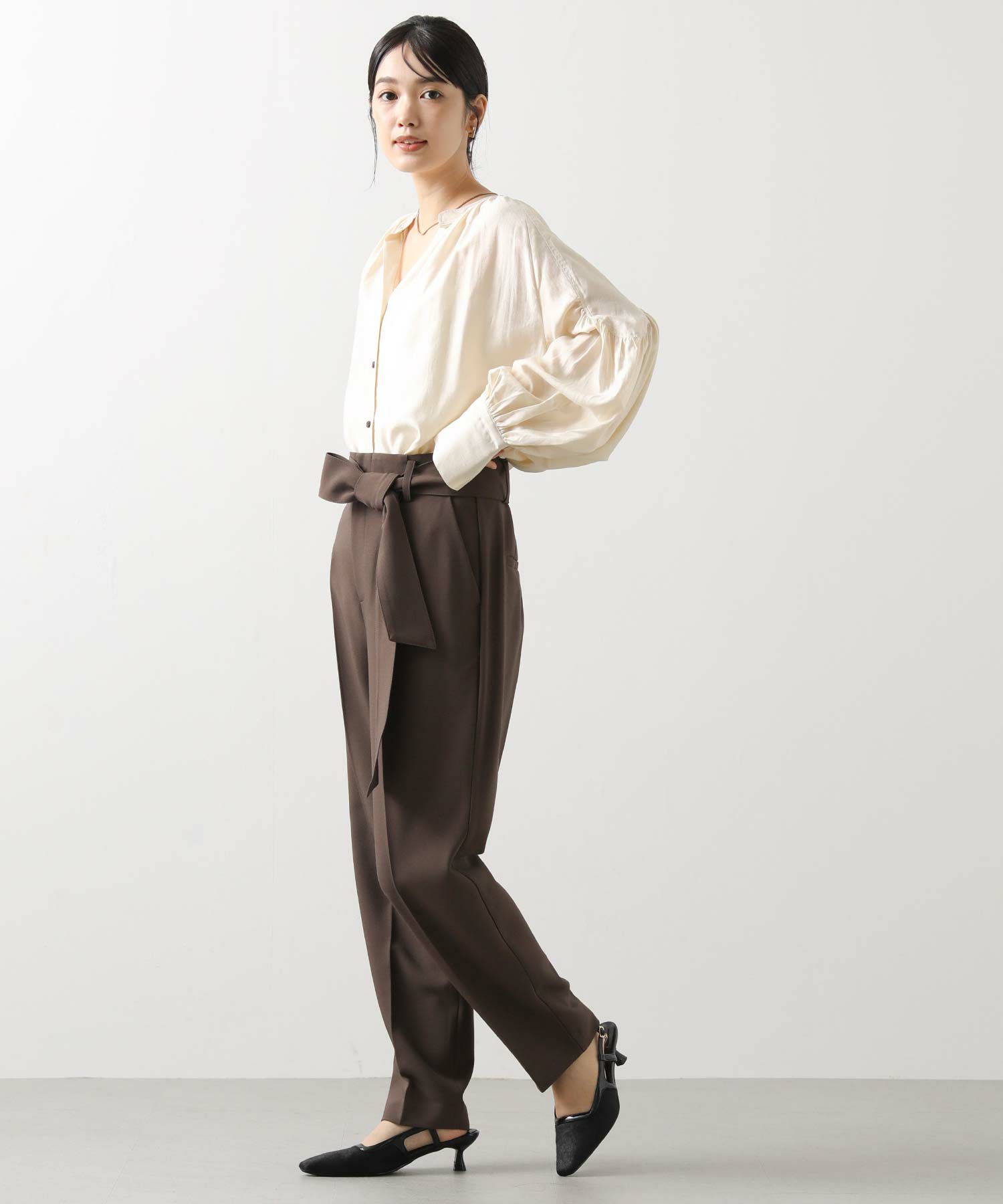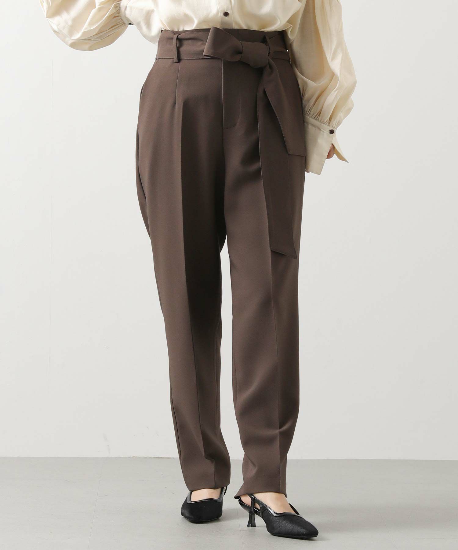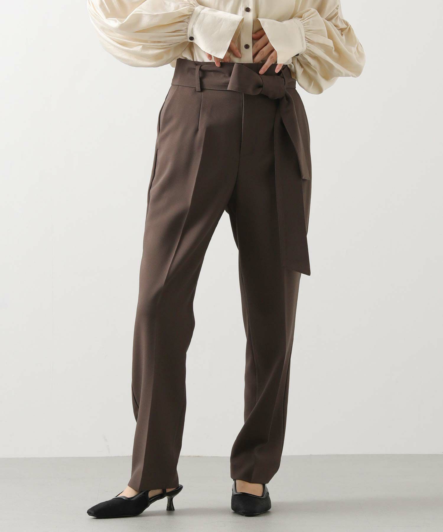 すっきりとしたタックレスのハイウエストデザインで、スタイルアップ効果も期待できるシルエット。