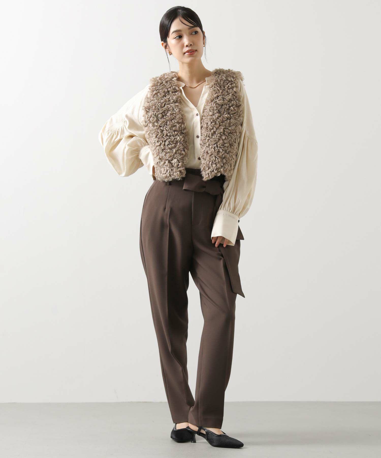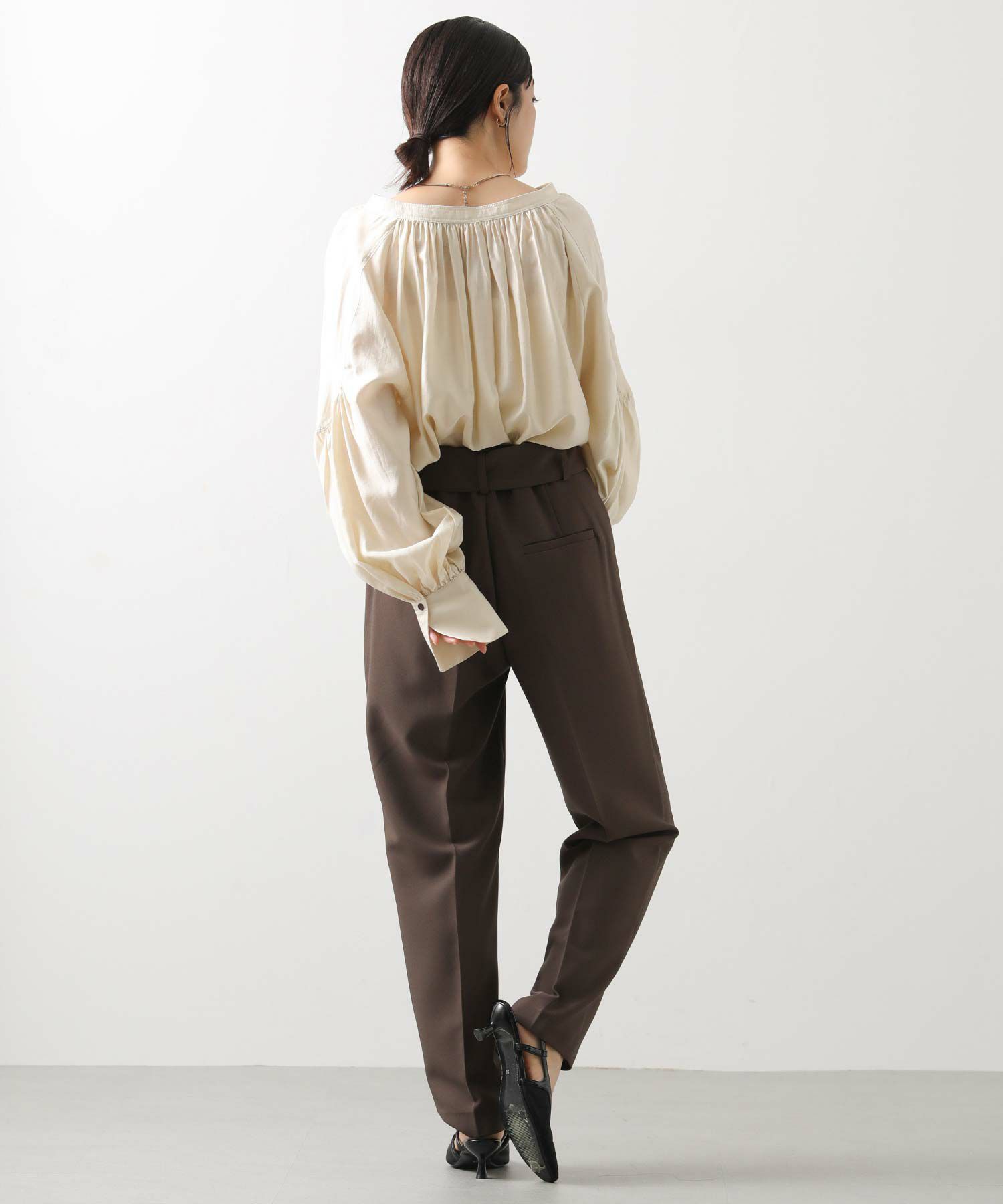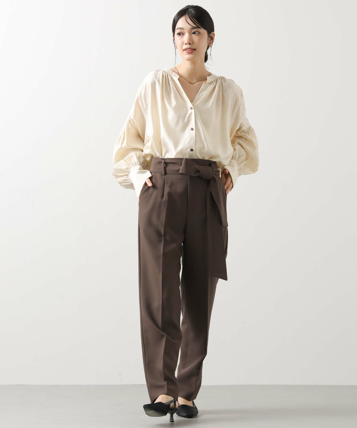 すっきりとしたタックレスのハイウエストデザインで、スタイルアップ効果も期待できるシルエット。