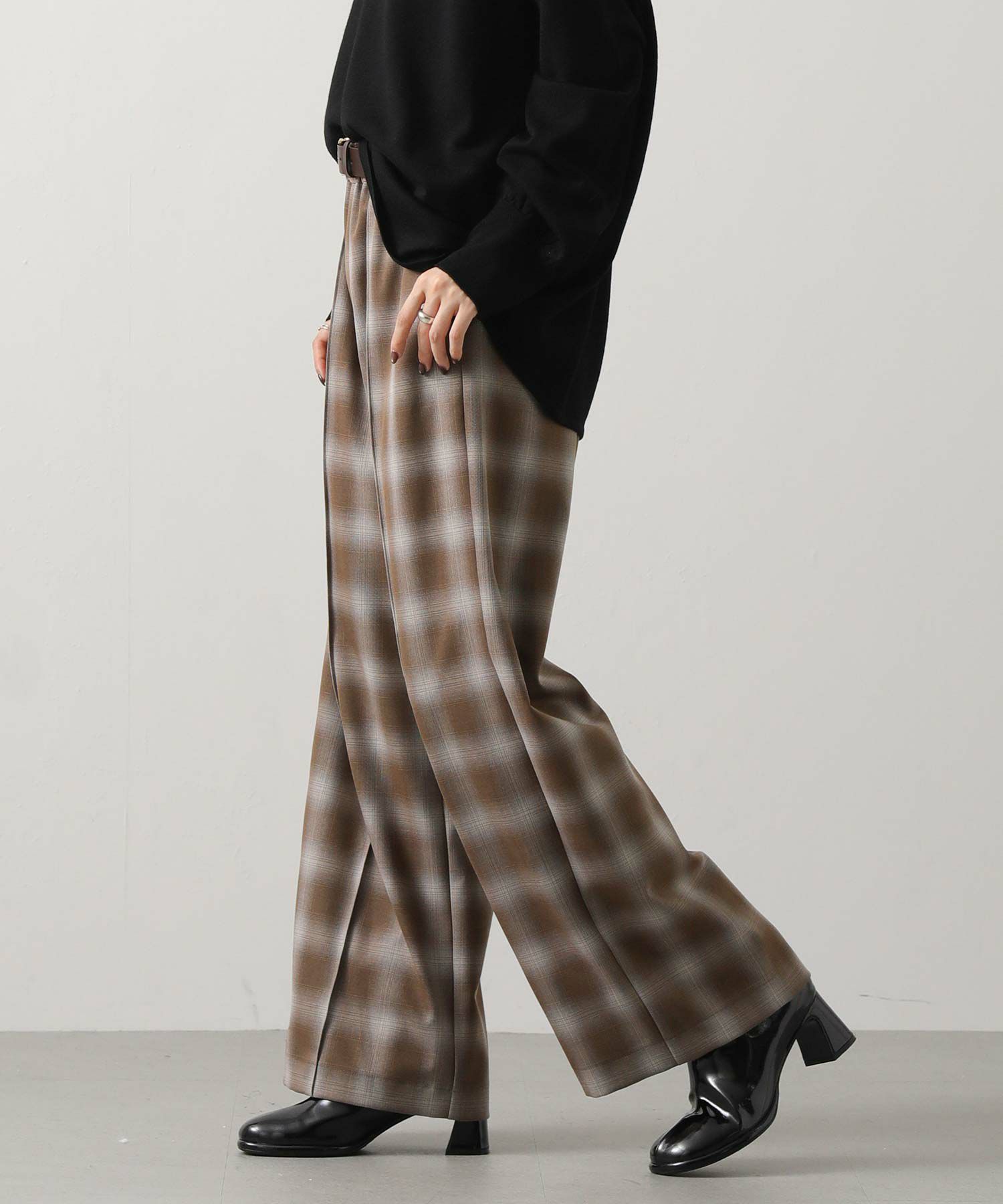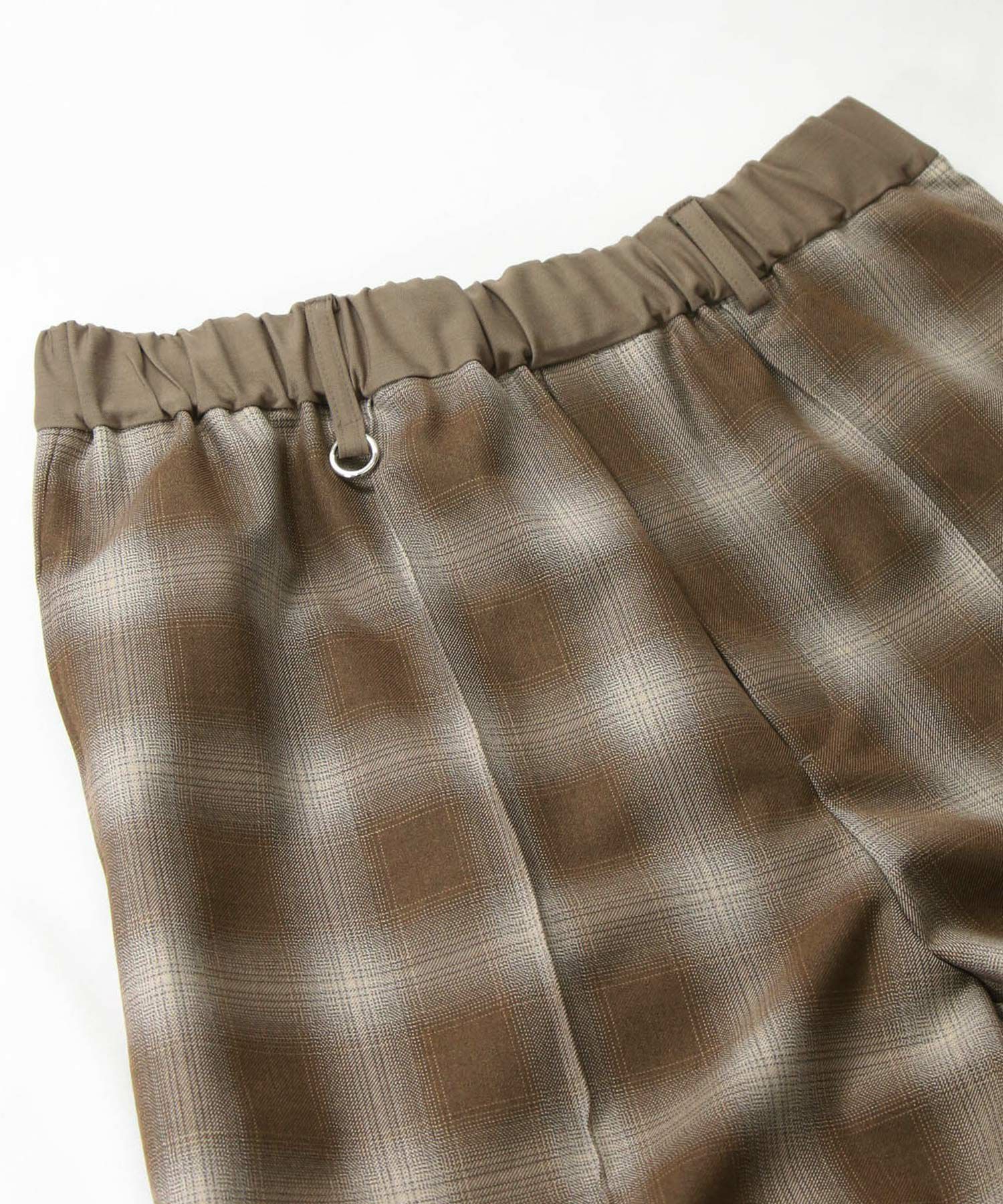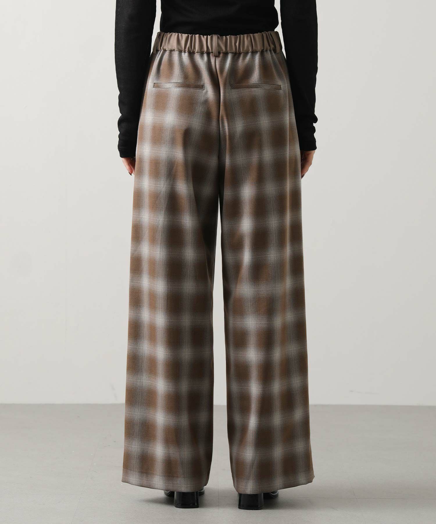 オンブレチェックの裏微起毛ツイルを使用した、ピンタック入りのワイドパンツ。