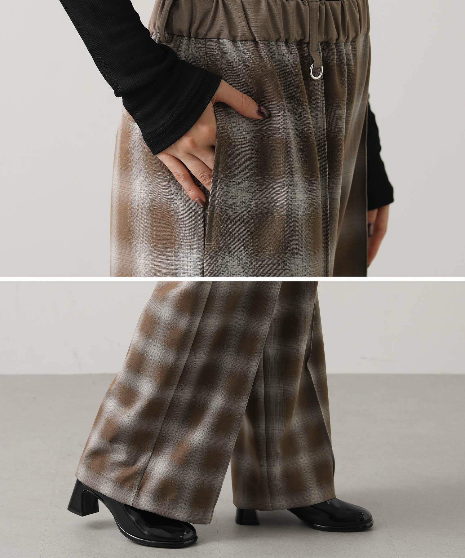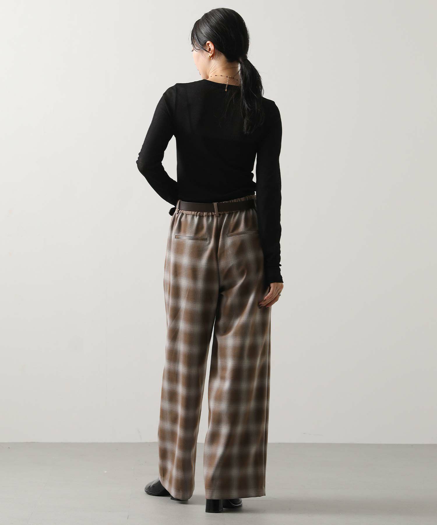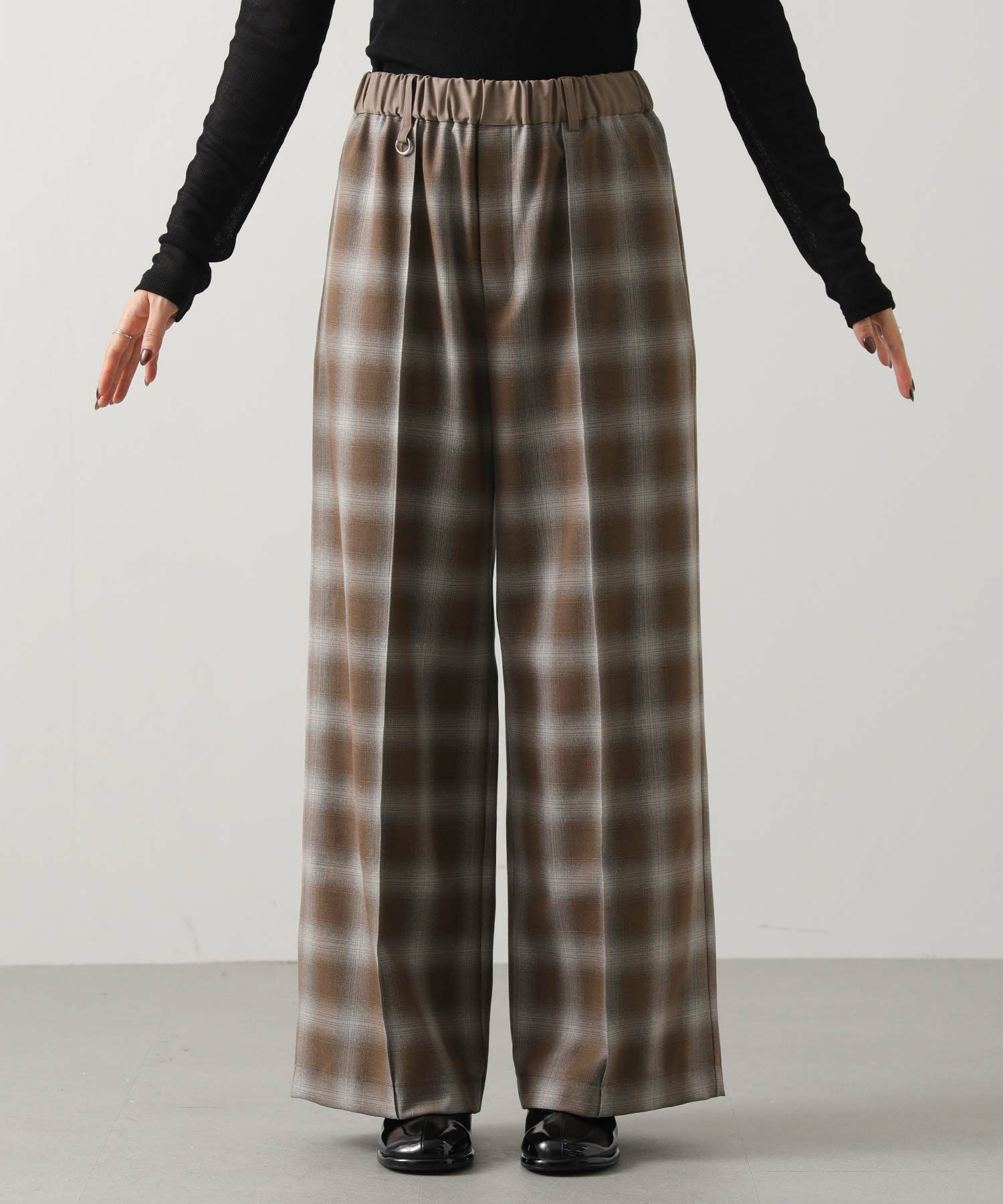 オンブレチェックの裏微起毛ツイルを使用した、ピンタック入りのワイドパンツ。