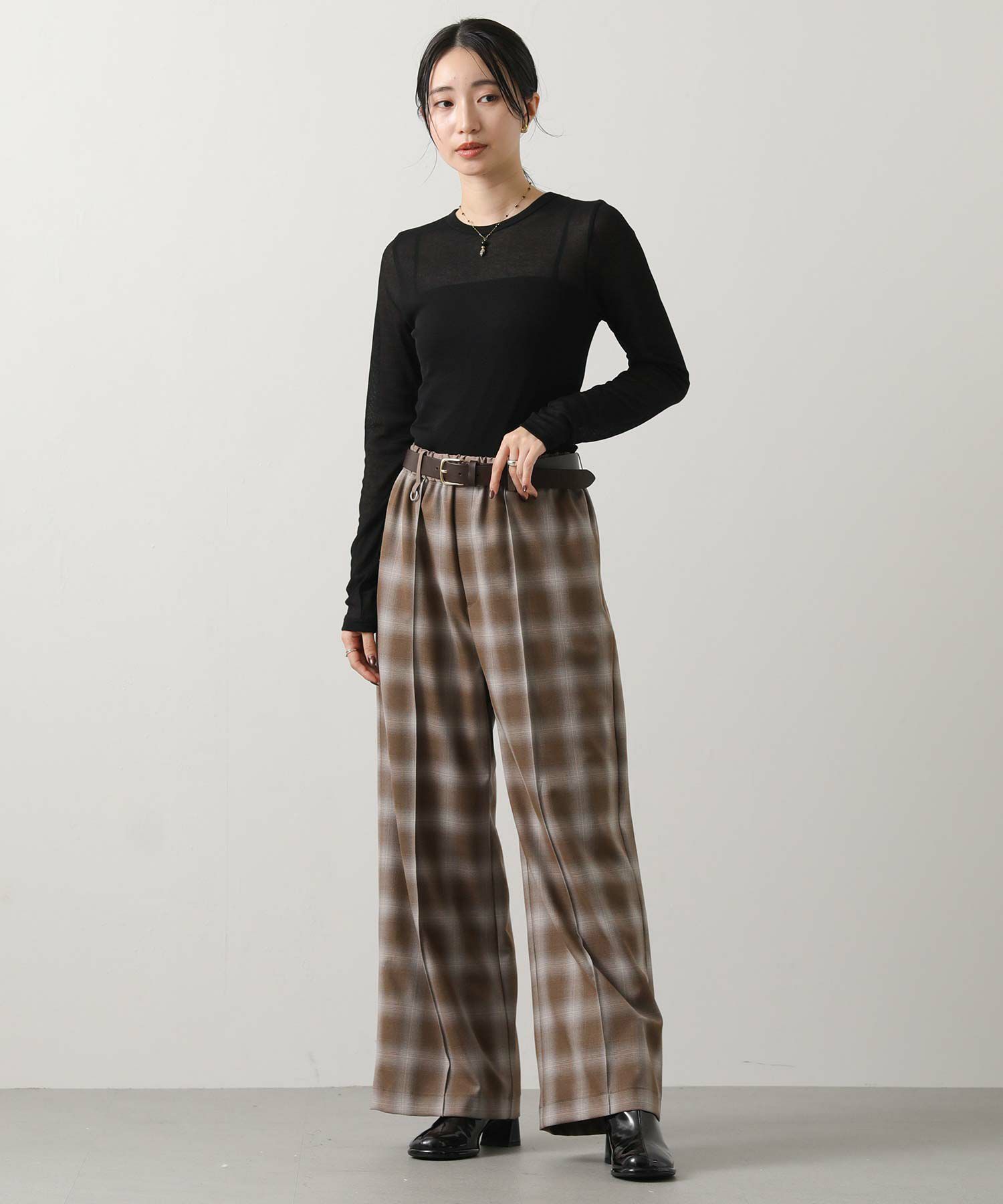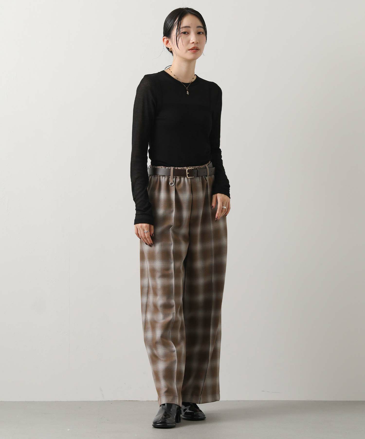 きれいな表面感の素材なので、オンブレチェックでもカジュアルになり過ぎないのがポイント。