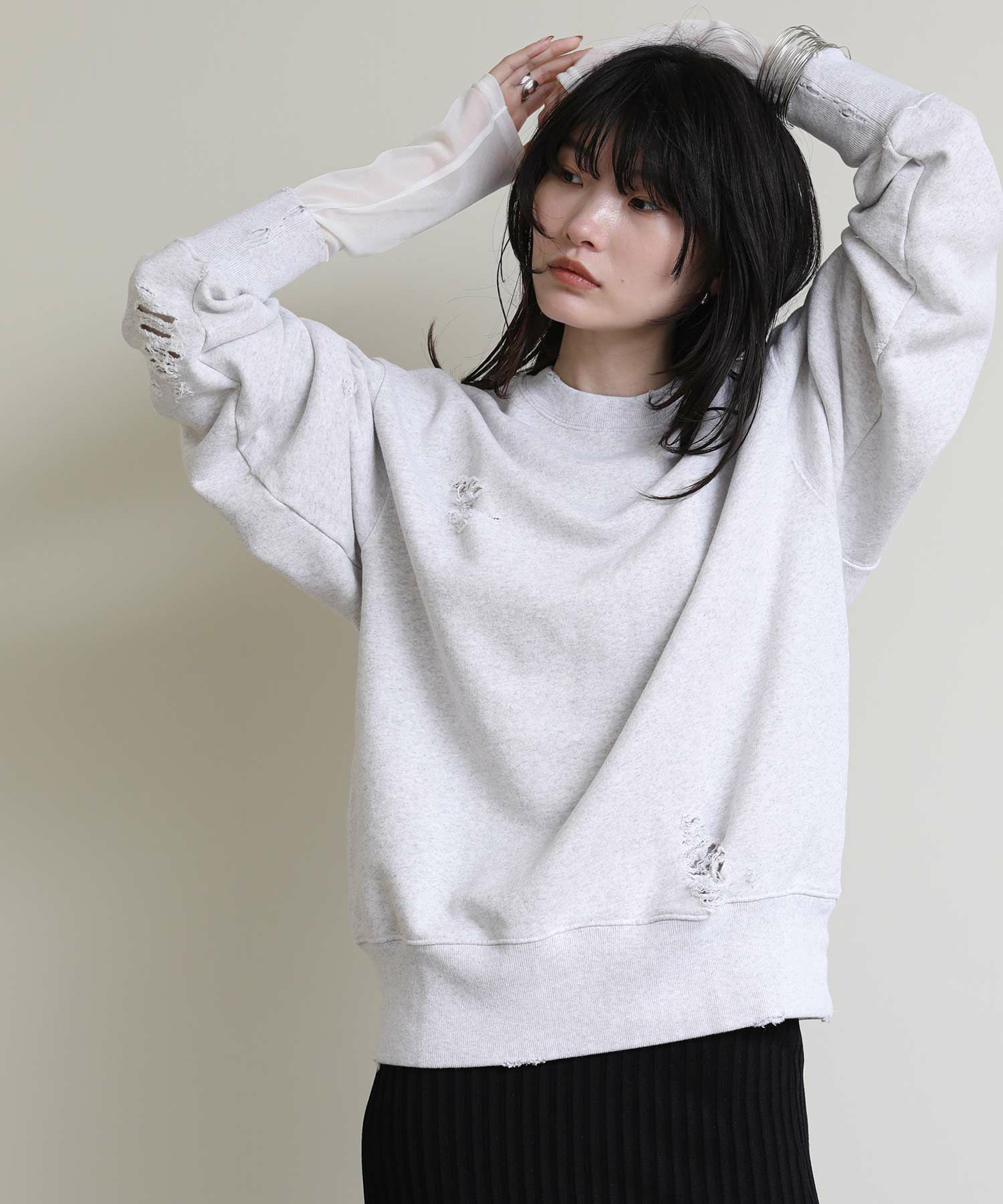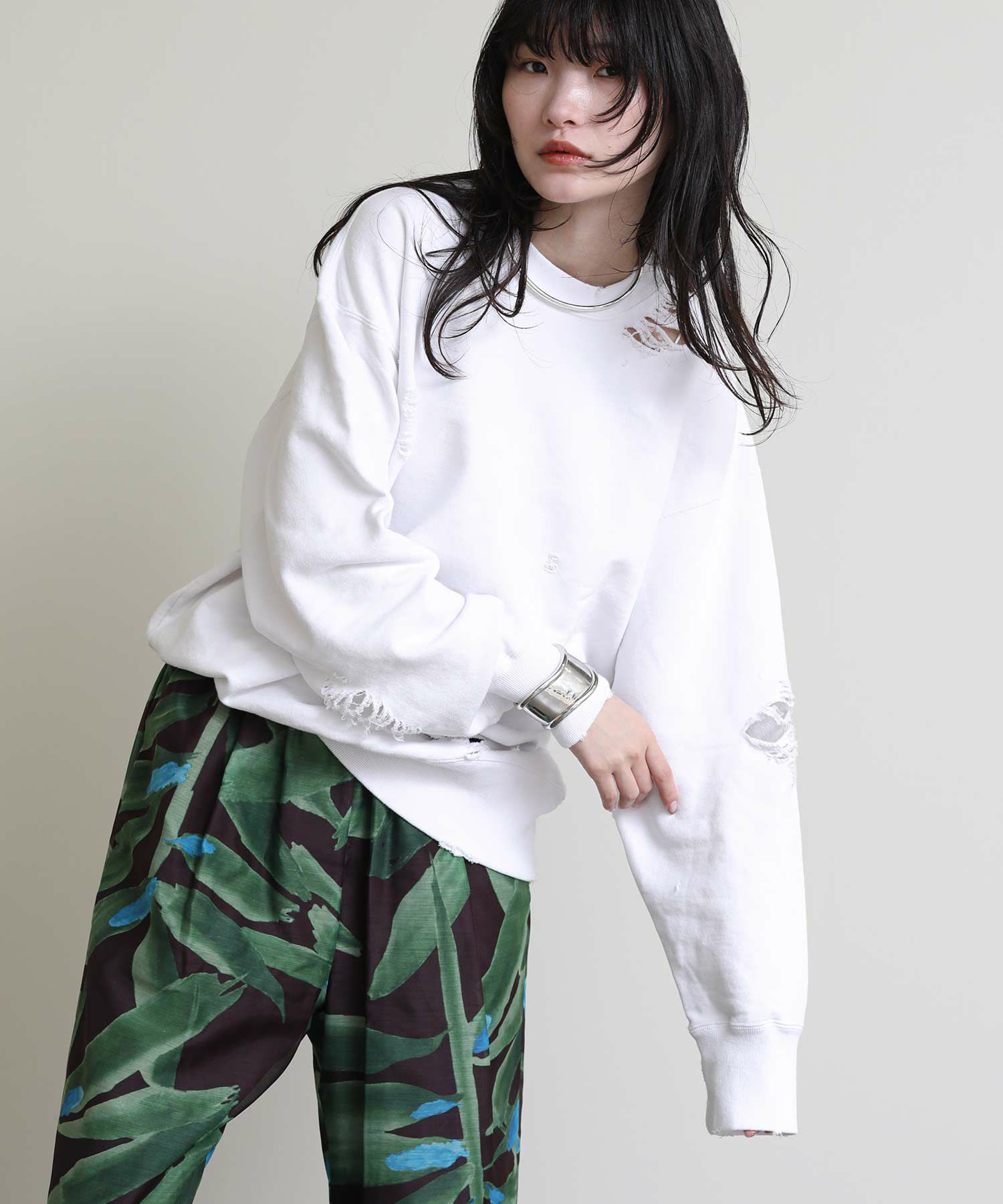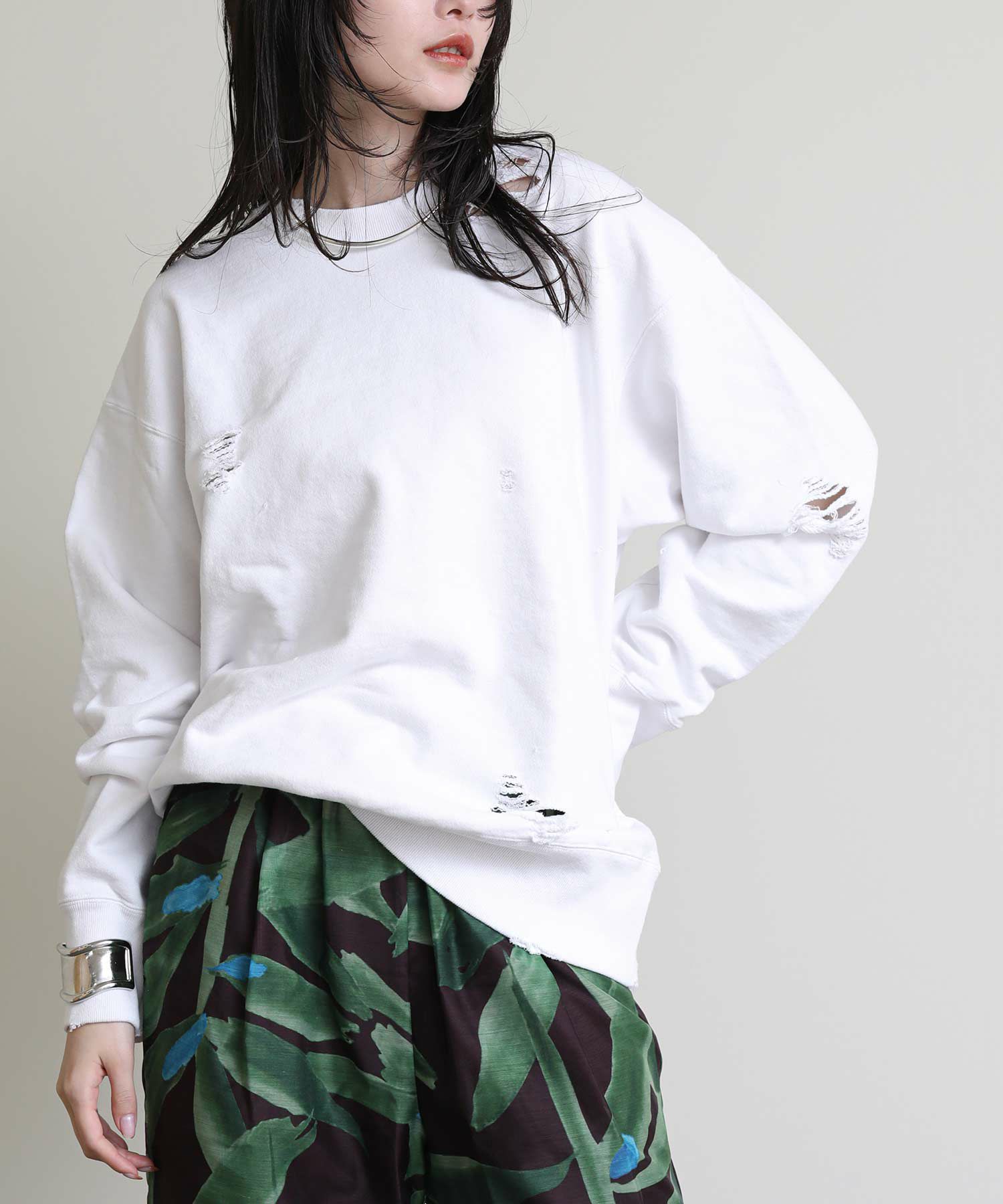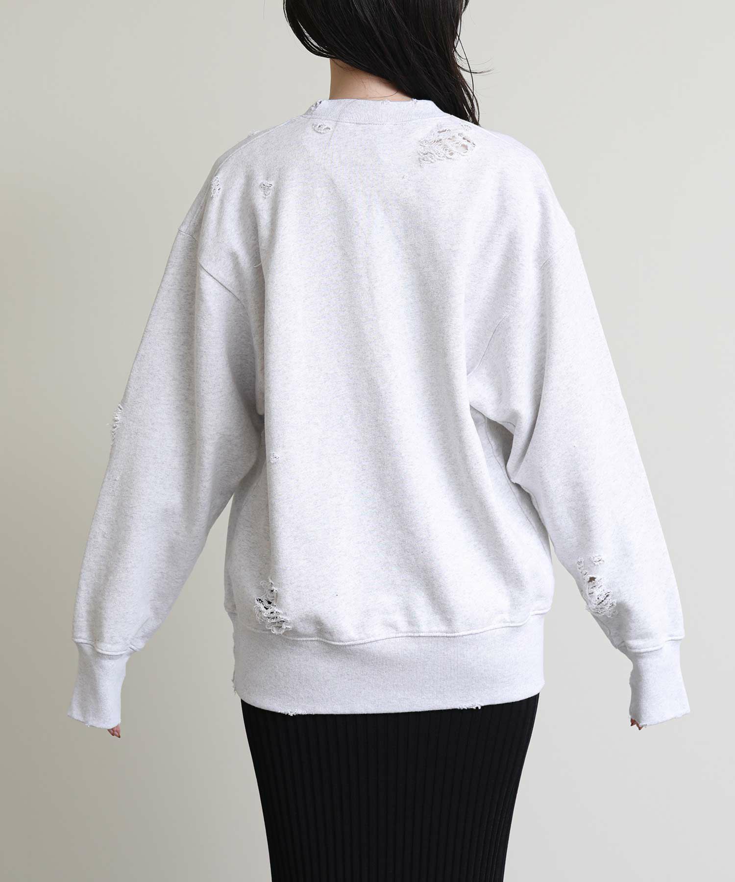 全体にハードなダメージ加工を施した遊び心溢れるスウェット。