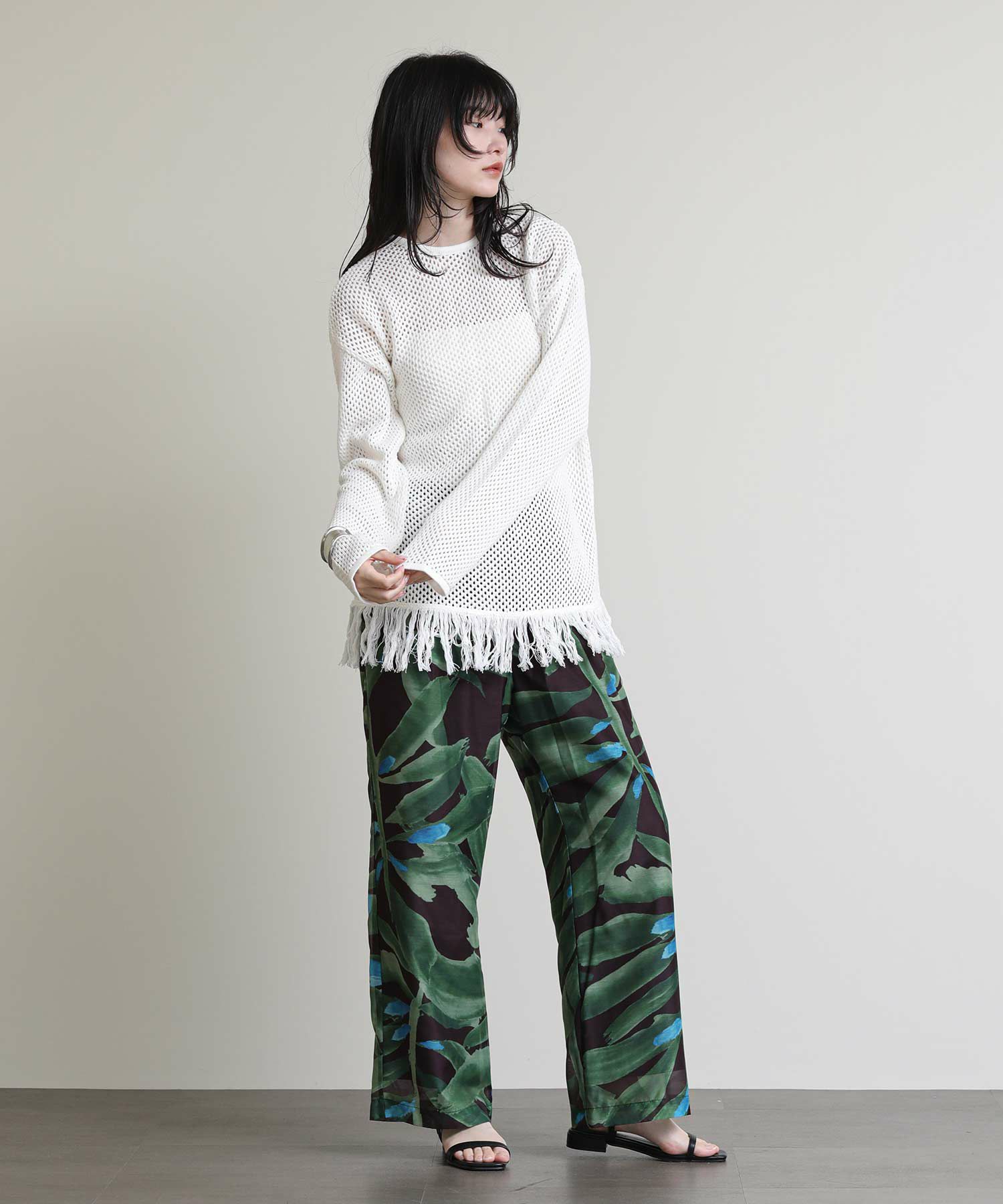 裾にフリンジがあしらわれたメッシュ編みのカーディガン。