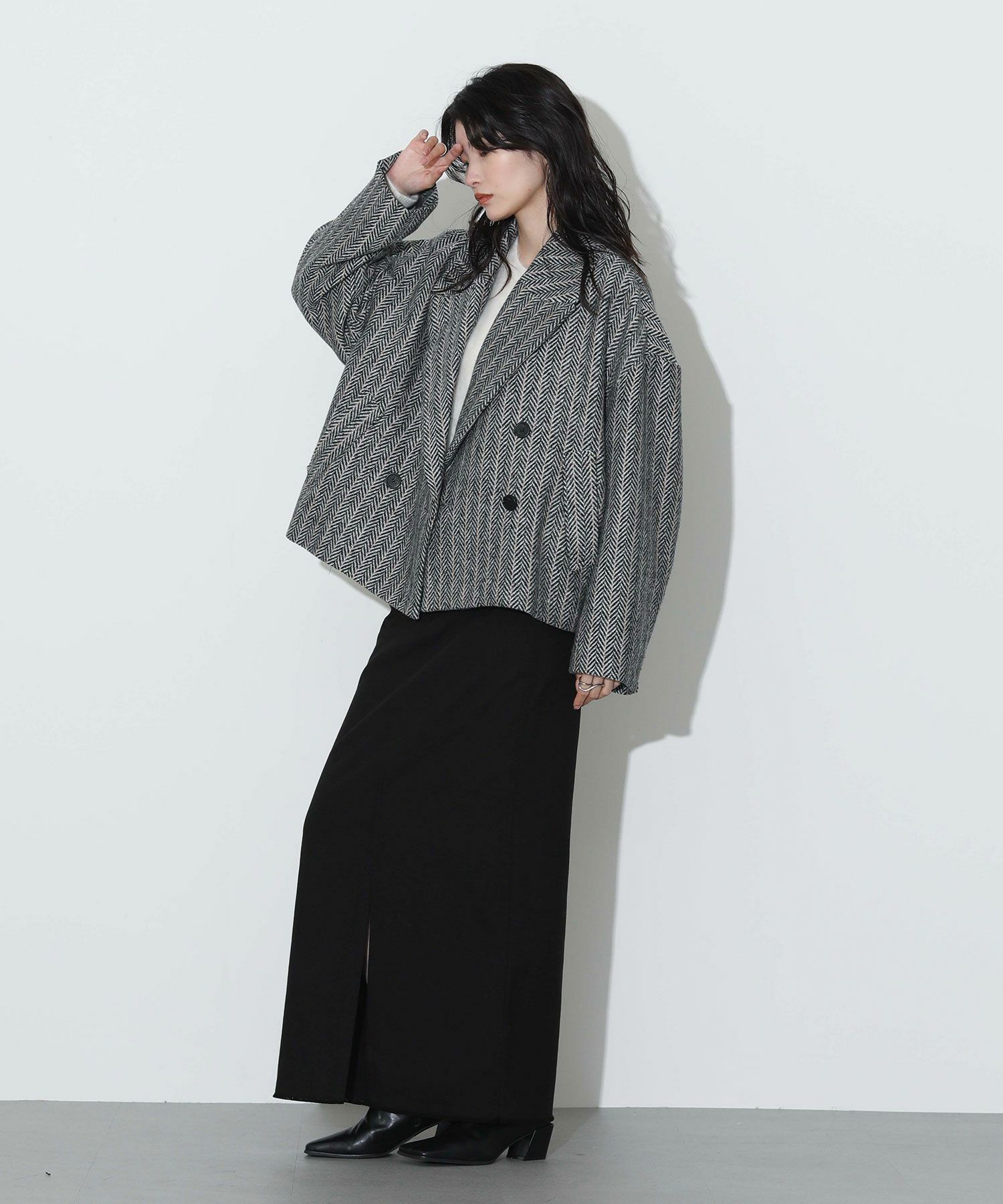 デニムのように経年変化を楽しめる加工感のある生地を使用。ハイウエストはスタイルアップを叶え、ラインを拾わないタイトなシルエットが女性らしい◎前のスリットで足捌きもよく、脚が綺麗に見えるスリットの深さで設定しています。これからのシーズンはブーツと合わせて着用するとバランスが◎