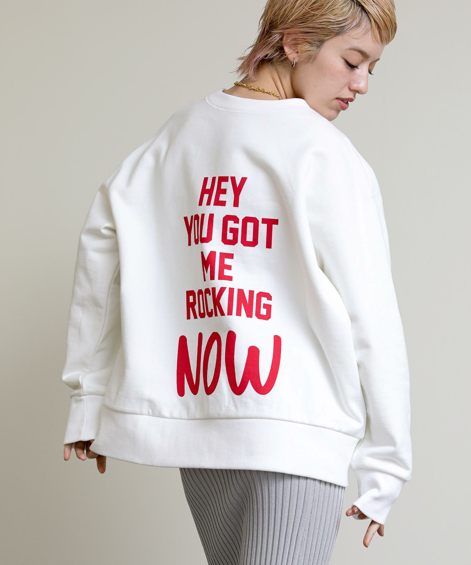 ロックテイストが可愛いビックロゴと、衿ぐりのさりげないロゴの2パターンを気分に合わせて使い分けできるデザインに。国産の裏毛スウェットを使用したゆったりとしたサイジングは、着心地抜群です。赤が映えるおしゃれなオフホワイトと、ニュアンスカラーが美しいラベンダーの2色ご用意いたしました。