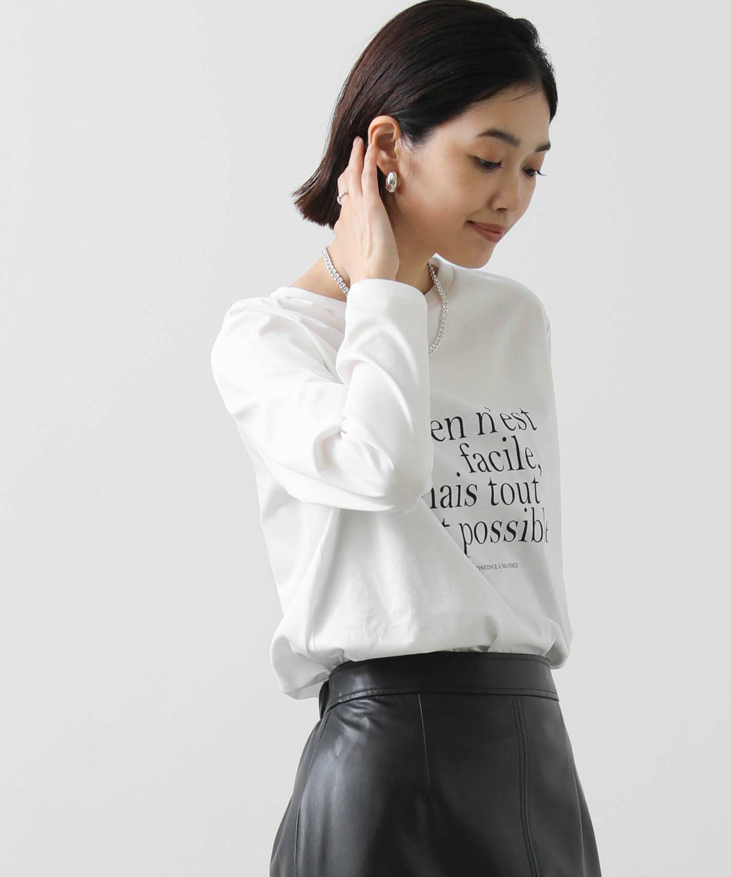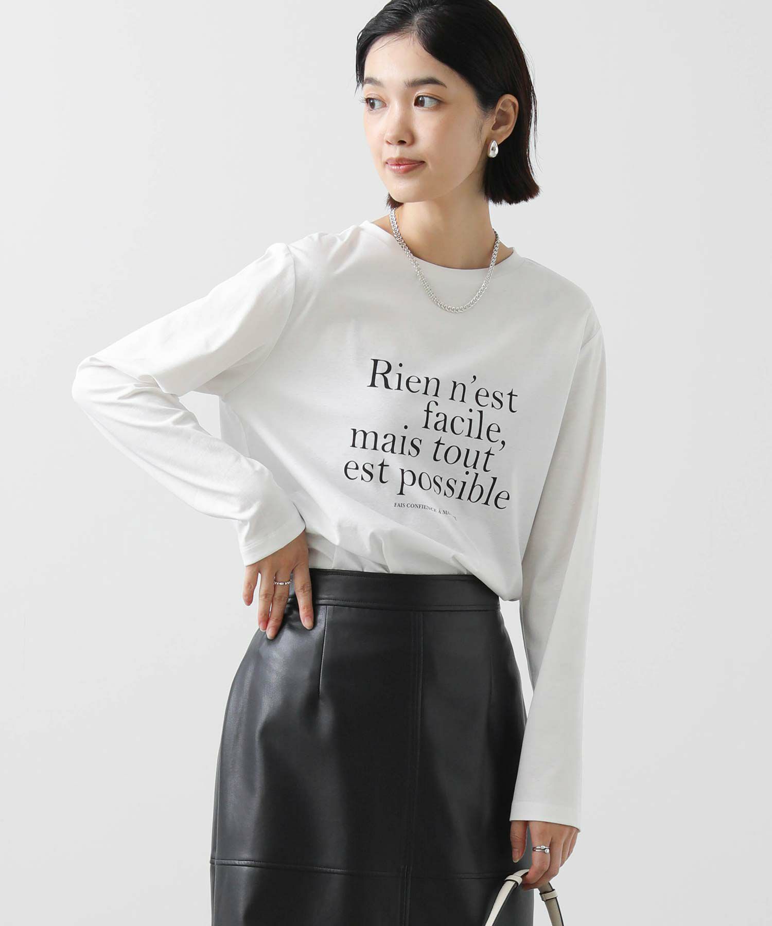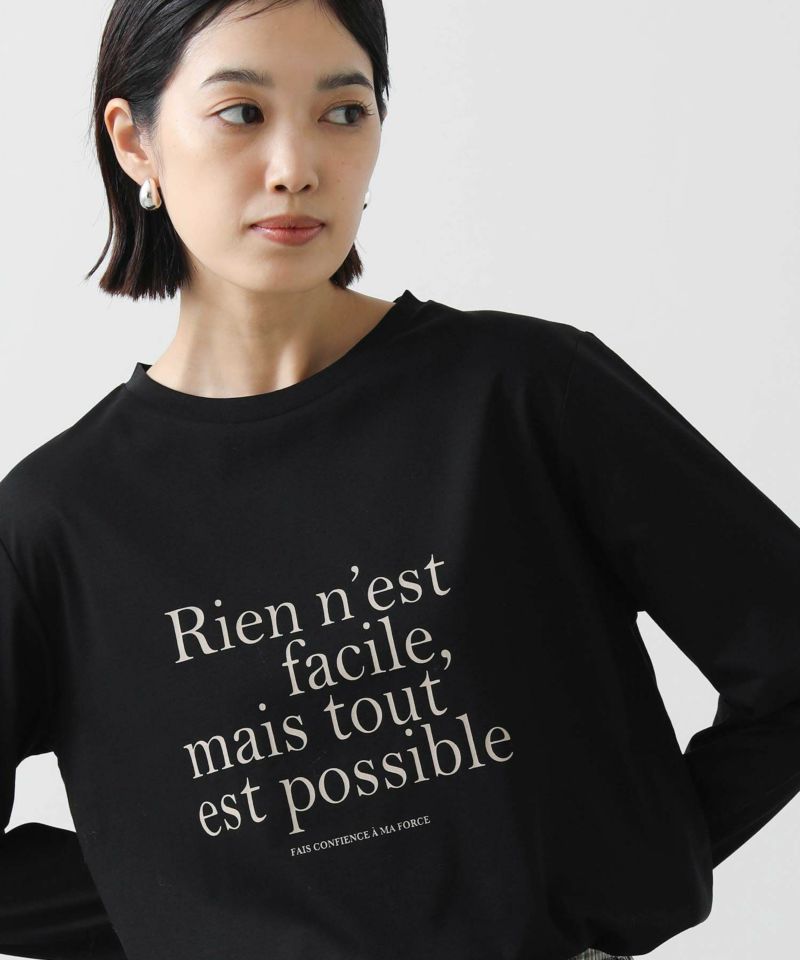 クセのない大人見えするバランスで仏語ロゴをプリントし、秋にしっくりくる一着。