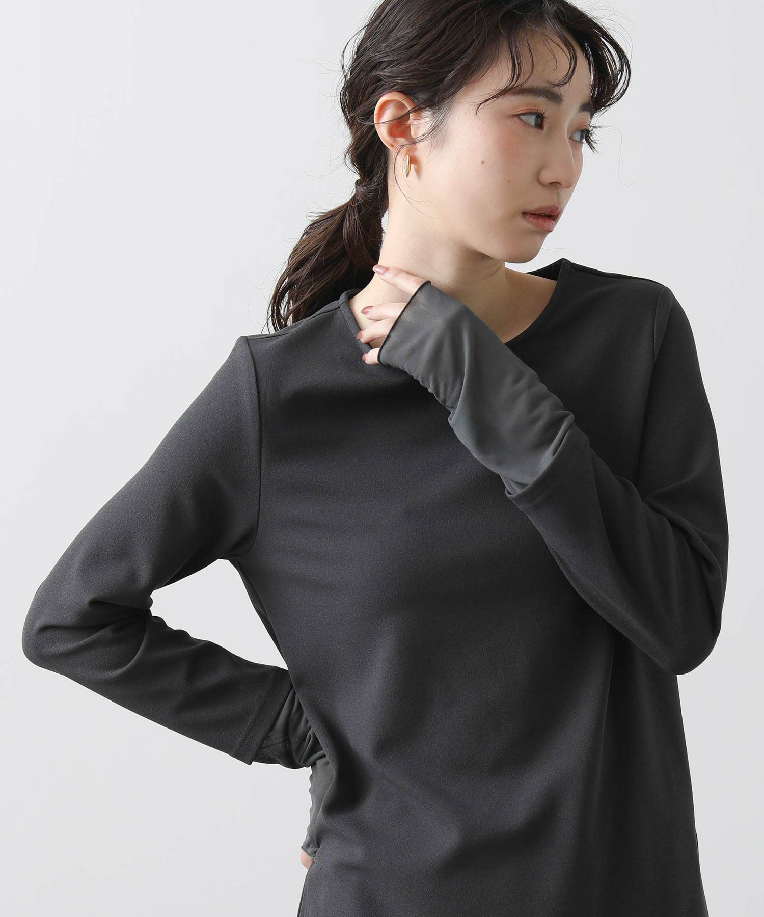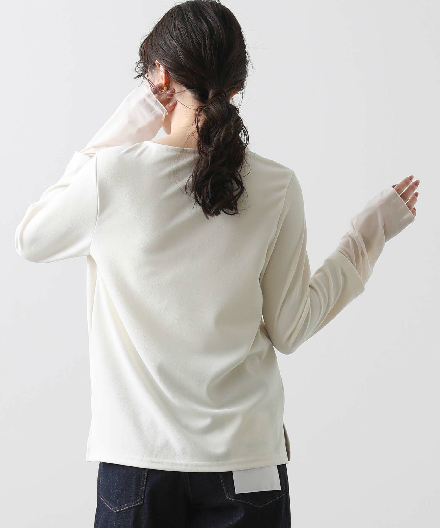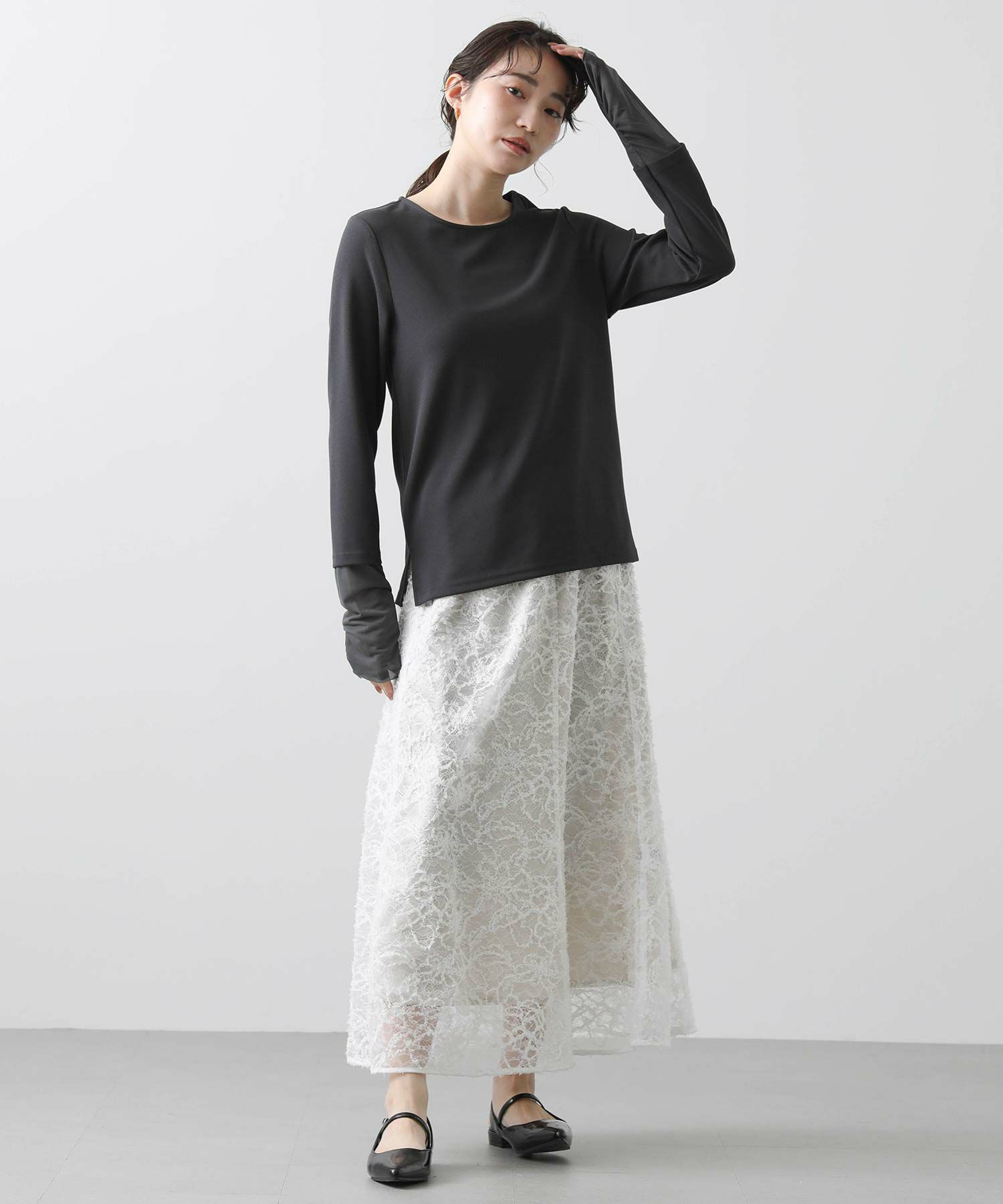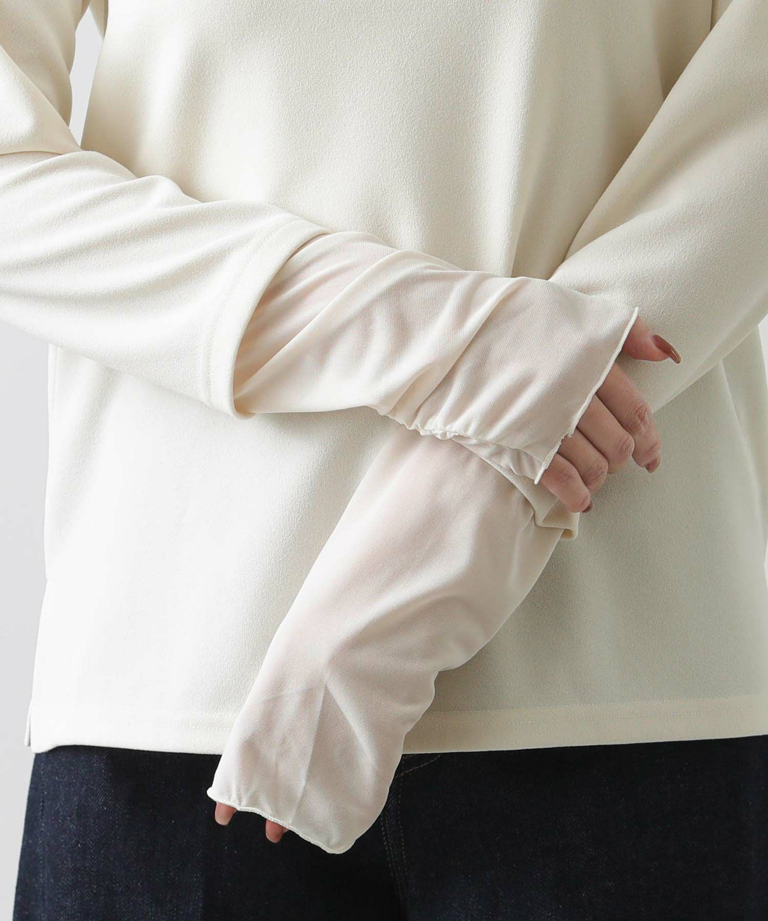 肌寒い季節のレイヤードアイテムとして、季節が進めば1枚着としてもお使い頂けます。程よい厚みのカットジョーゼット素材なので身体のラインを拾いにくく、肌離れも良いのが特徴です。