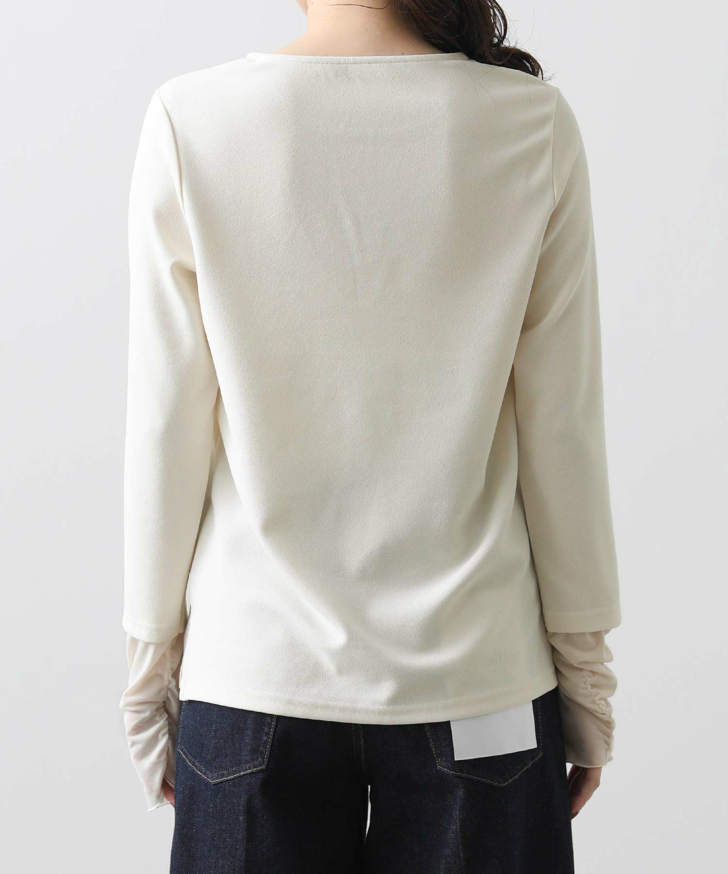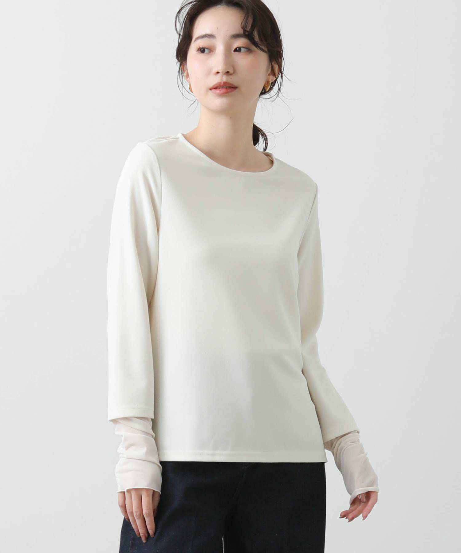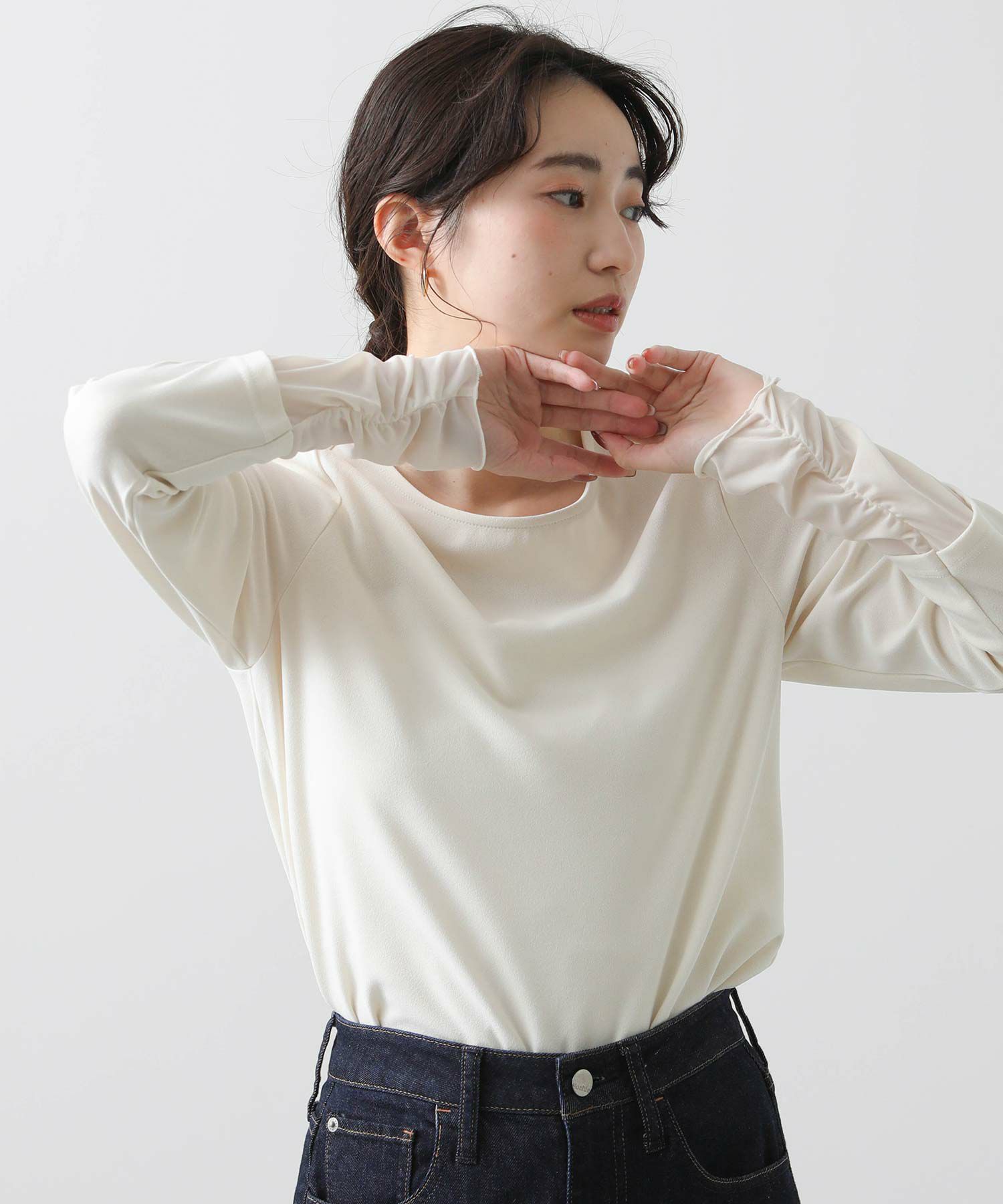 ジョーゼットの軽い素材感でロングシーズン着られる1枚。袖口をシアー素材で切り替えたデザインがポイントです。