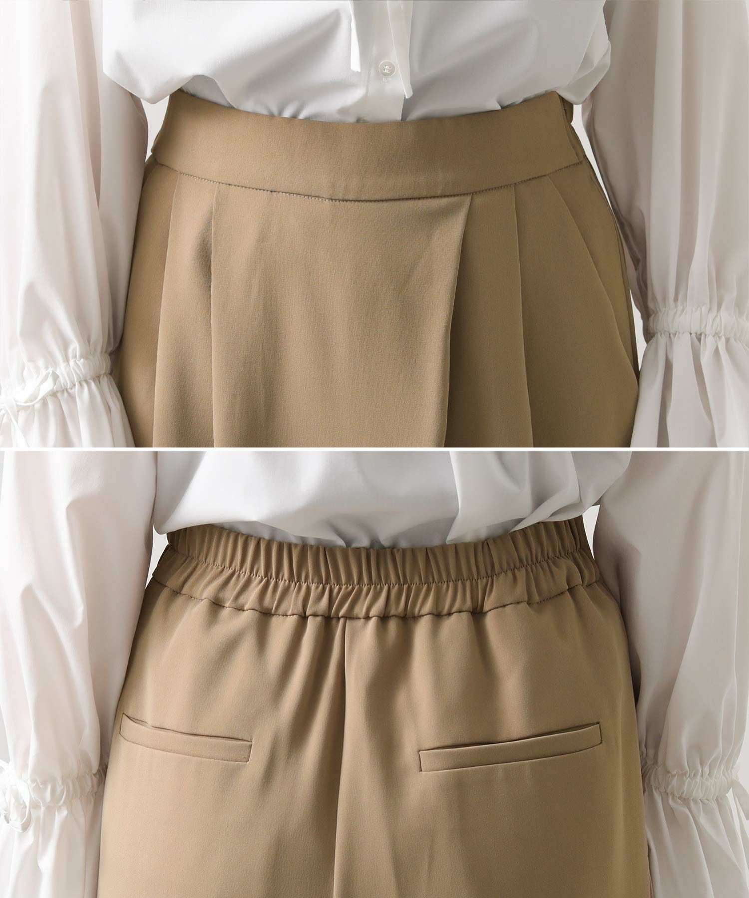 アシメのタックデザインが腰回りをカバーしてくれます。ふくらみととろみのある生地感で、シワになりにくくオンオフ問わずに穿きやすい素材。