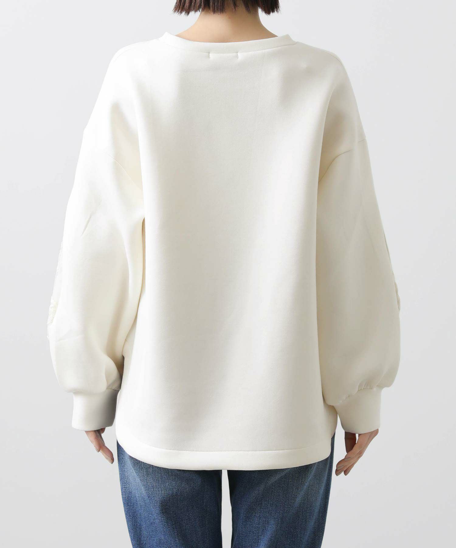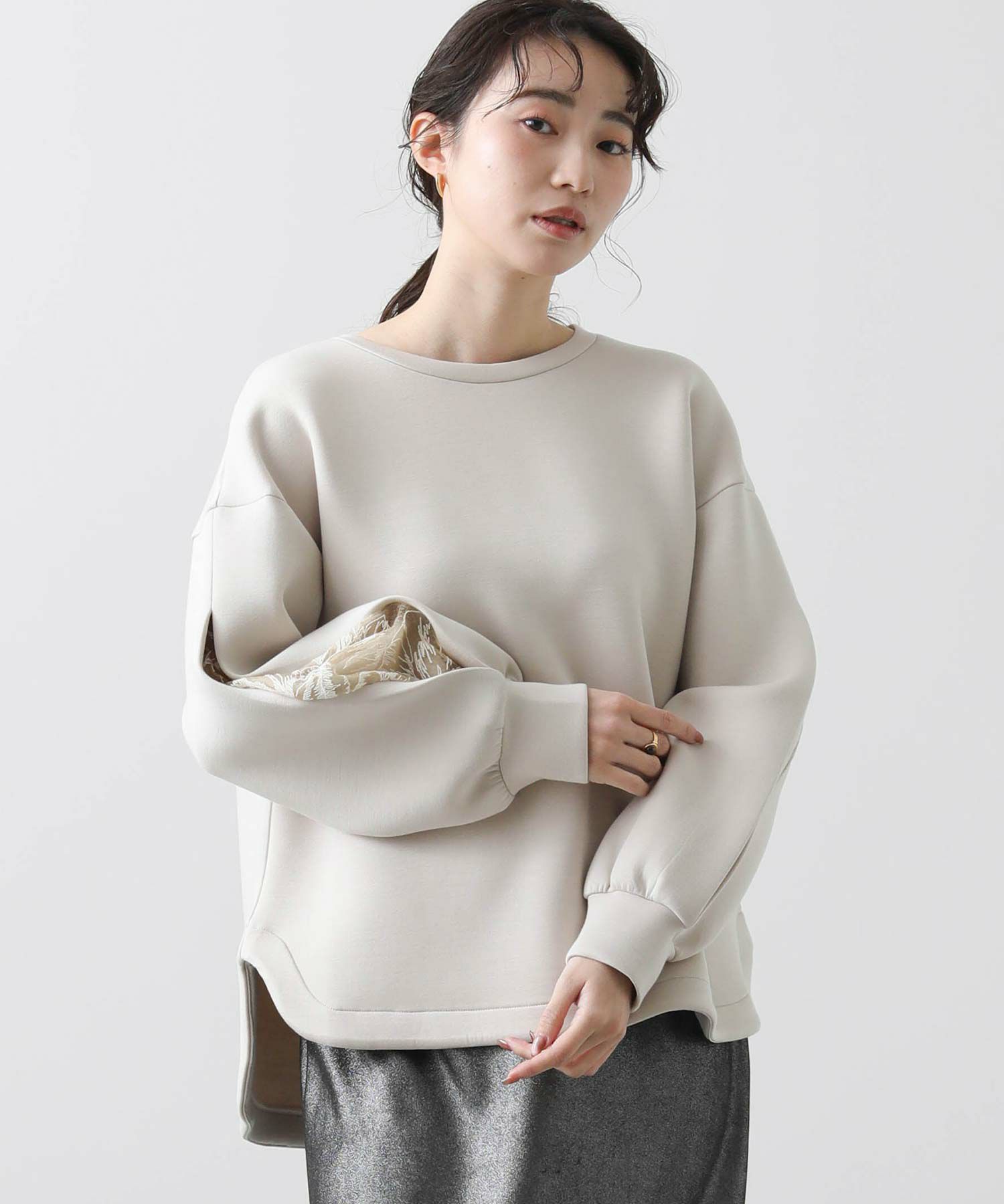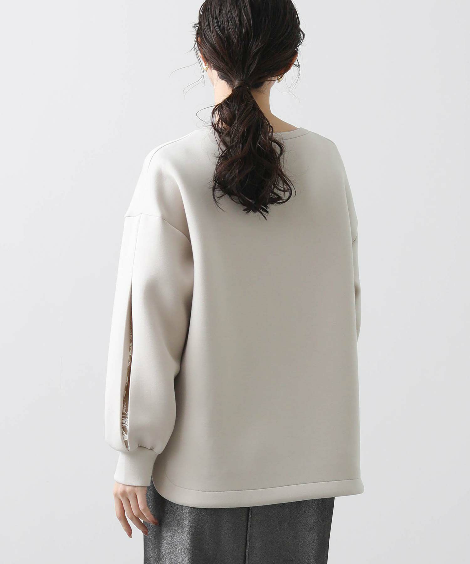 お袖をたくし上げるとタックが開き、レースとオーガンジーが覗き一気に華やかな印象に。さり気ない異素材使いが上品な1枚です。