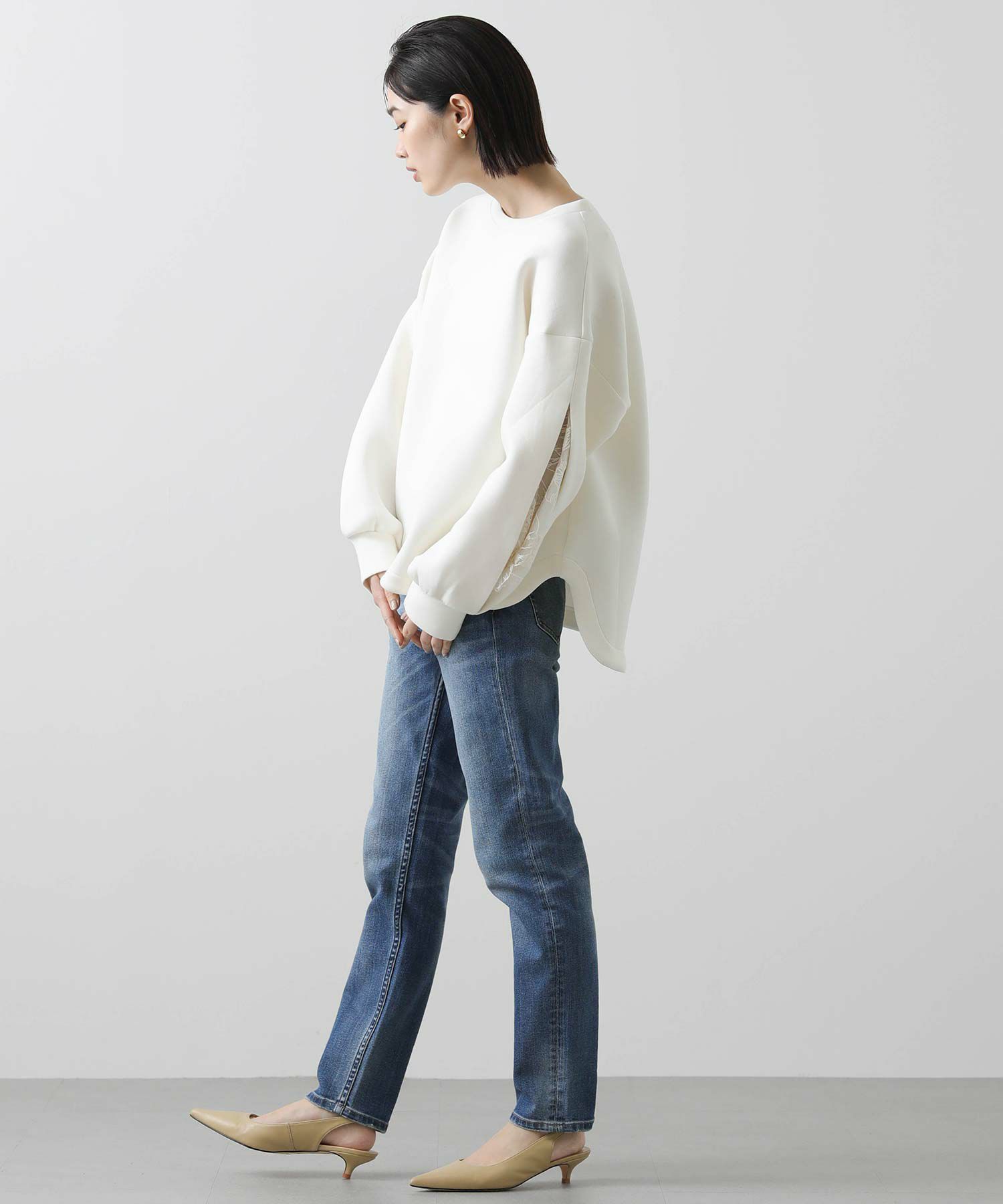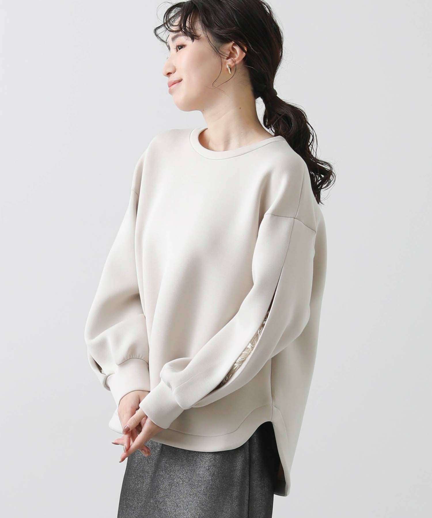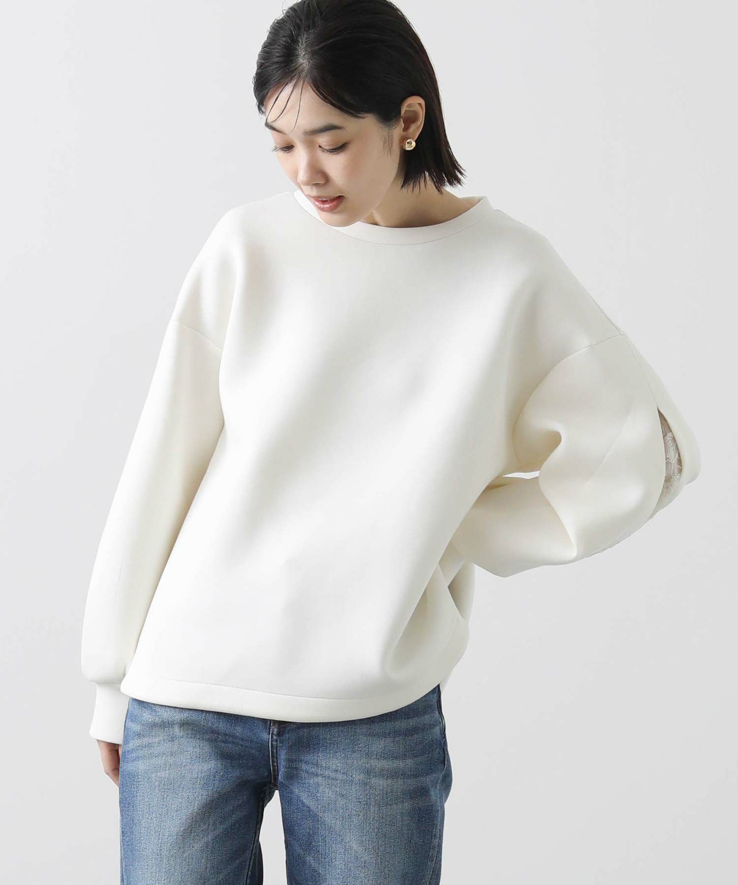 お袖をたくし上げるとタックが開き、レースとオーガンジーが覗き一気に華やかな印象に。さり気ない異素材使いが上品な1枚です。