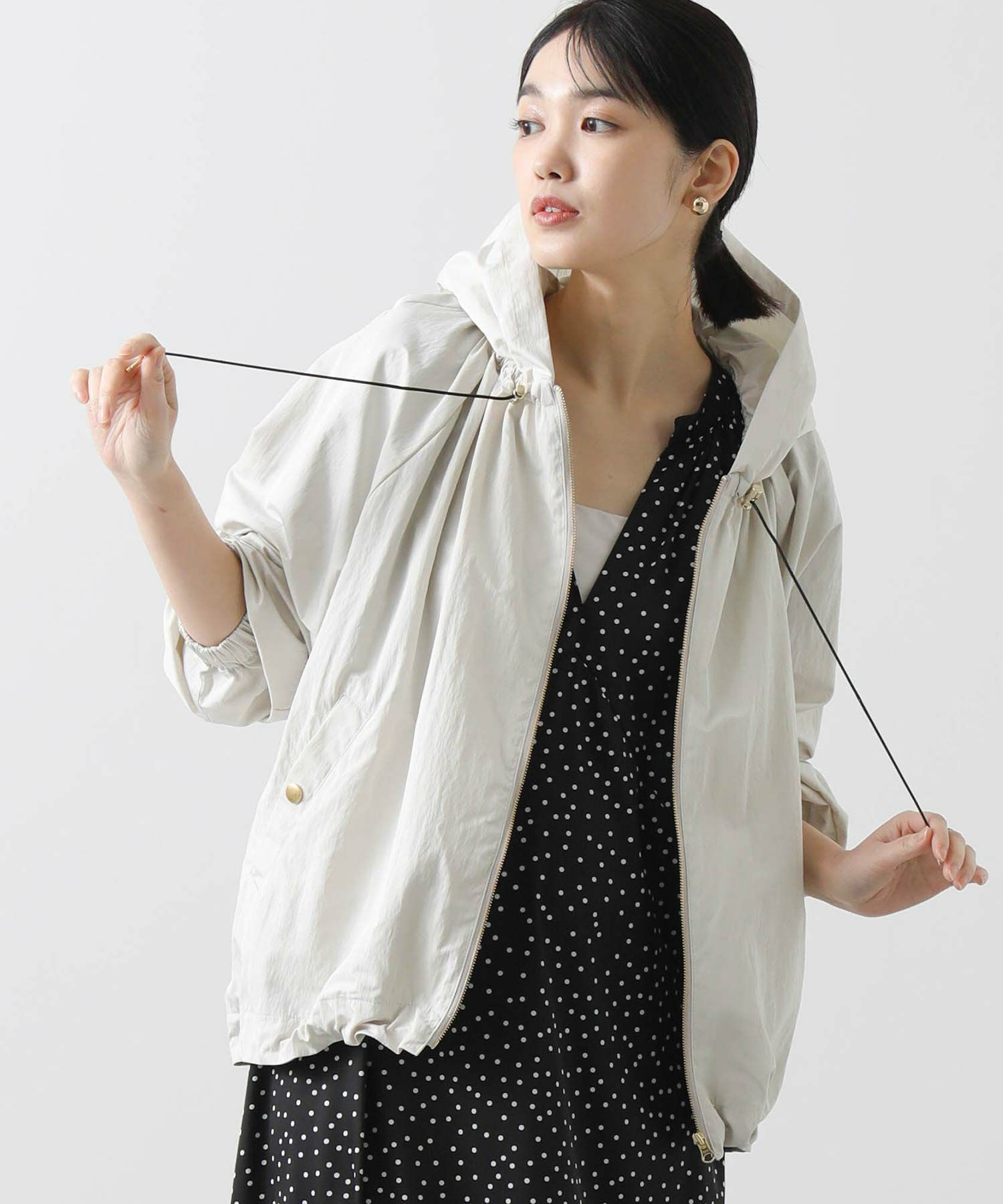 ギャザ-たっぷりの丸みのあるフォルムがかわいく、裾のドロストコードを絞ることで、ころんとしたシルエットに。