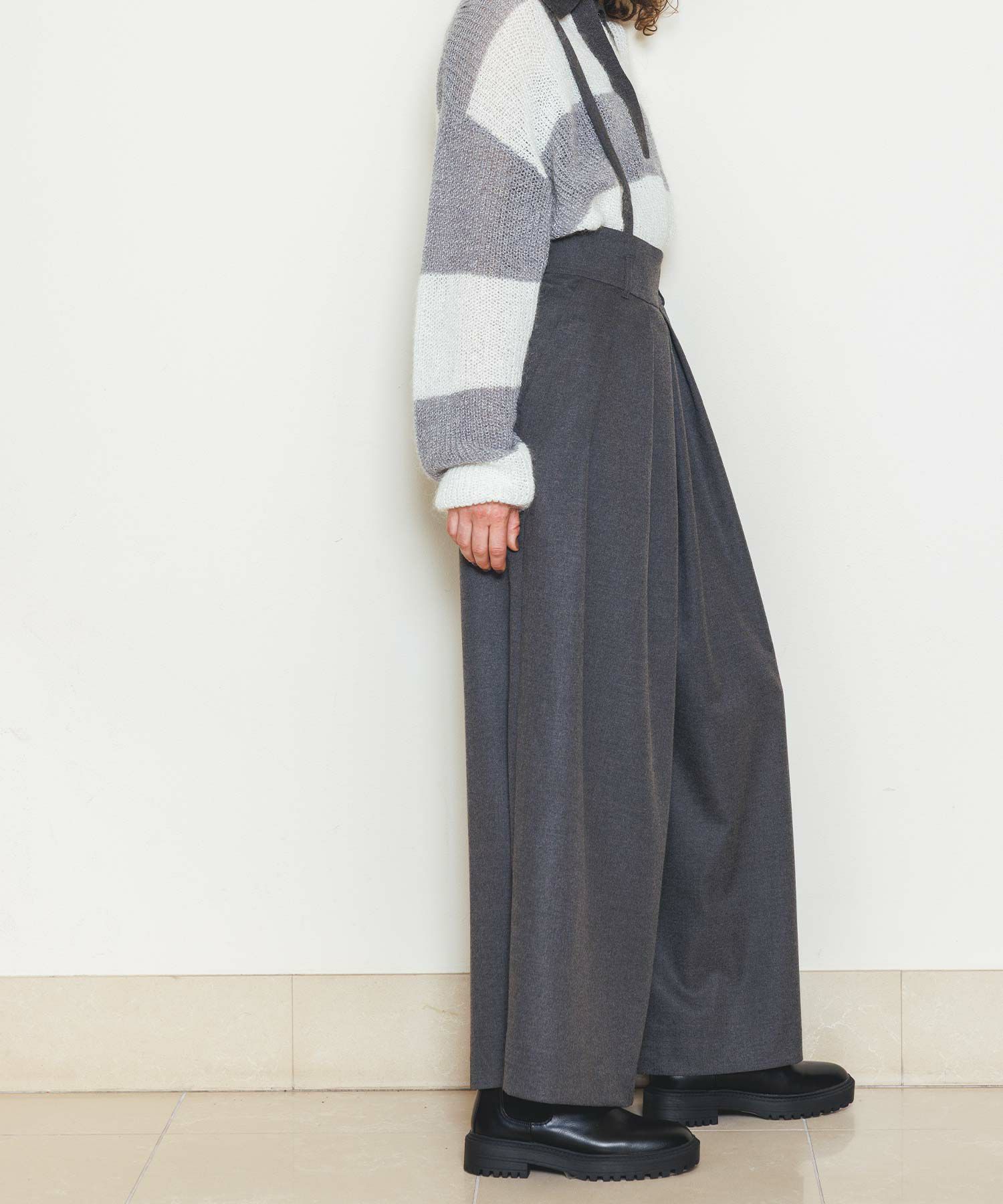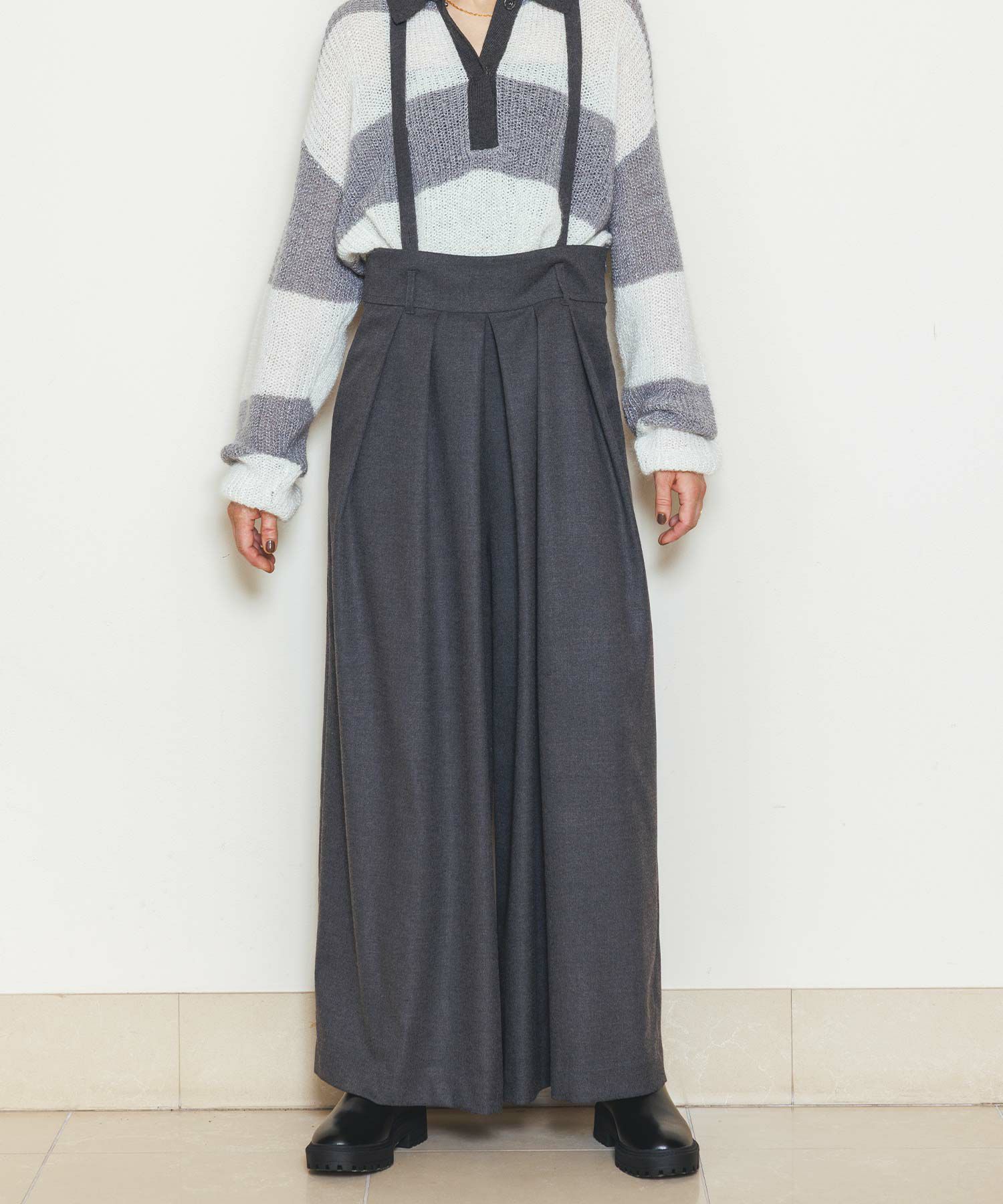 ウエストは大きめでベルト仕様になっており、フロントのたっぷり入ったタックがハの字に広がり、共布の肩ひもベルトで吊って着用するアイテムです。