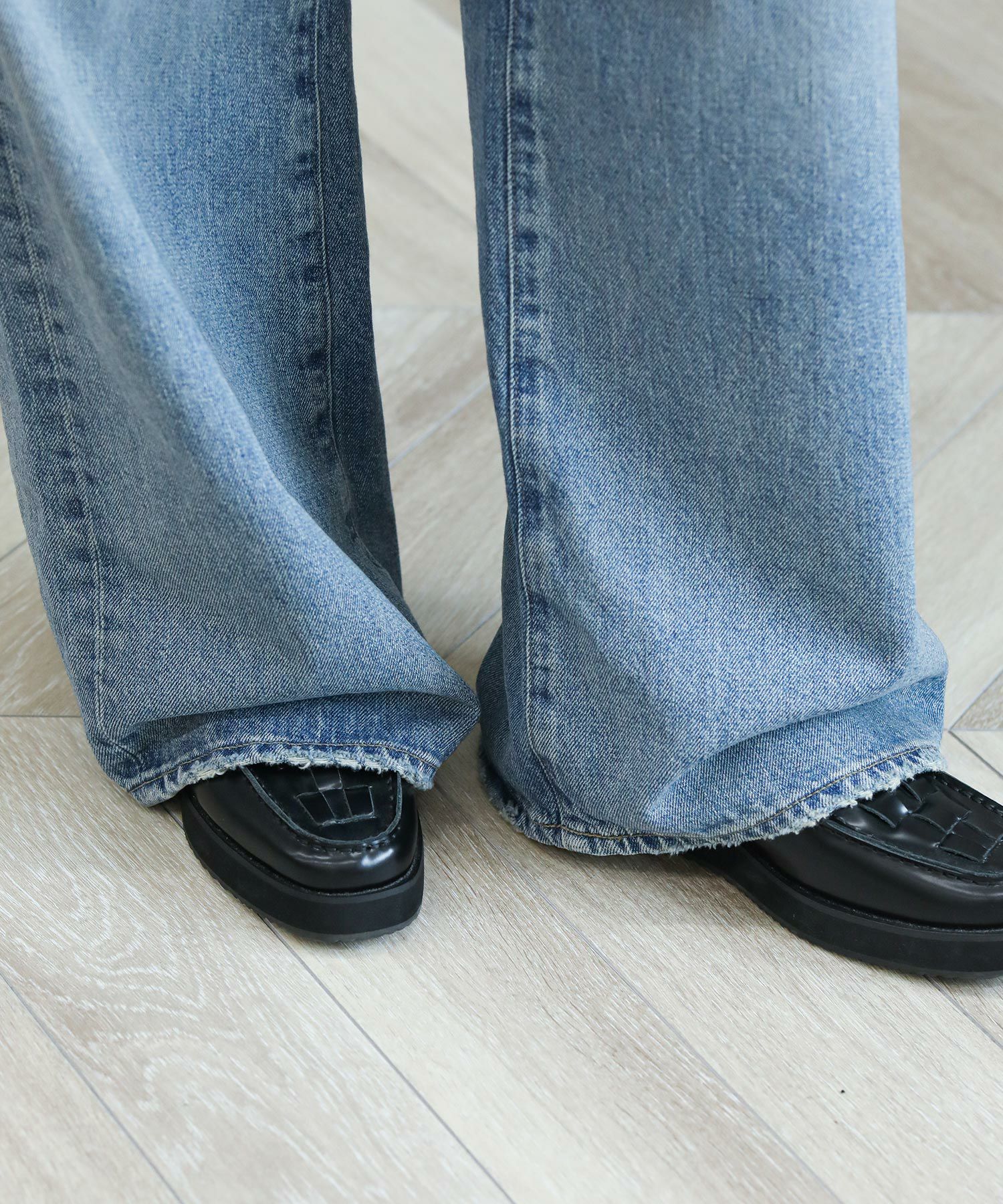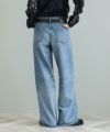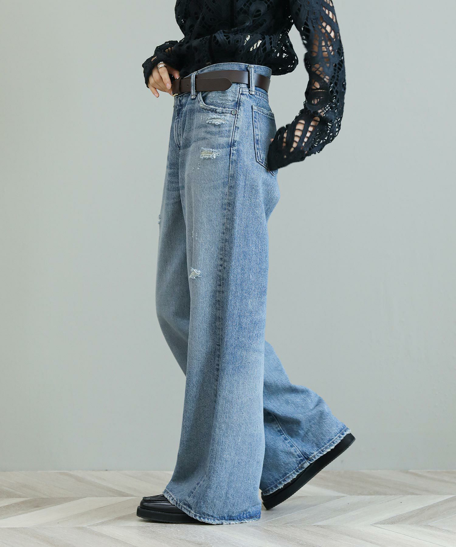 The rejoiceの別注デザインです。ヴィンテージライクな風合いやダメージのバランスに拘っています。ヒップにかけてコンパクトな設計になっている為、ワイドながらルーズさはなく上品なシルエットが特徴。さりげないダメージ感がどんなアイテムにもマッチし飽きないデザイン。今のムードにぴったりのローライズもポイントです。