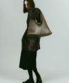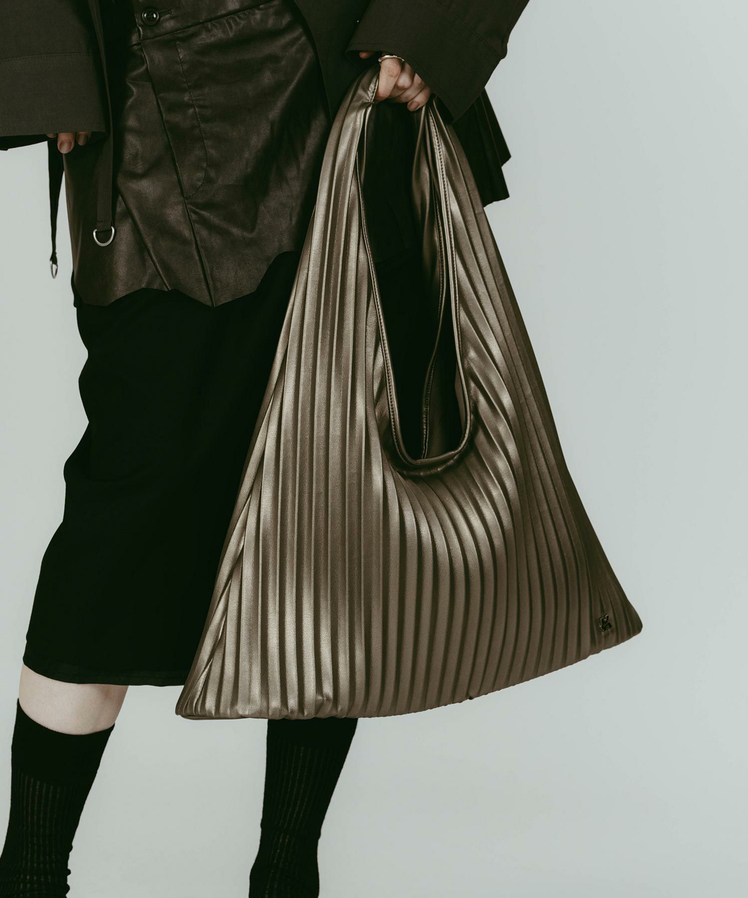 収納力を目的としたサイズ感でありながら、その存在感は実用にとどまらず、スタイリングの一部として機能するボリューム感。直線と曲線が交差するプリーツ構造が、持つたびに表情を変えます。装飾はあえてシンプルに、Kモチーフとキーリングのみで、幅広いスタイルに合わせやすいのも魅力です。自立するよう底部分は硬く仕上げているので、通勤、通学、デイリー使い、幅広いシーンで着用できます。