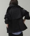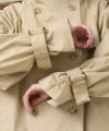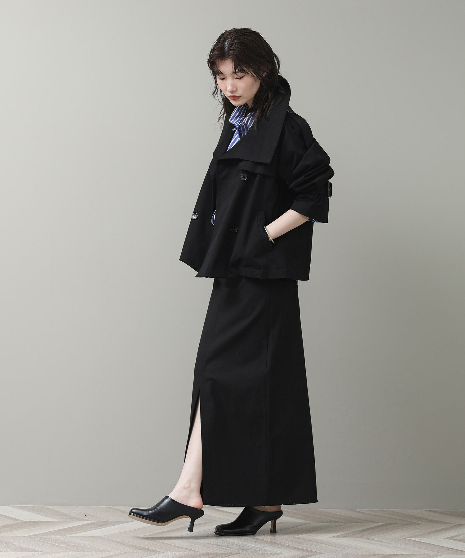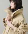 衿を立てて顔を覆うように着てト レンドスタイルを楽しむのはもちろん、大きな衿のように折り返しても違った表情で機ていただけます。袖巾は大きめに設定にしているので、袖口のベルトをぎゅっと絞って袖のシルエットを丸く作ると、こなれ感がでます。春の定番アイテムだからこその、小技の効いたディテールがポイント。