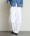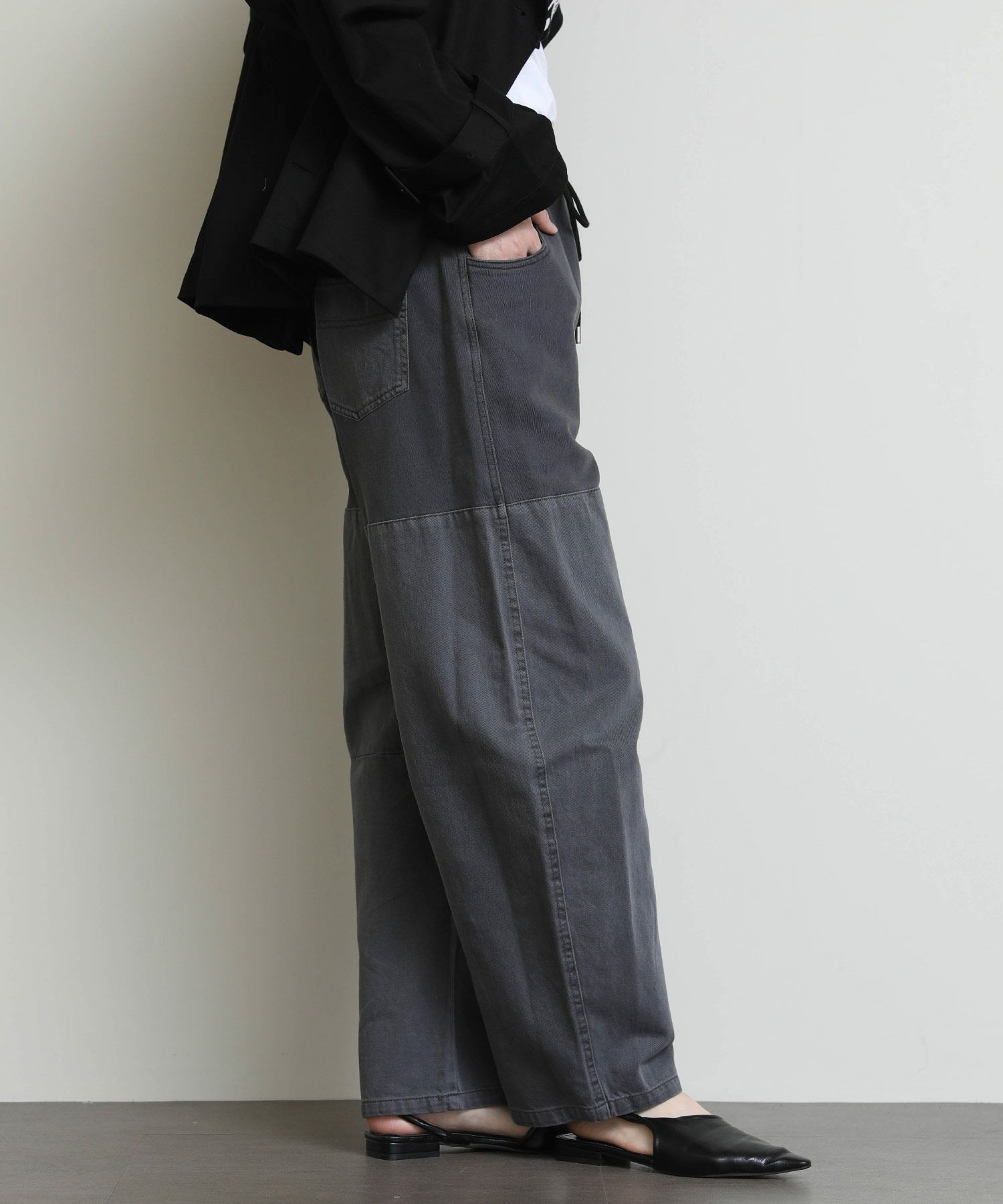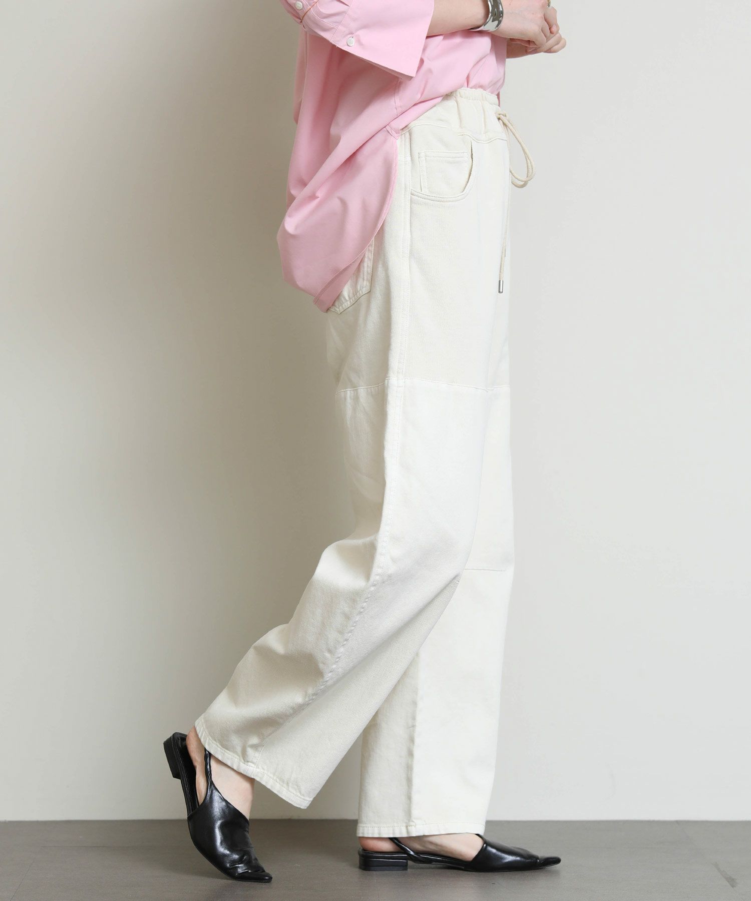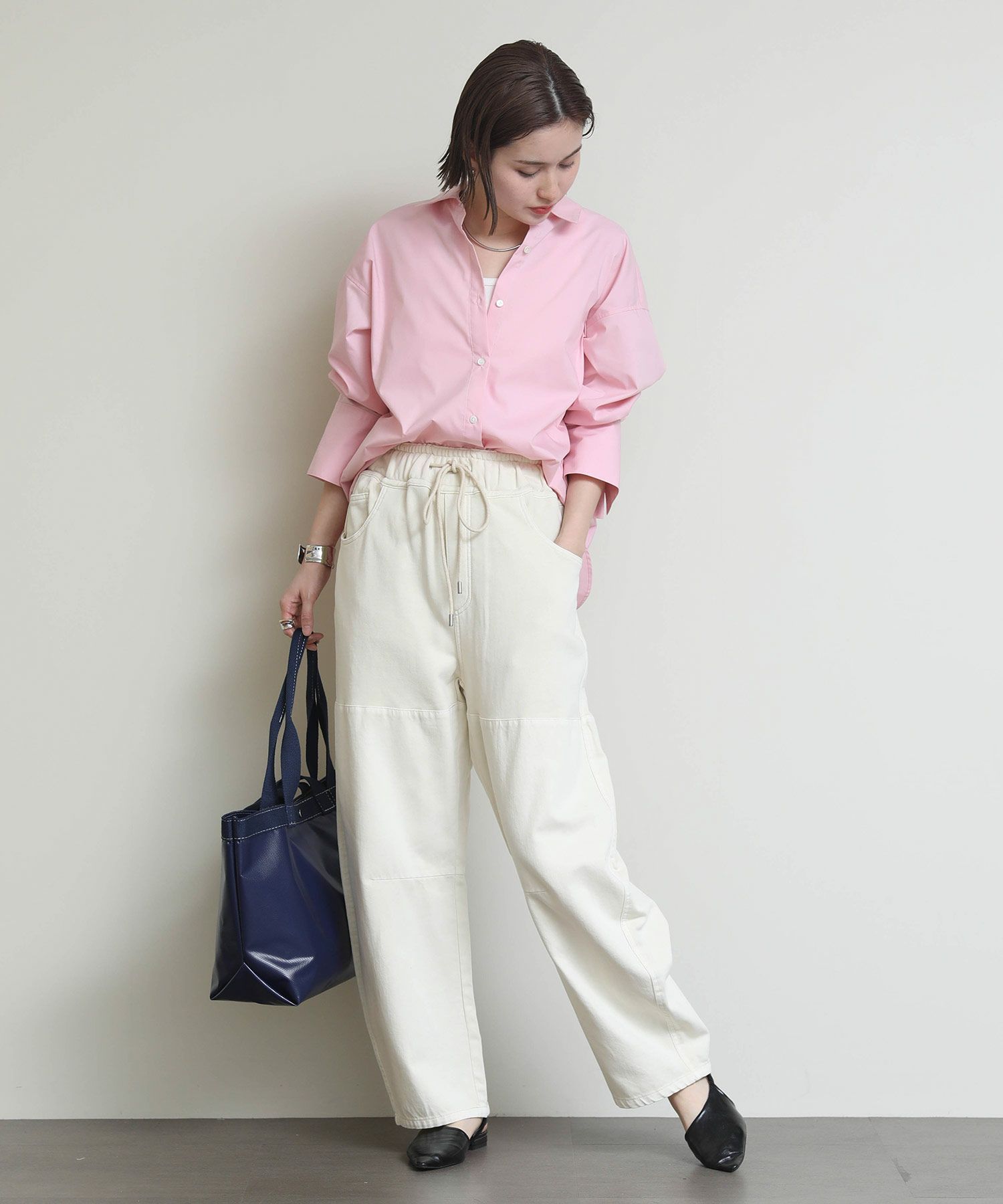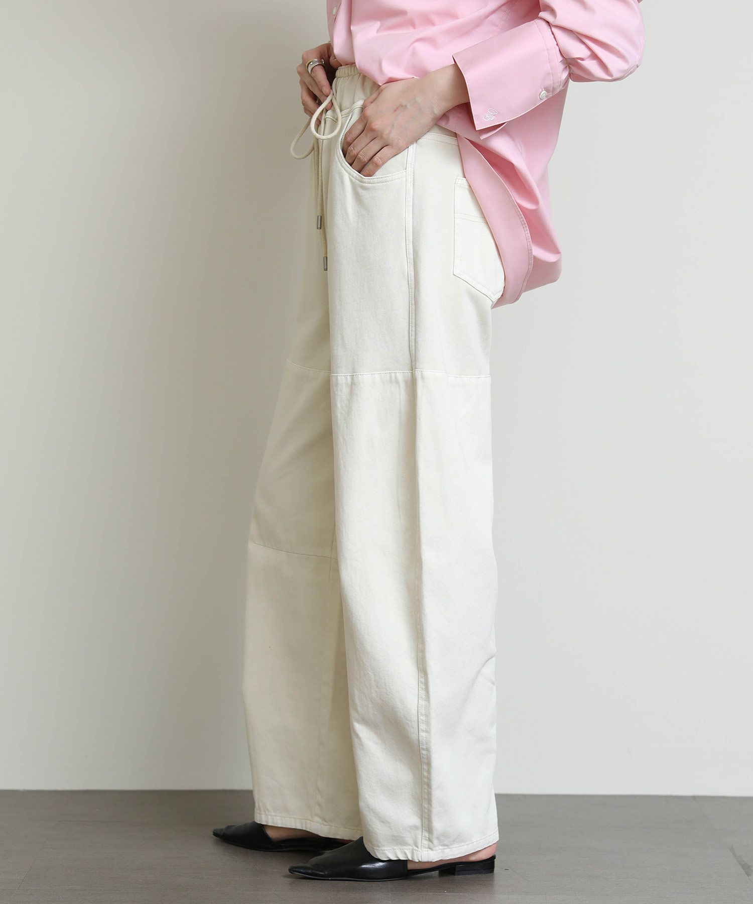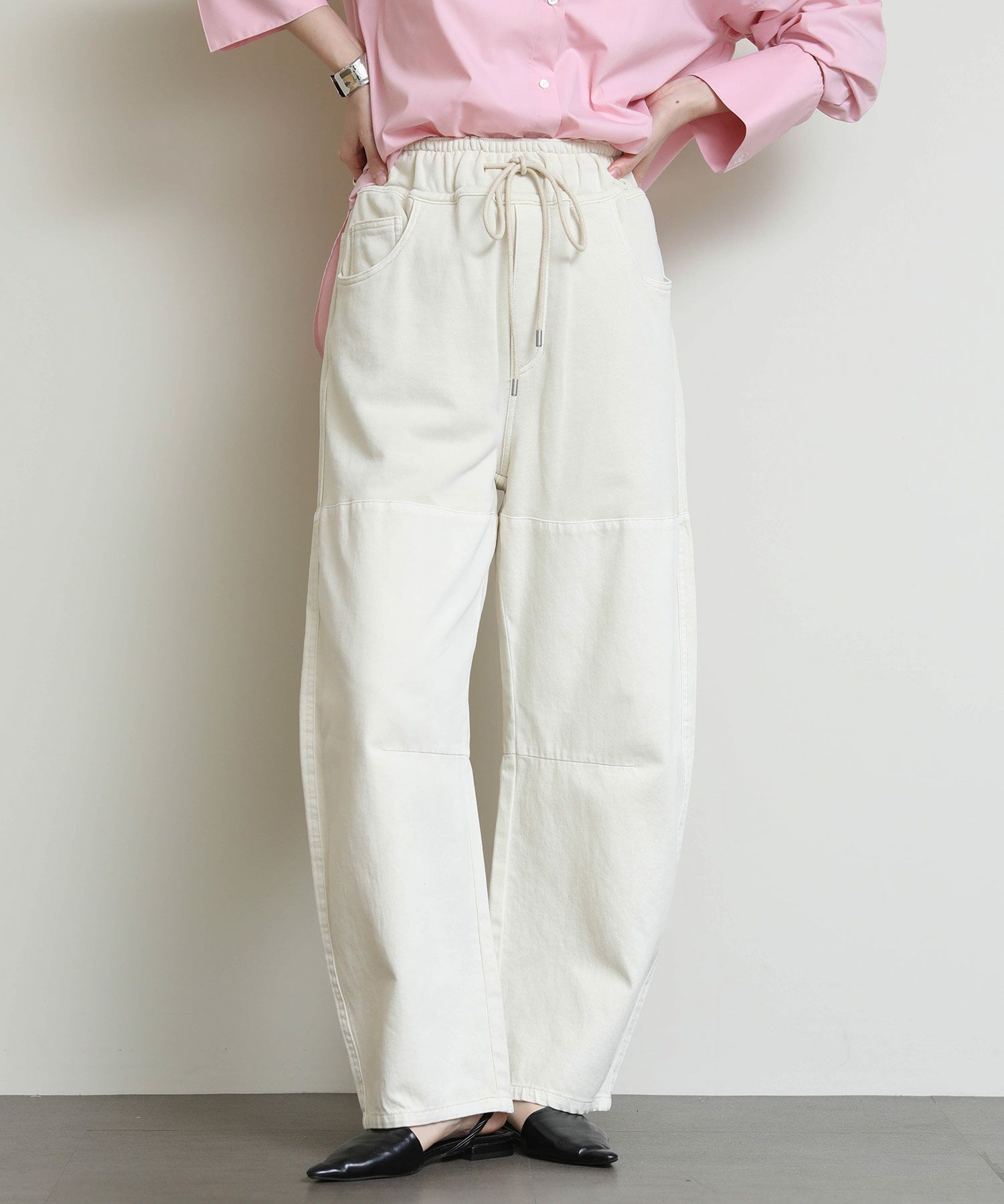 カーブ掛かった丸みのあるシルエットで脚長効果も◎ウエスト周りはゴム仕様でストレスなく着ることができ、紐で調節可能なため、ラフに着こなしていただけます。