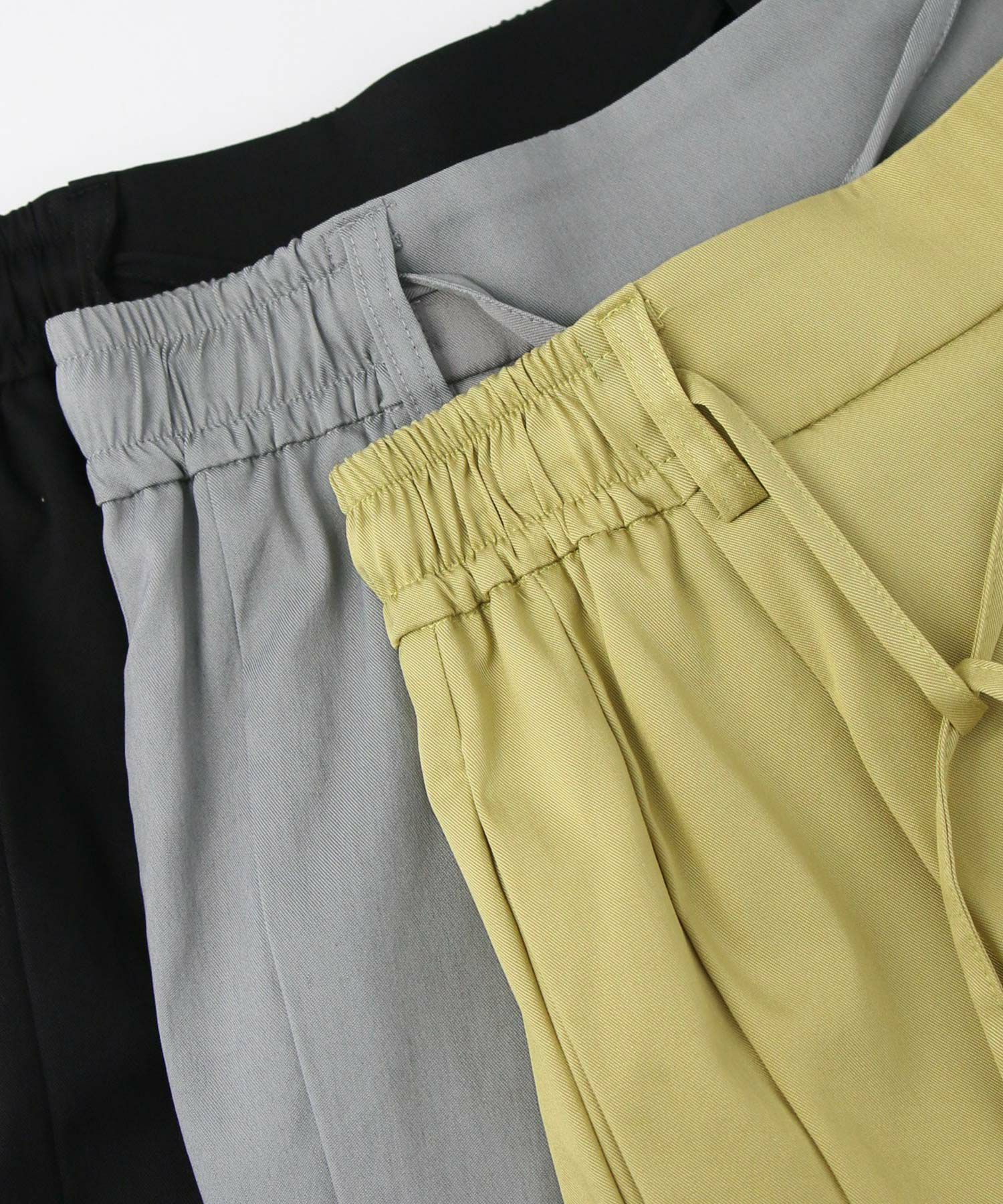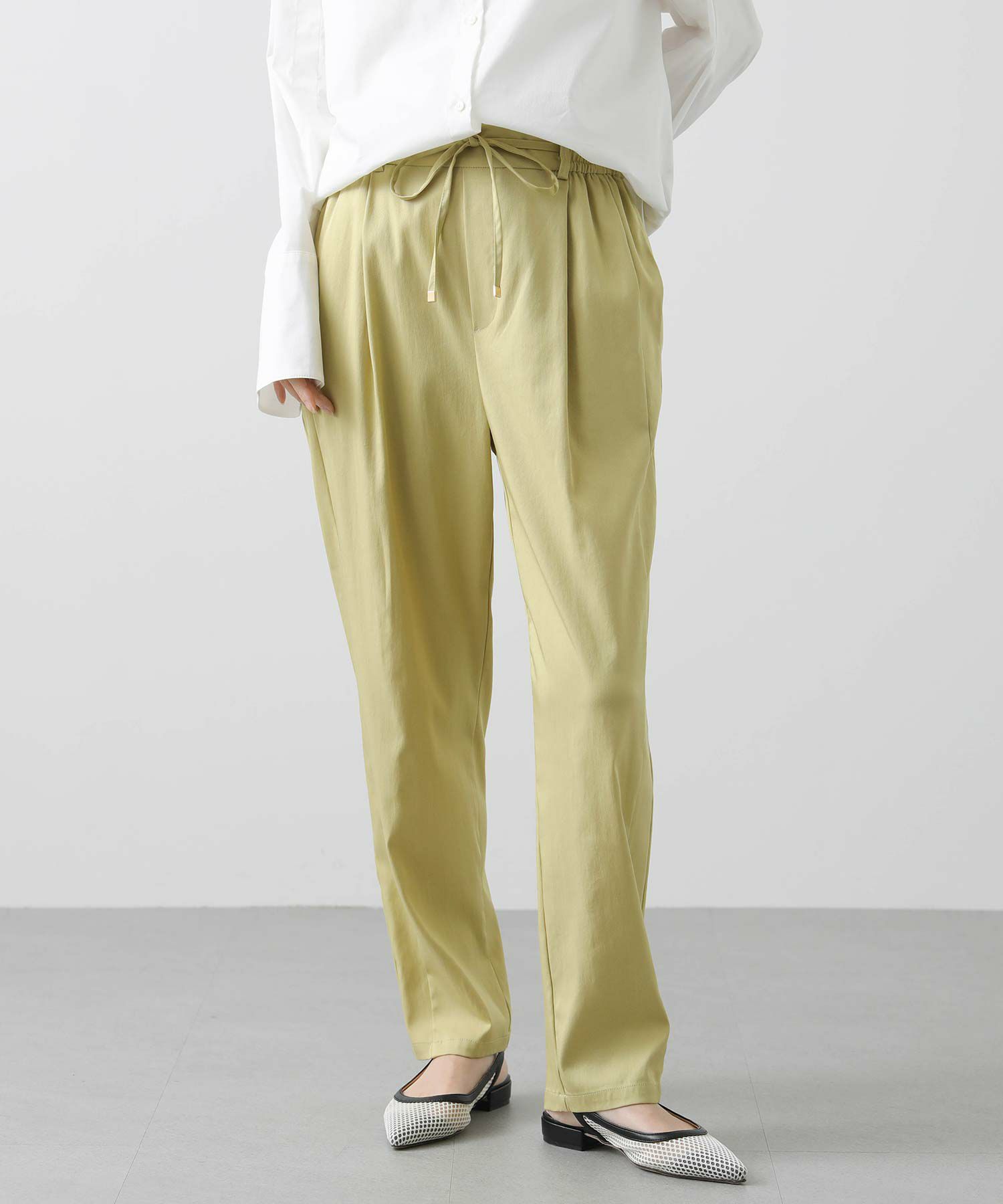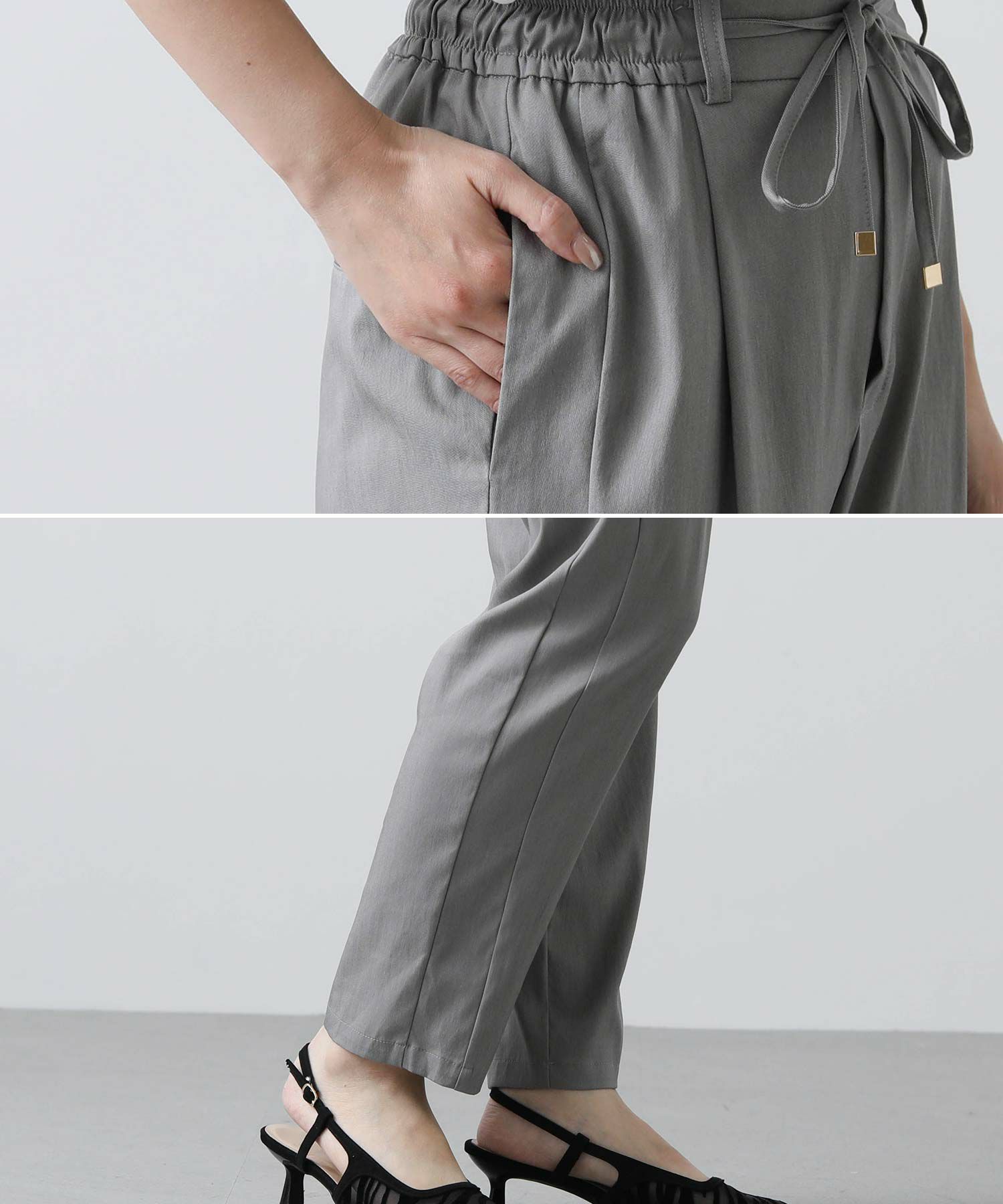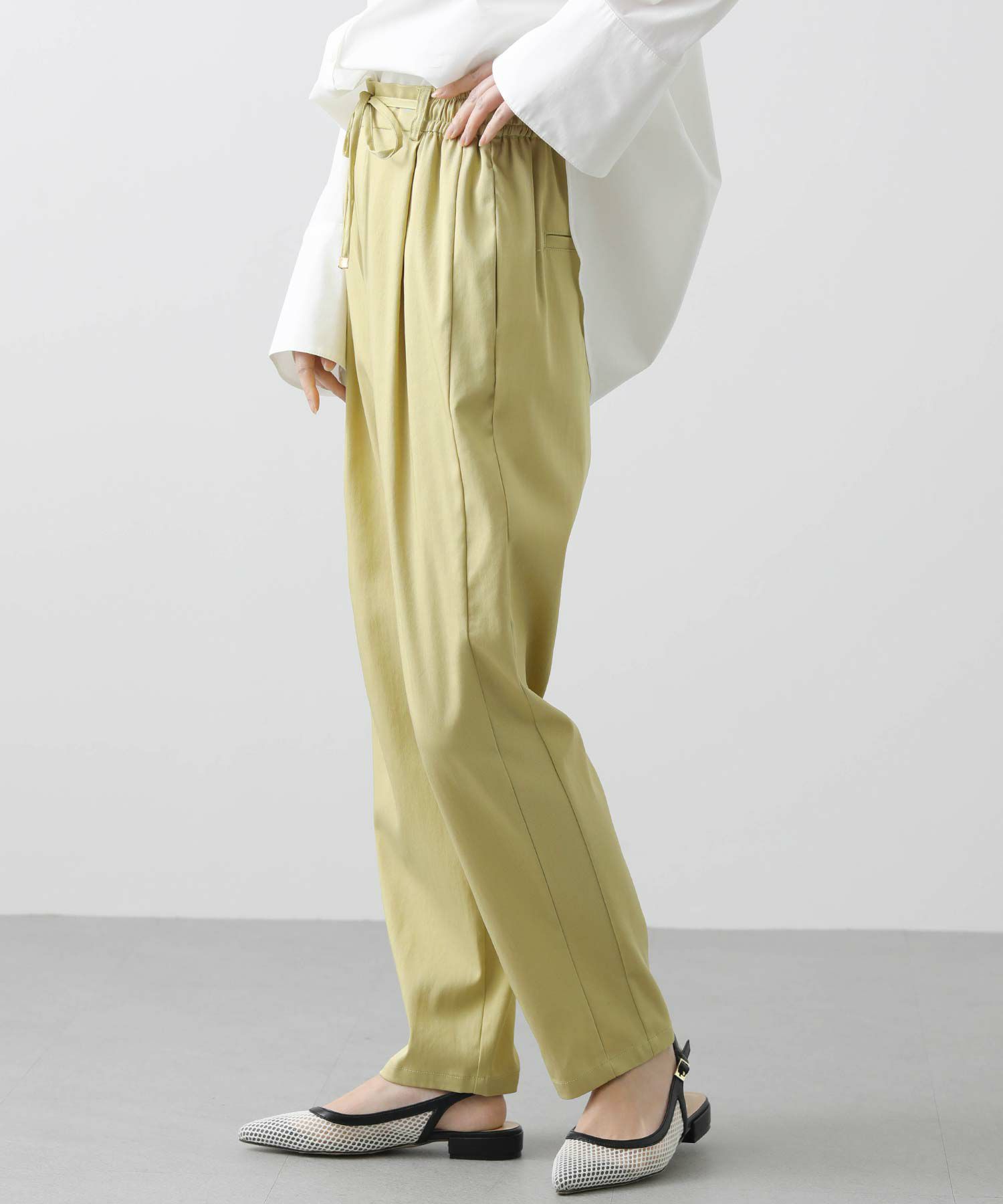 上品なツヤとコシのあるテンセル生地は、程よく落ち感があり脚のラインを拾いにくく細見え効果も抜群。両サイドに入れた切替のラインが脚をまっすぐ長く見せてくれます。