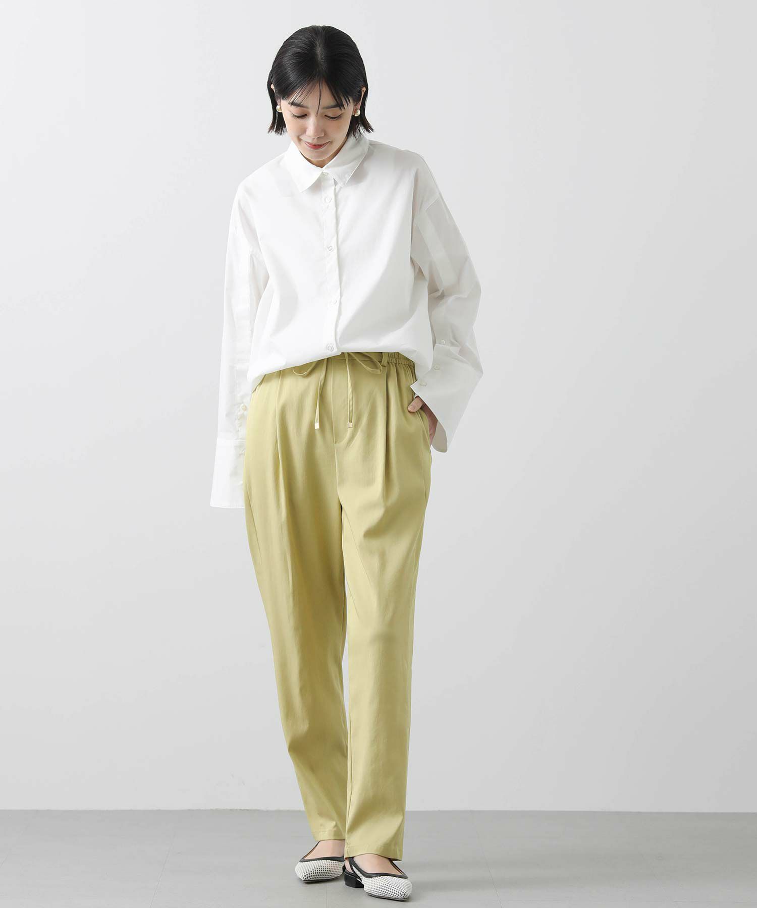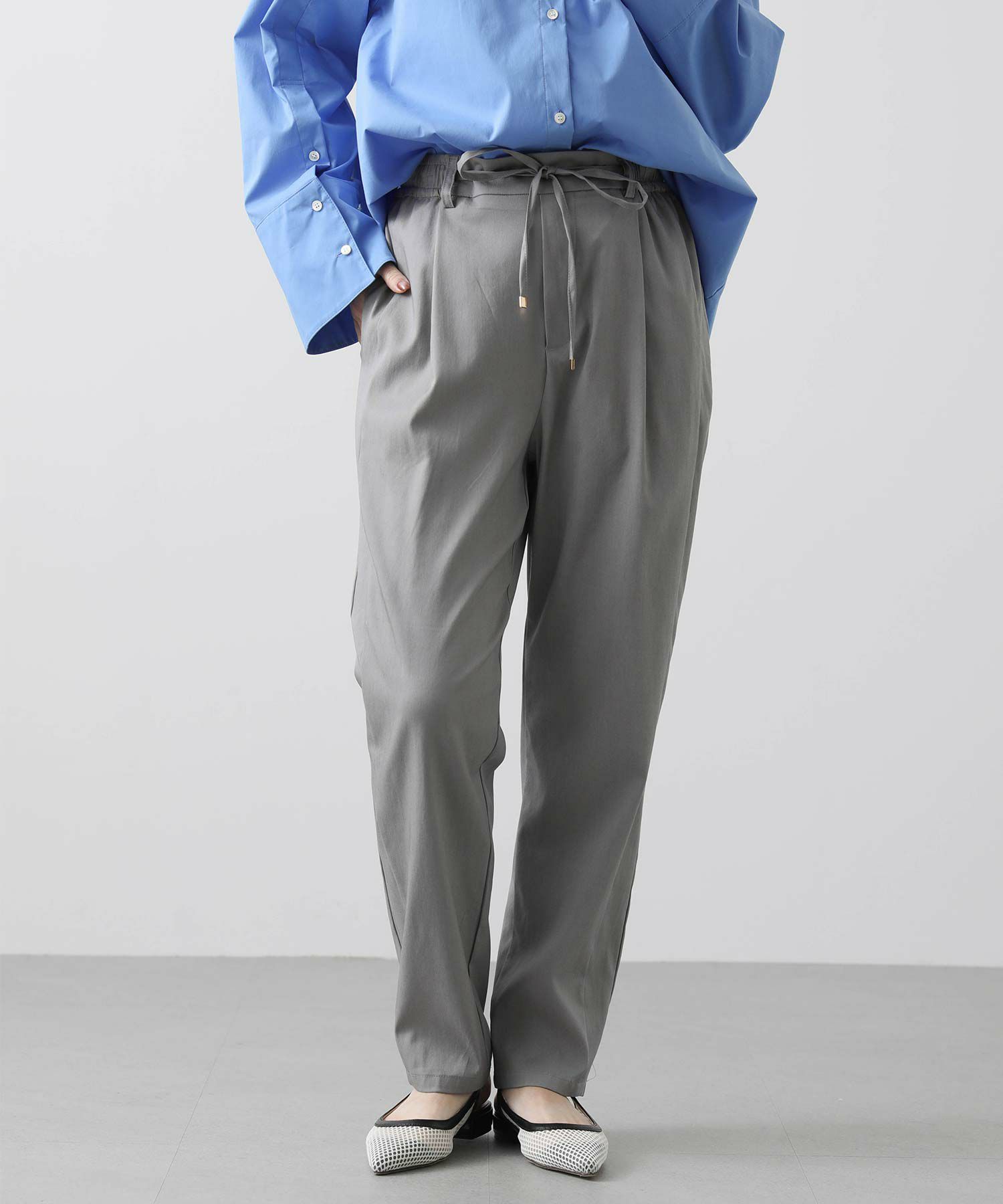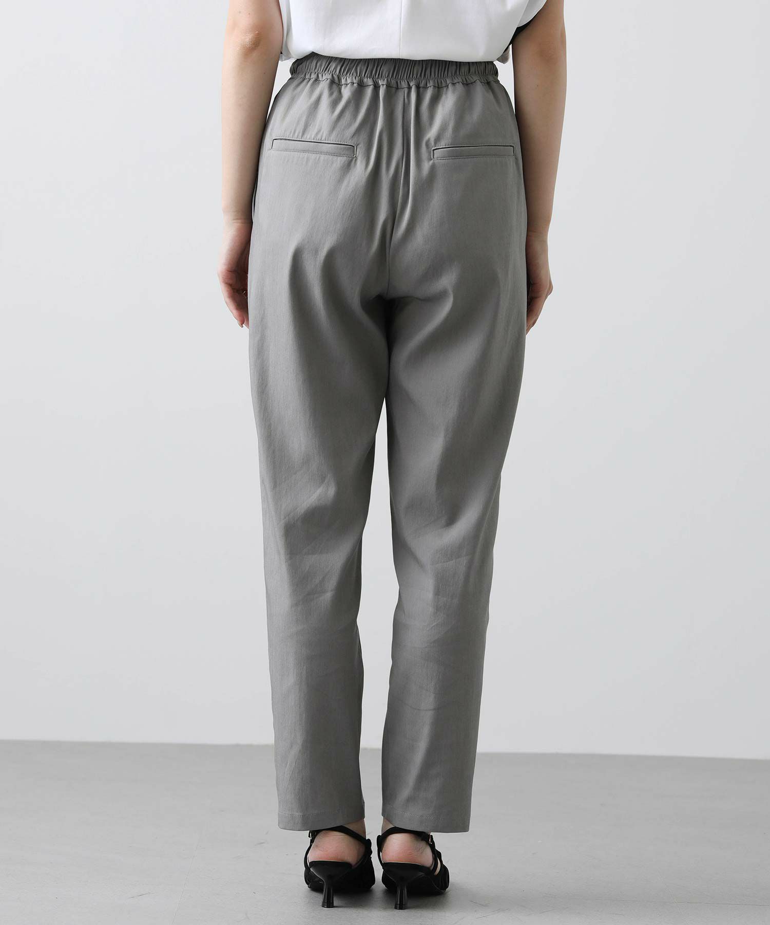 フロントウエストはすっきりときれいな印象に仕上げているので、楽ちんな穿き心地ながらきちんと感も◎オンオフ問わずに幅広いシーンで活躍します。