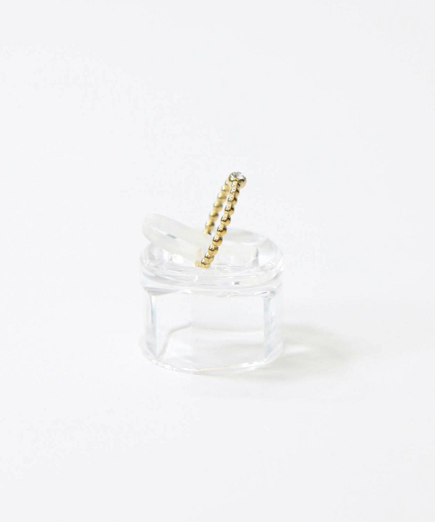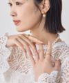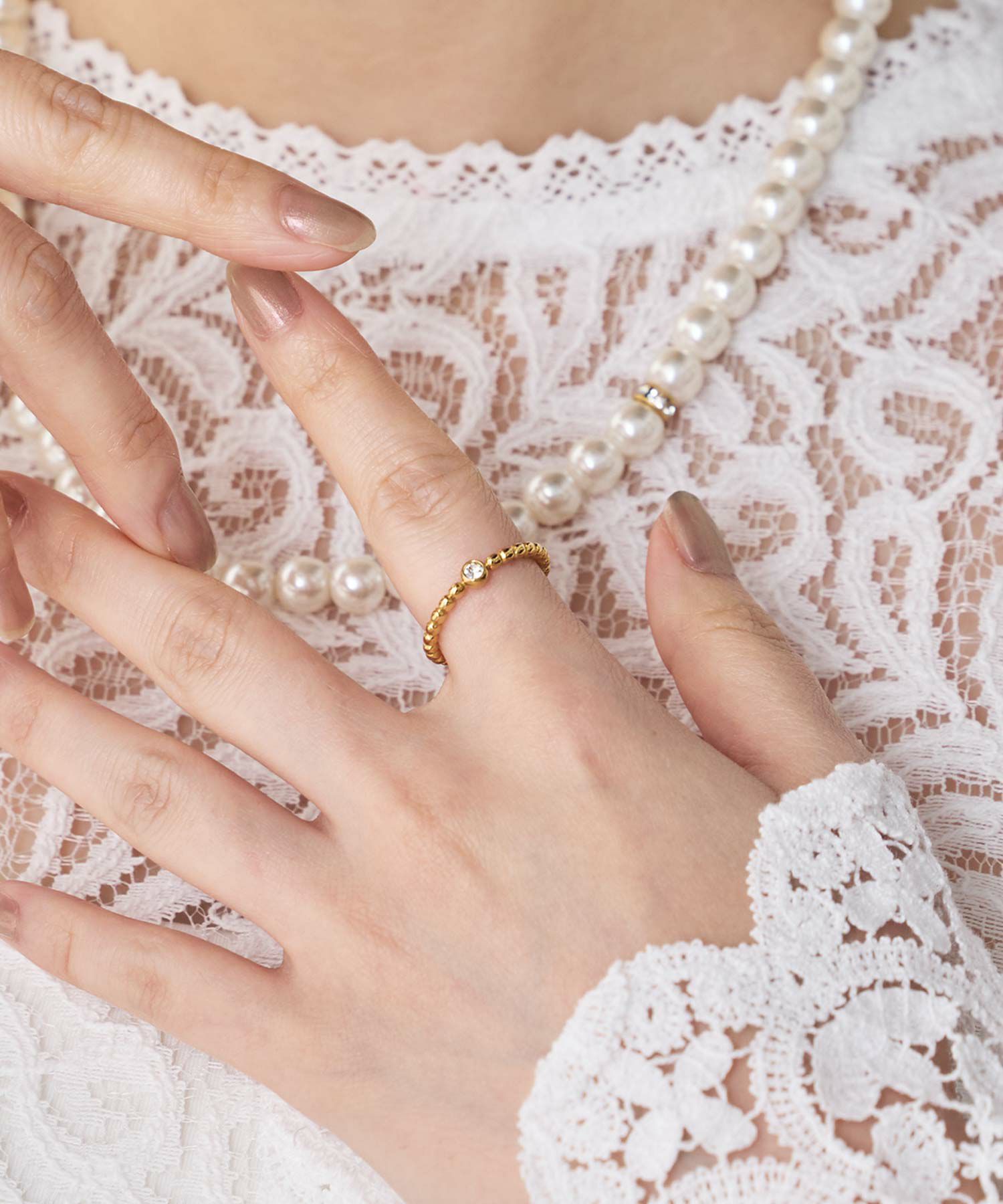 粒をくっつけたようなデザインの華奢なリングとストーンの組み合わせが華やかで、指を華奢に女性らしく見せてくれます。