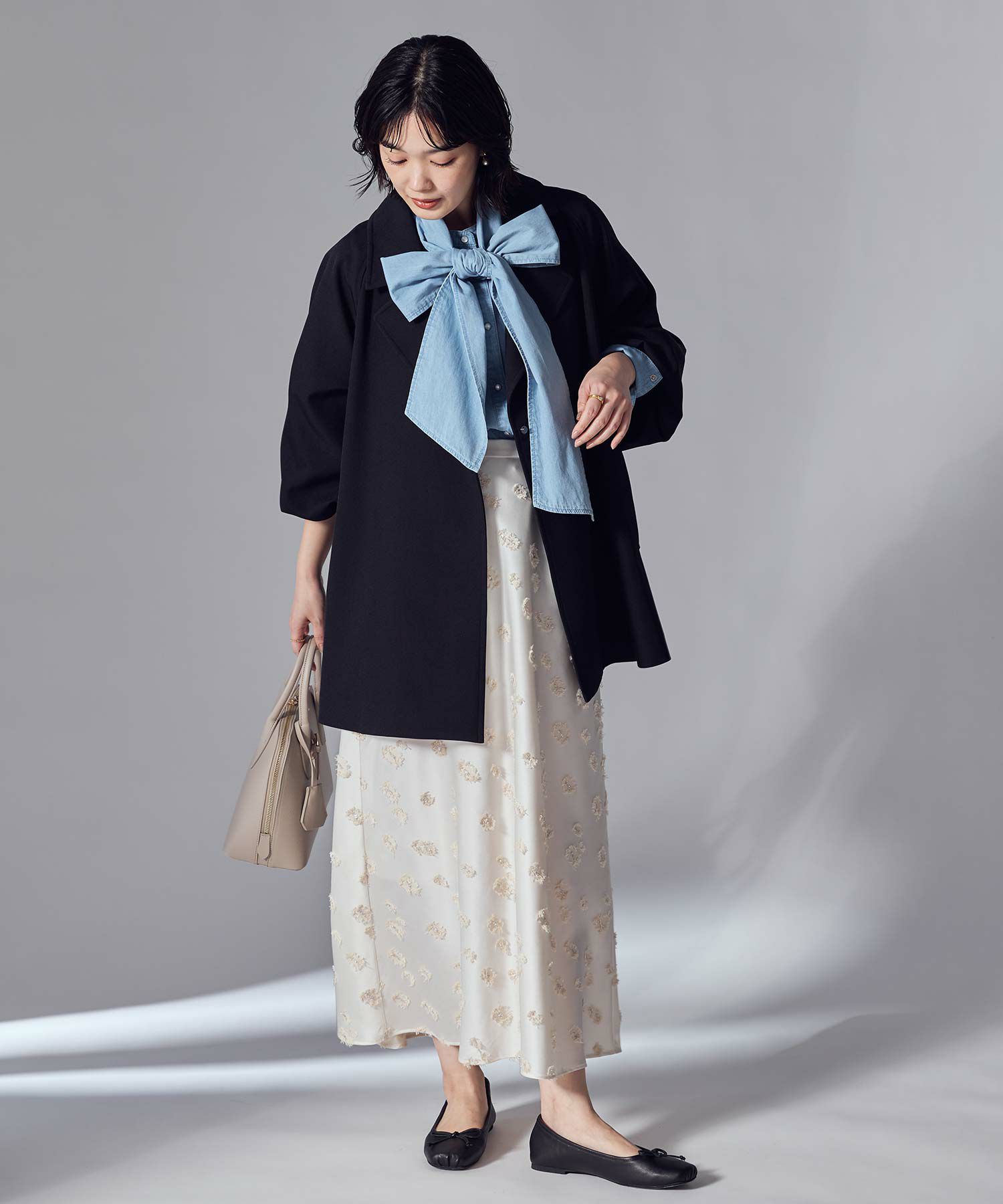 控えめなツヤとシボ感のある素材が高見えを叶え、シンプルながらも洗練された雰囲気を演出。