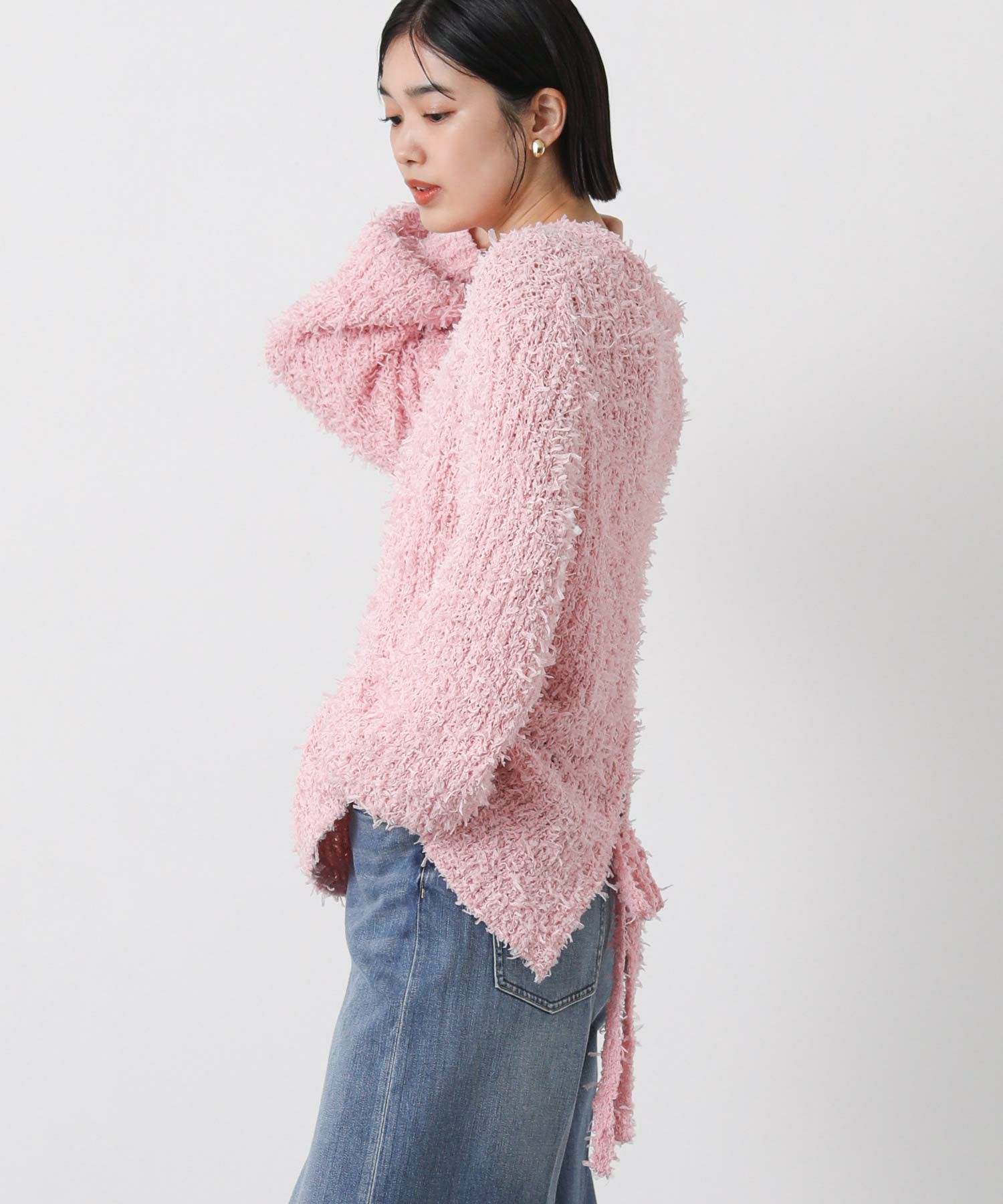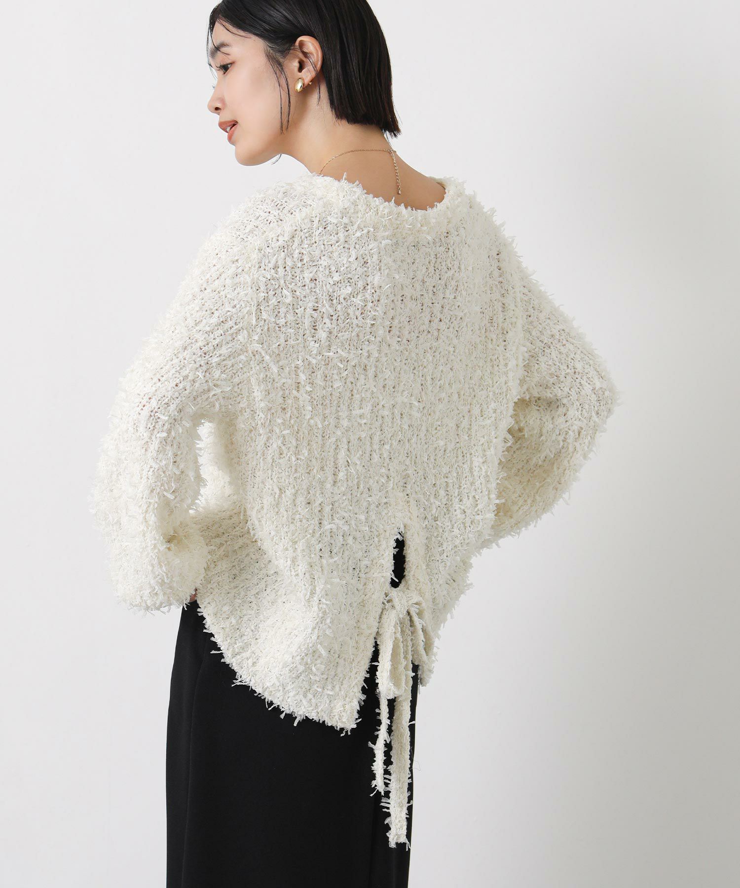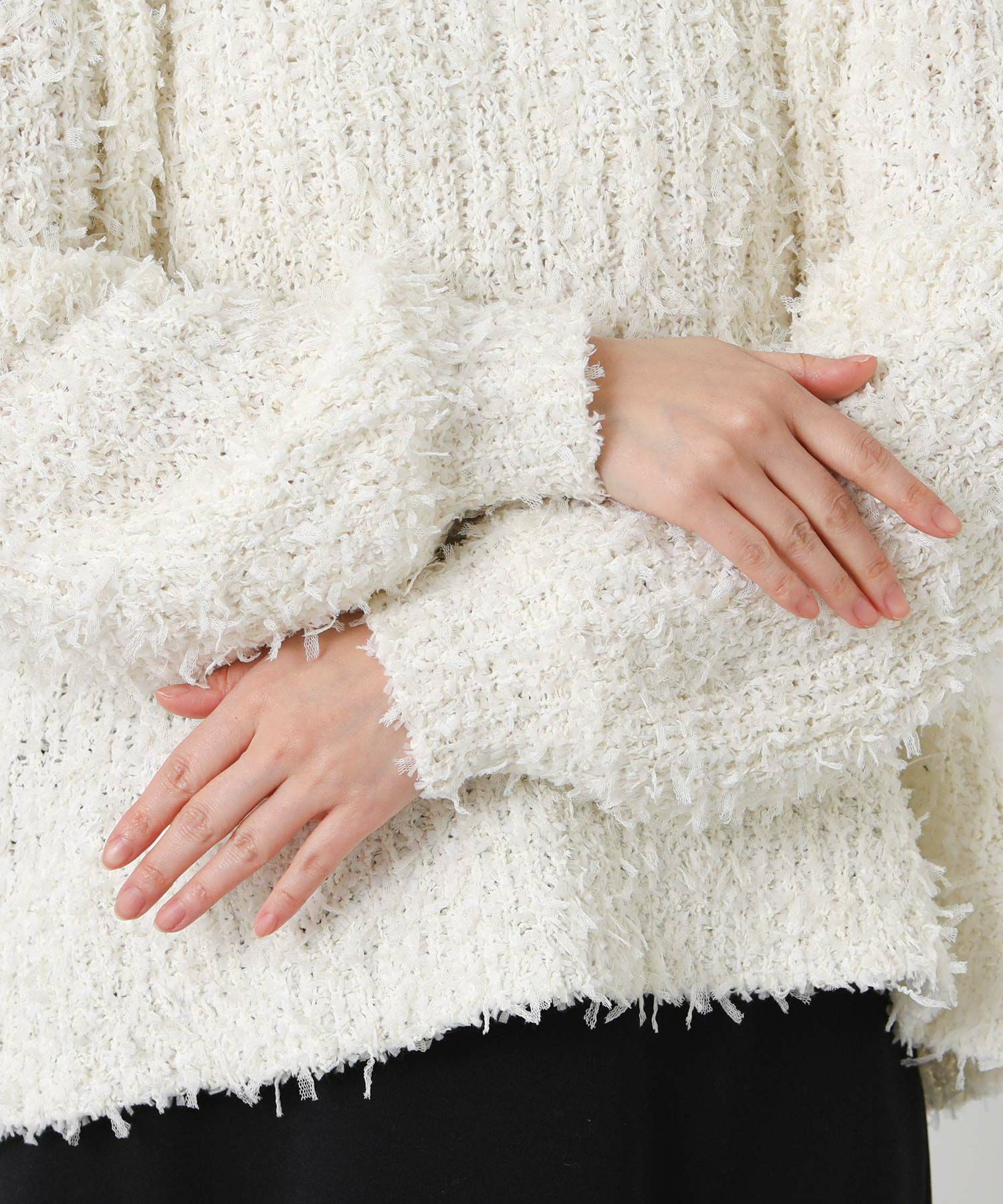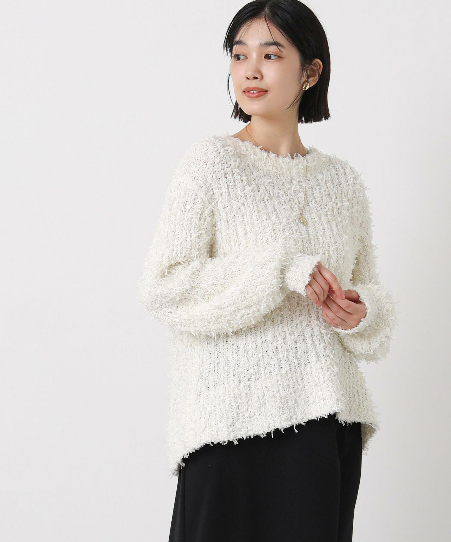 ひらひらとふんわり揺れるチュールのファンシーヤーンのメッシュ編みのニットプルオーバー。