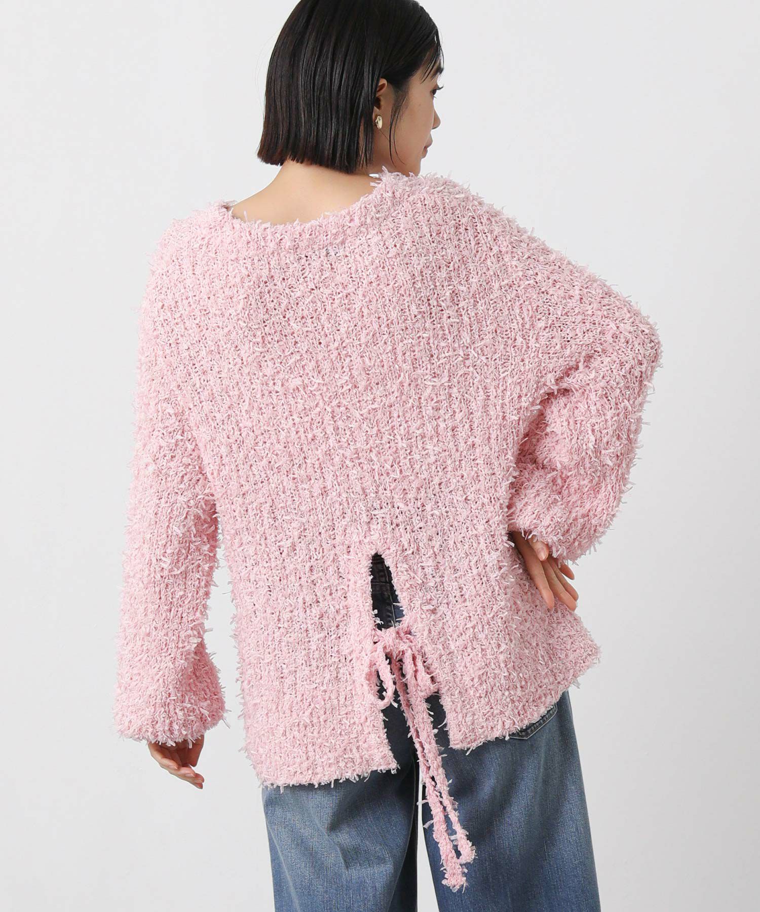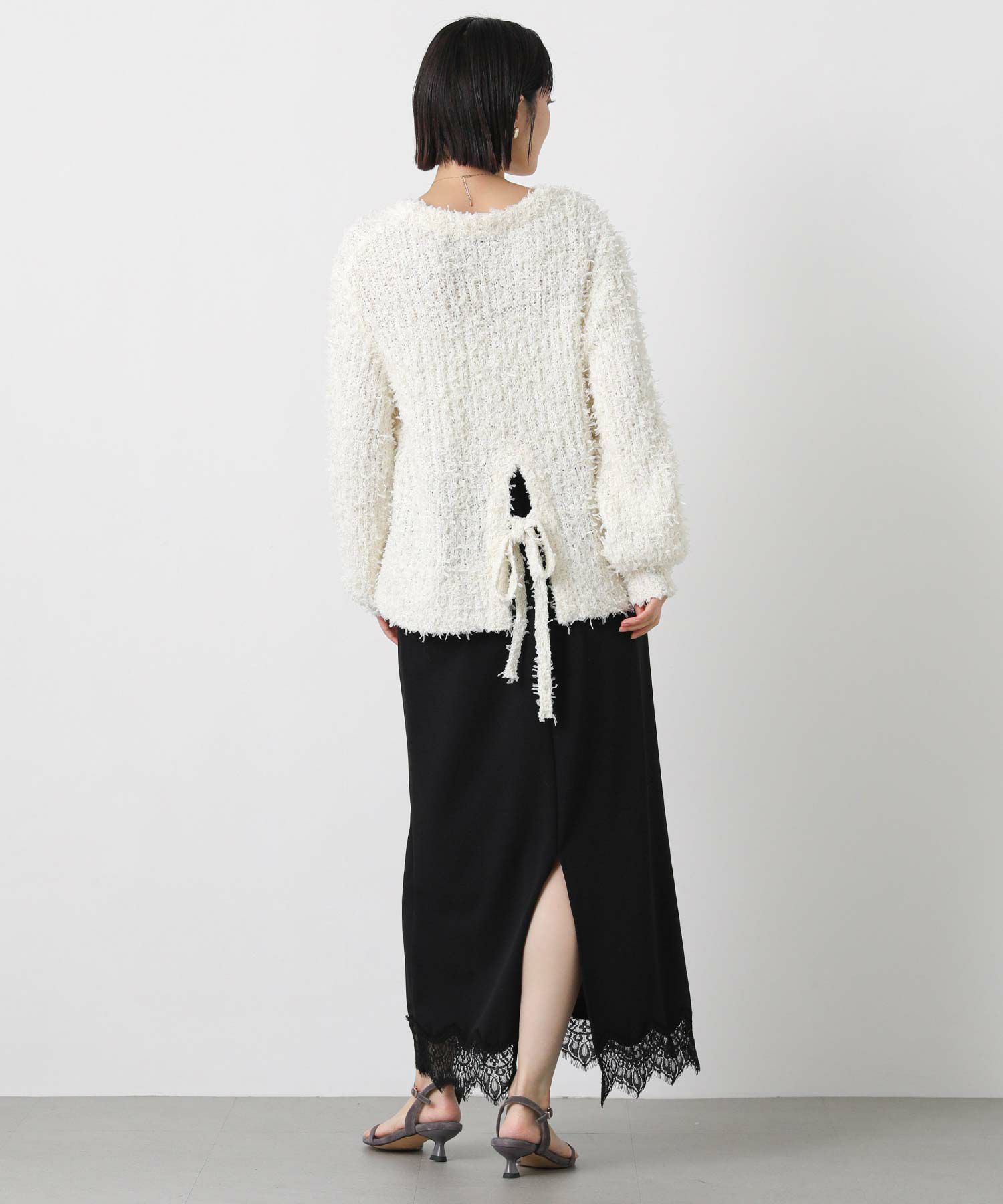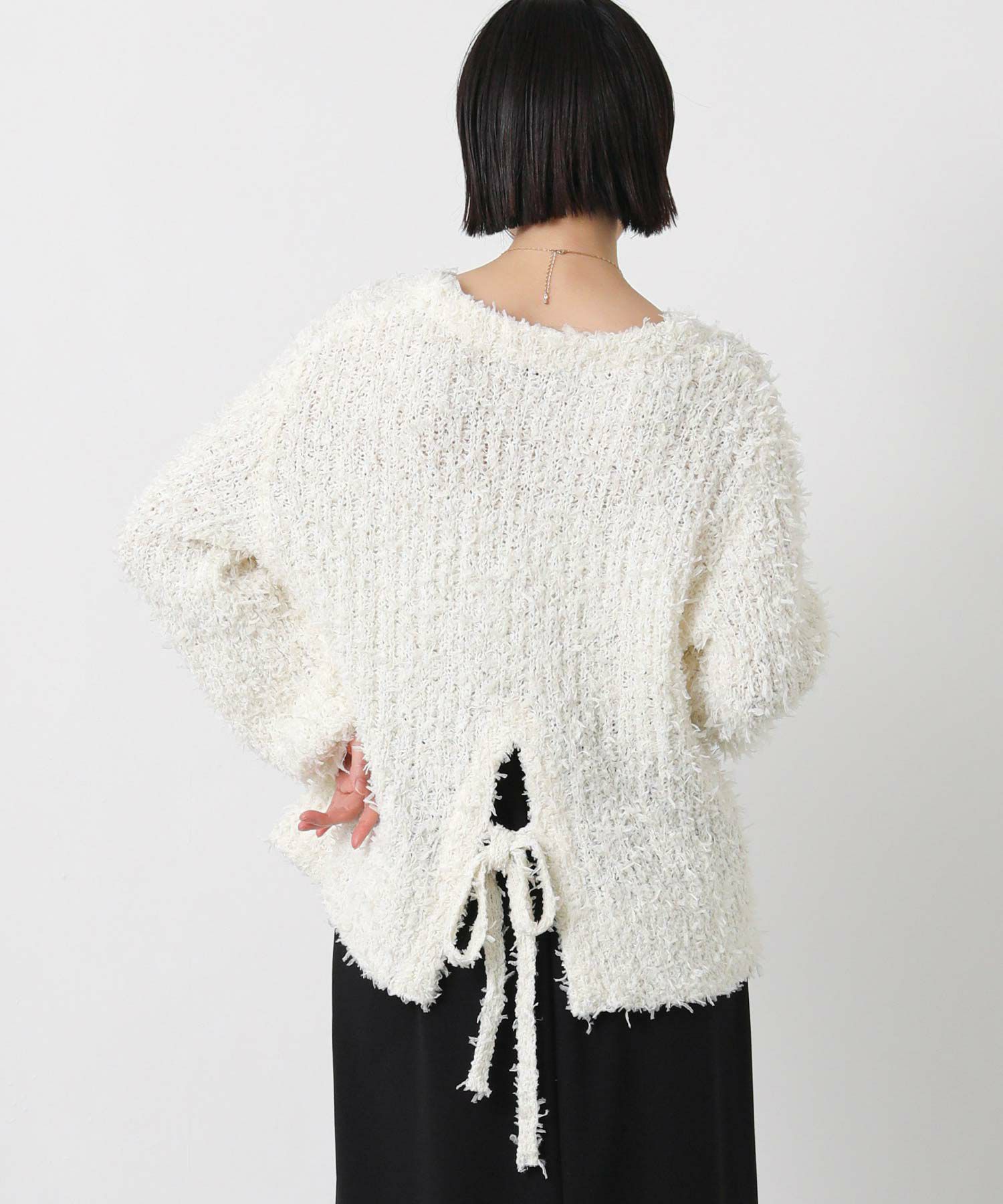 ベーシックに使えるシルエットで、バックデザインのリボンが映える1枚。