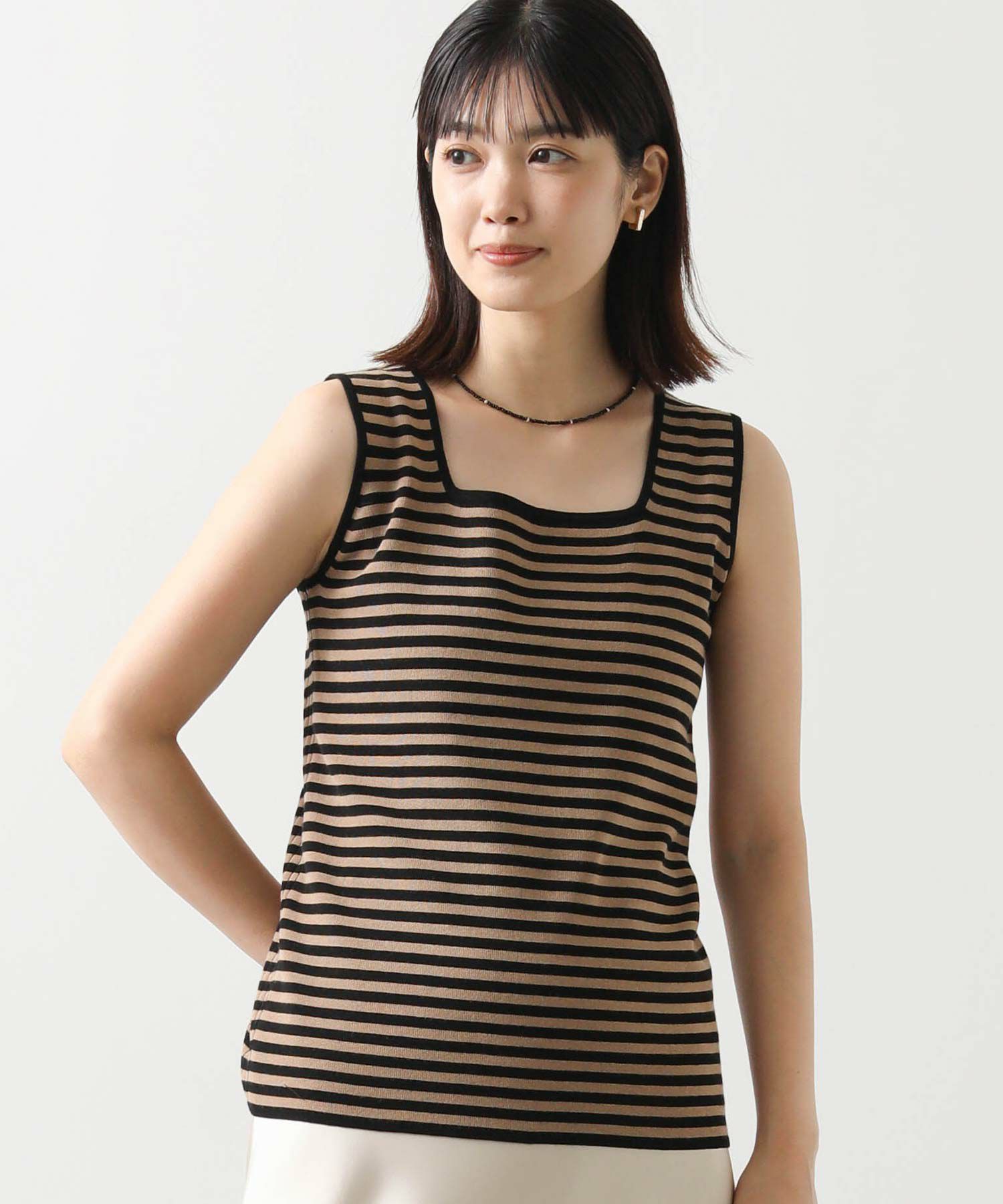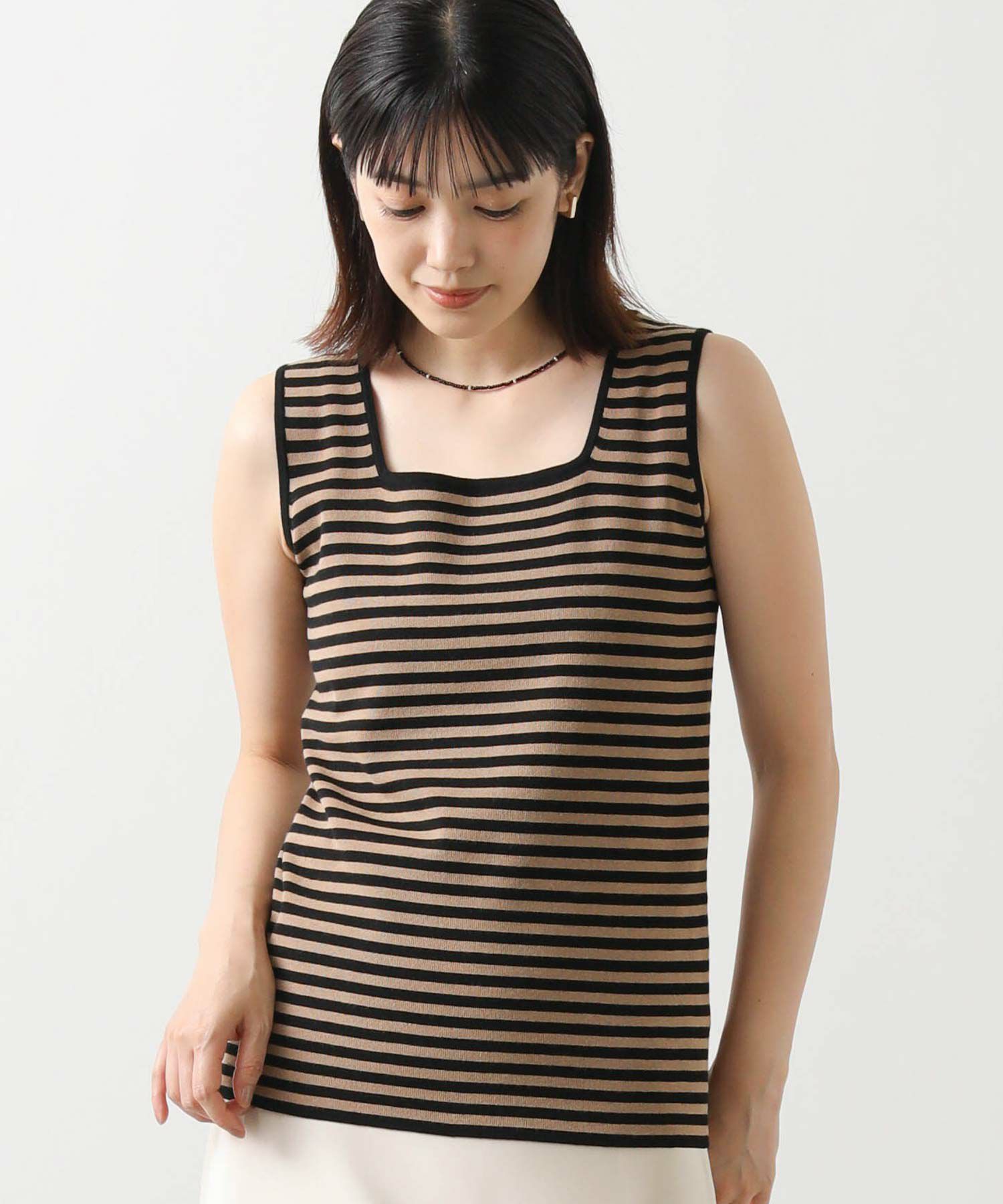 デコルテがキレイに見えるスクエアネックと、顔周りがスッキリ見えるVネックの、前後2WAYで楽しめるニットタンク。