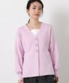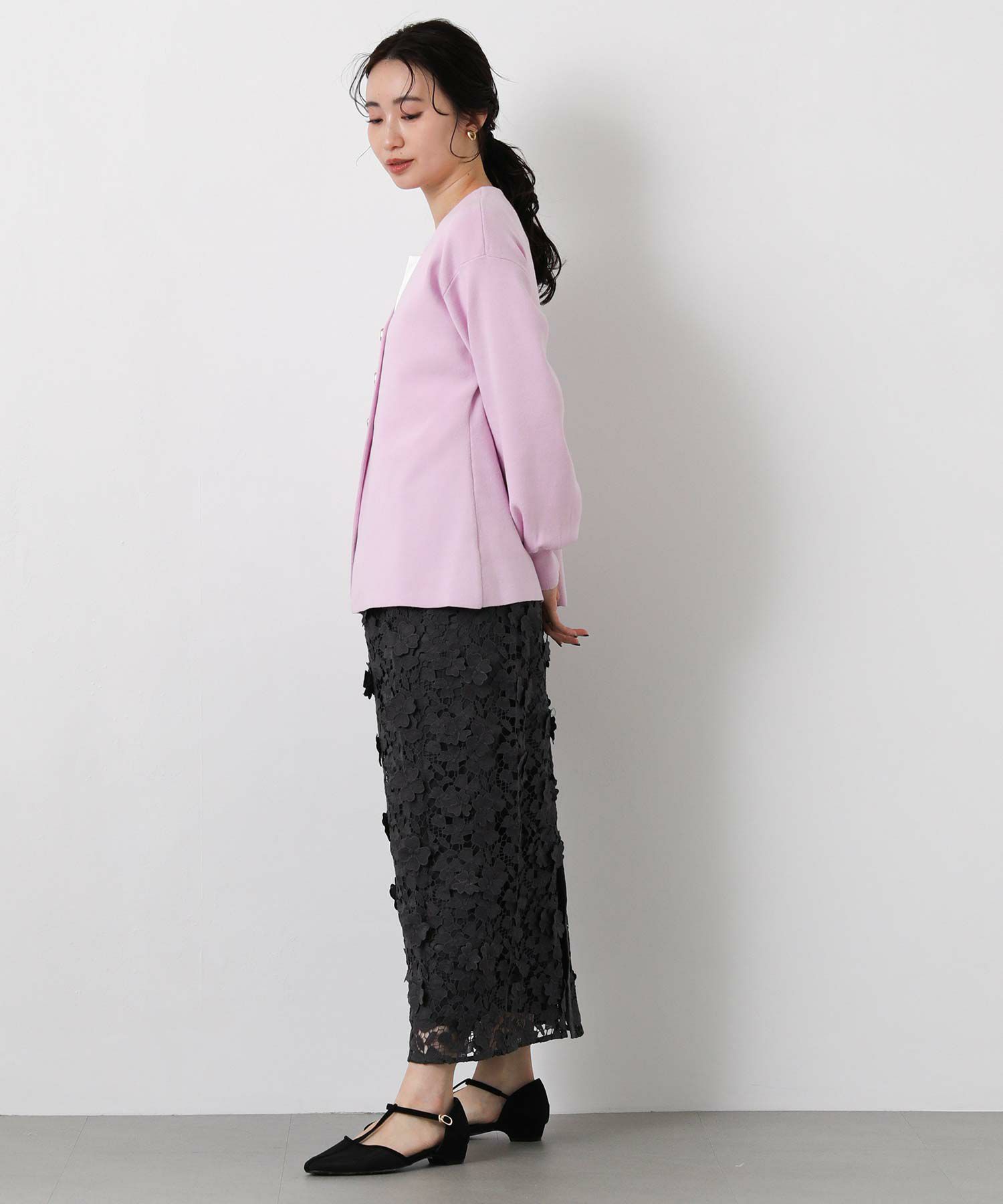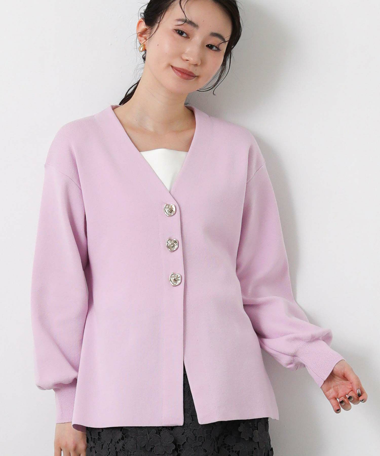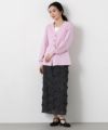 すっきりとしたVネックラインと、ウエストを絞ってペプラムシルエットに編み上げた上品なニットカーデ。