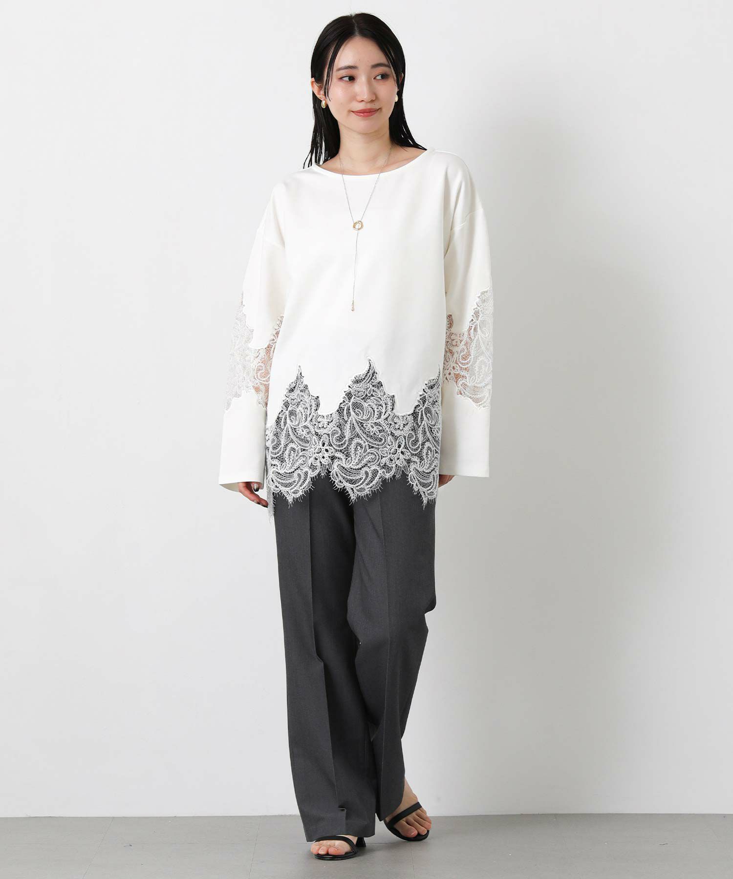 スカラップレースが上品で軽やかな印象に、ボートネックで大人っぽさを演出。