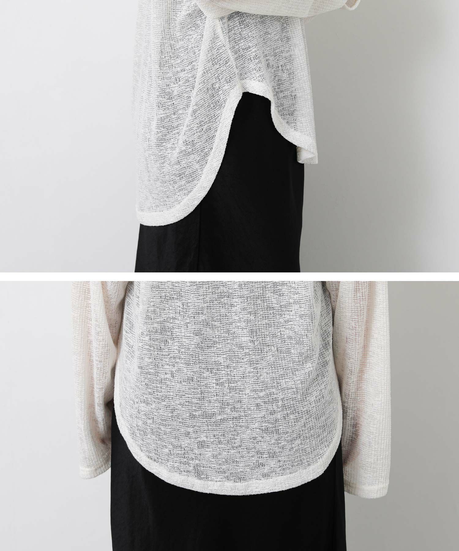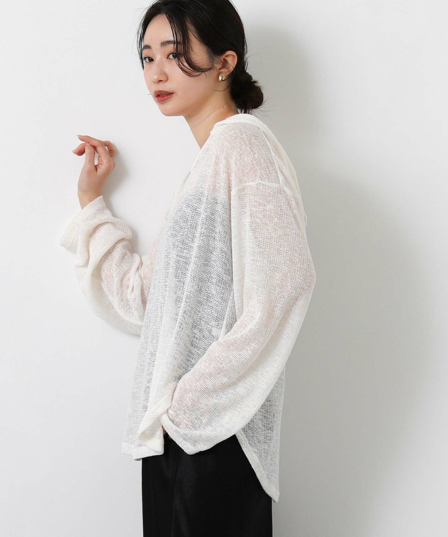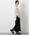 シアー素材で女性らしいのでマニッシュなスラックスをミックスさせたり、サテンやとろみのあるボトムで女性らしさをアップさせるのもオススメ。