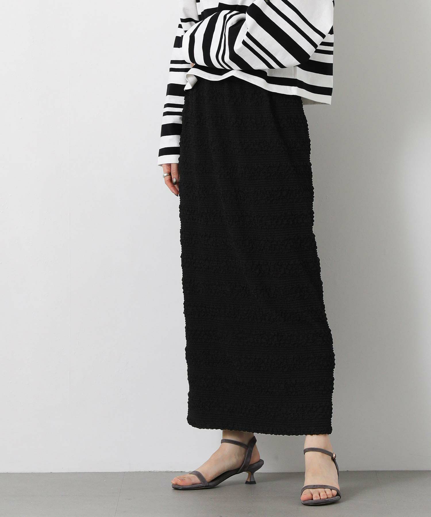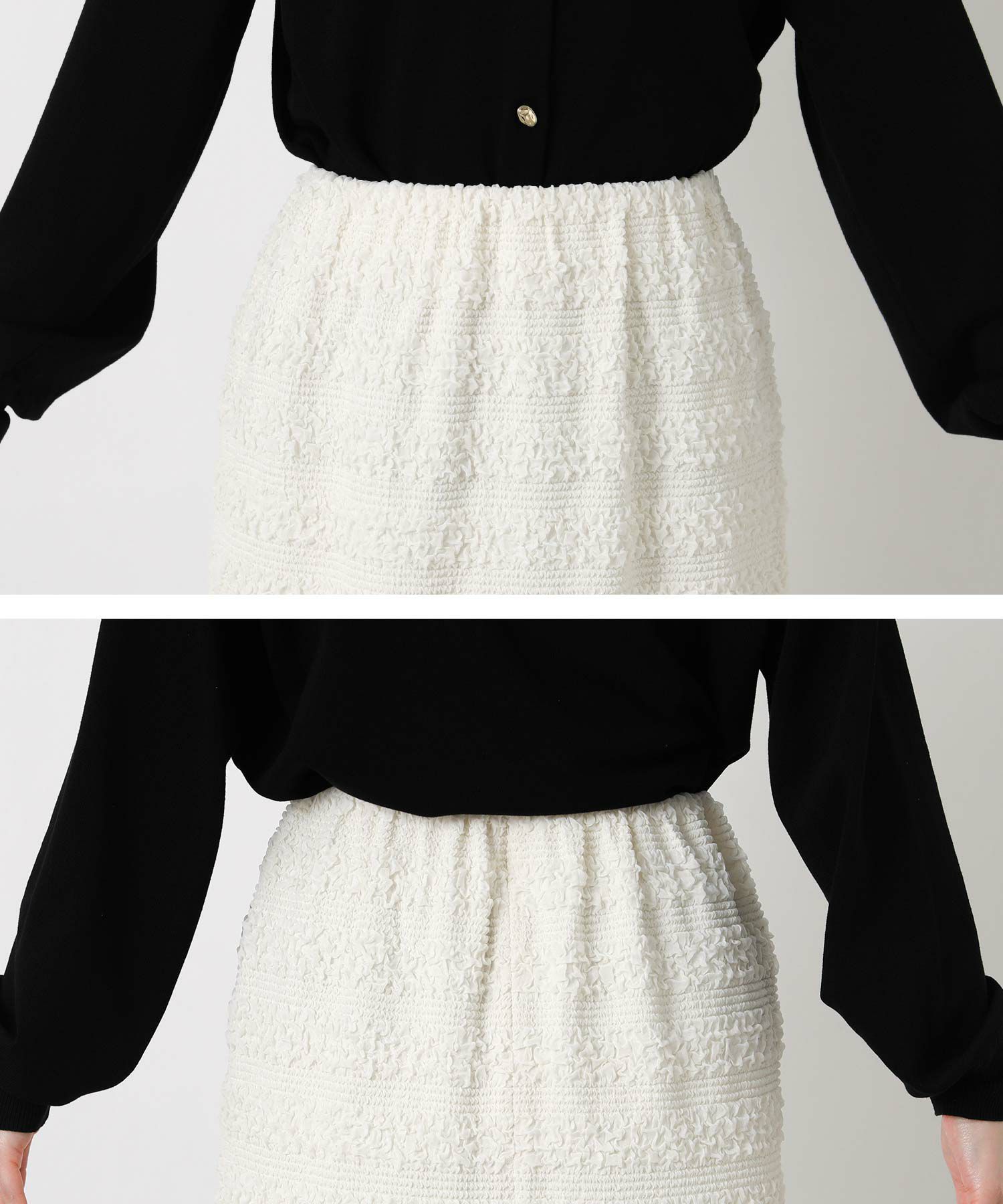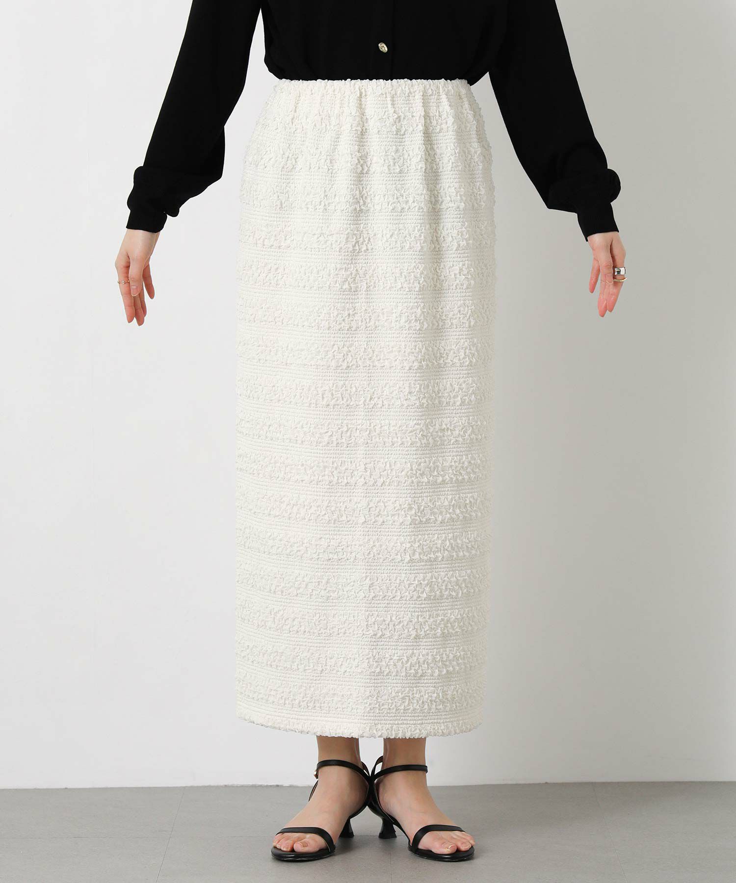 クシュクシュっとシャーリングを寄せたようなレース生地が繊細で女性らしいレーススカート。