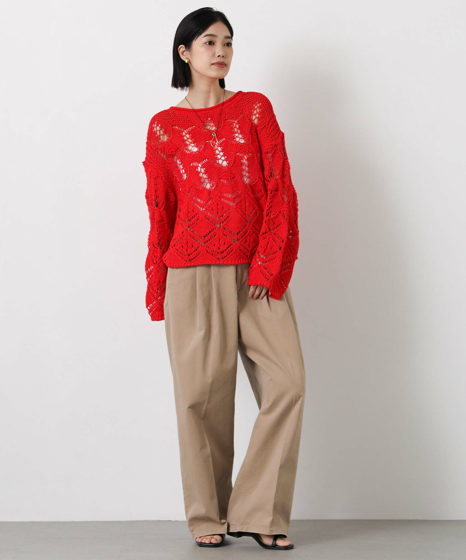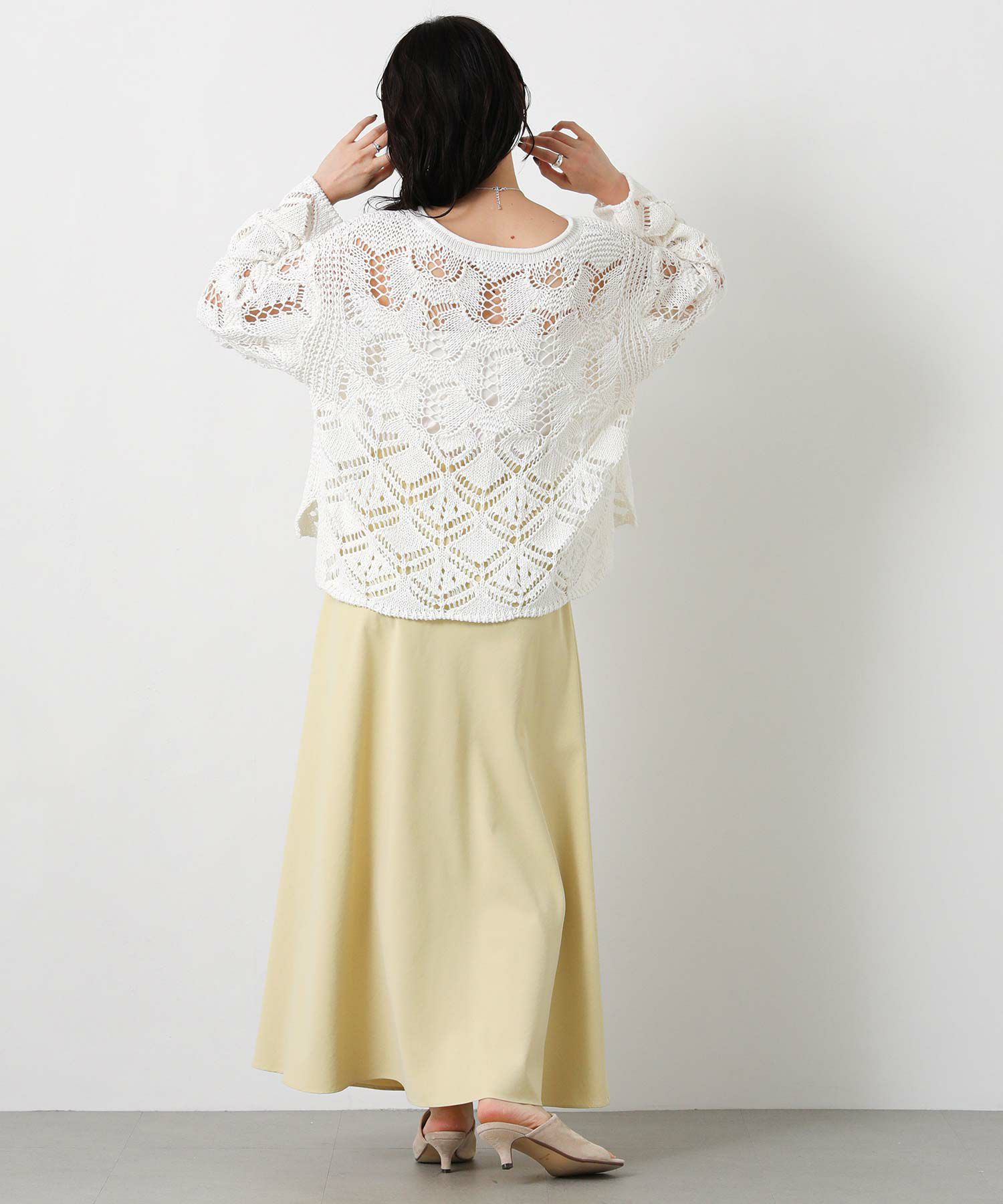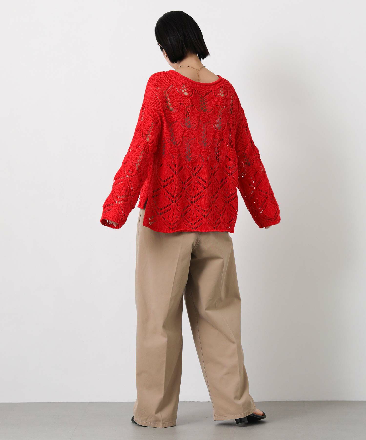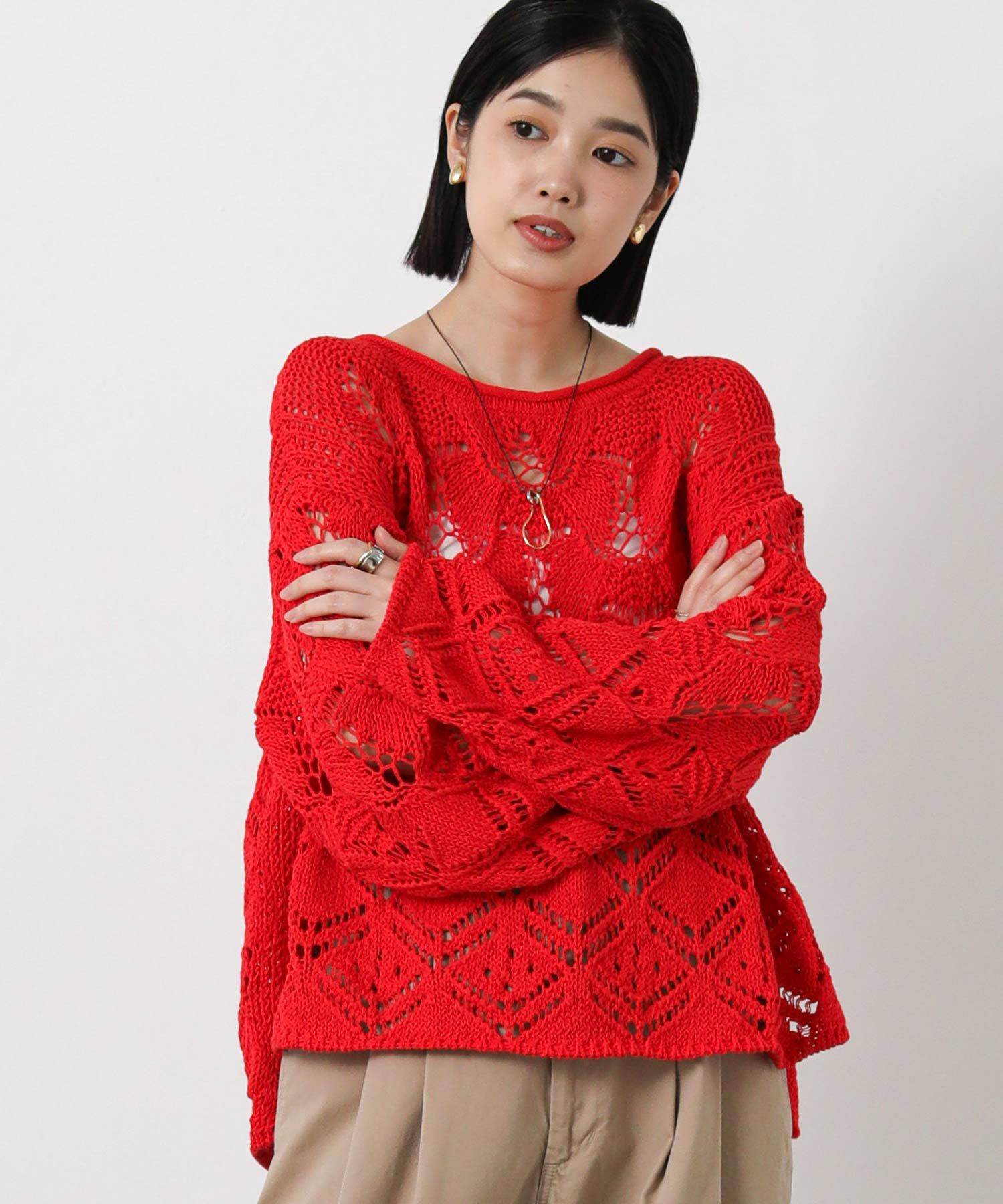 透かし柄が軽やかな印象のニットプルオーバー。
