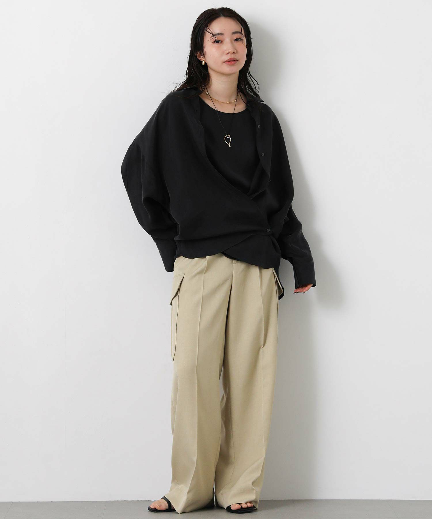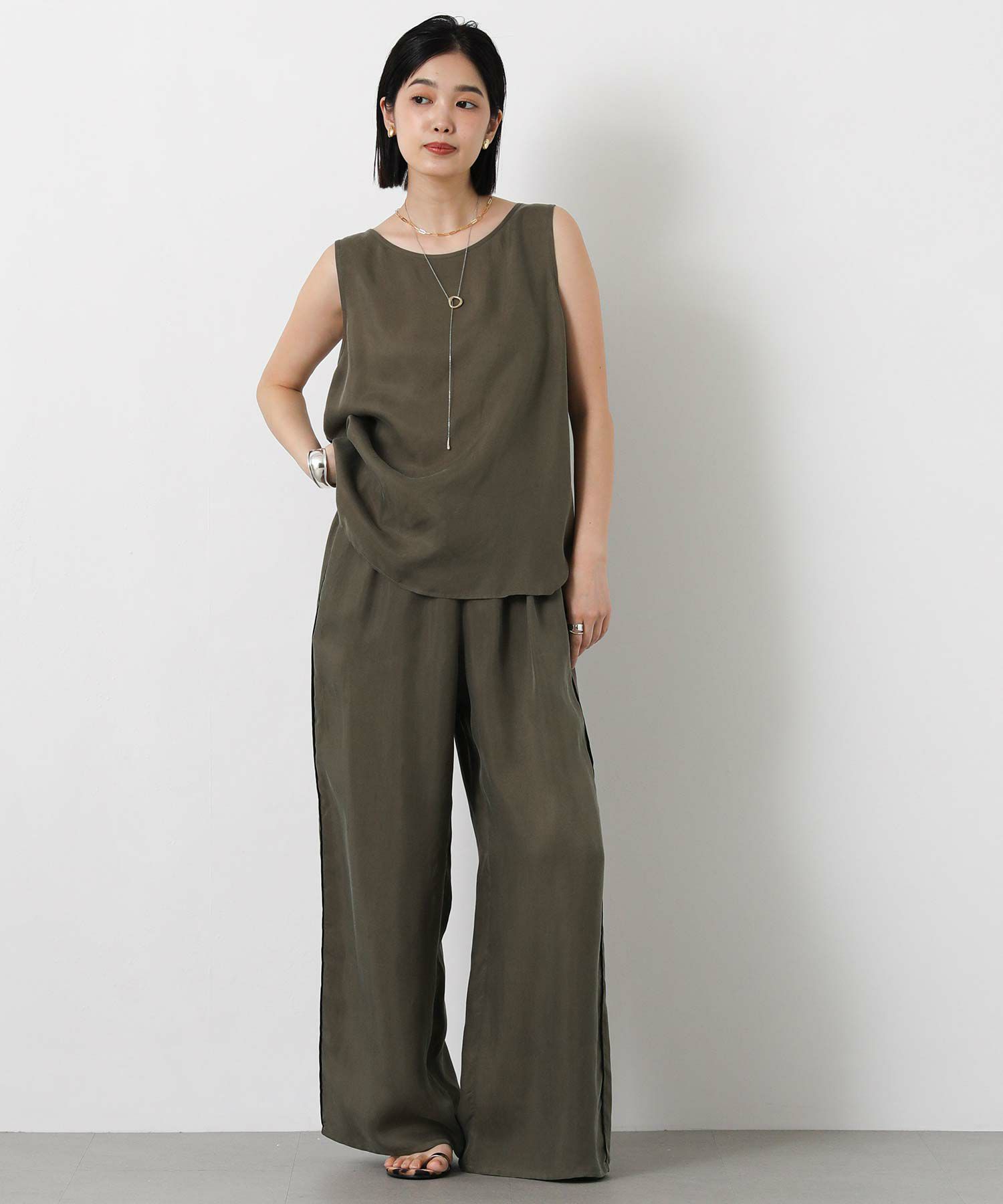 LUキュプラシャツ(OEO455424001)、LUキュプラセミワイド(OEO455426001)と素材感を合わせたセットアップでの着こなしがオススメ。