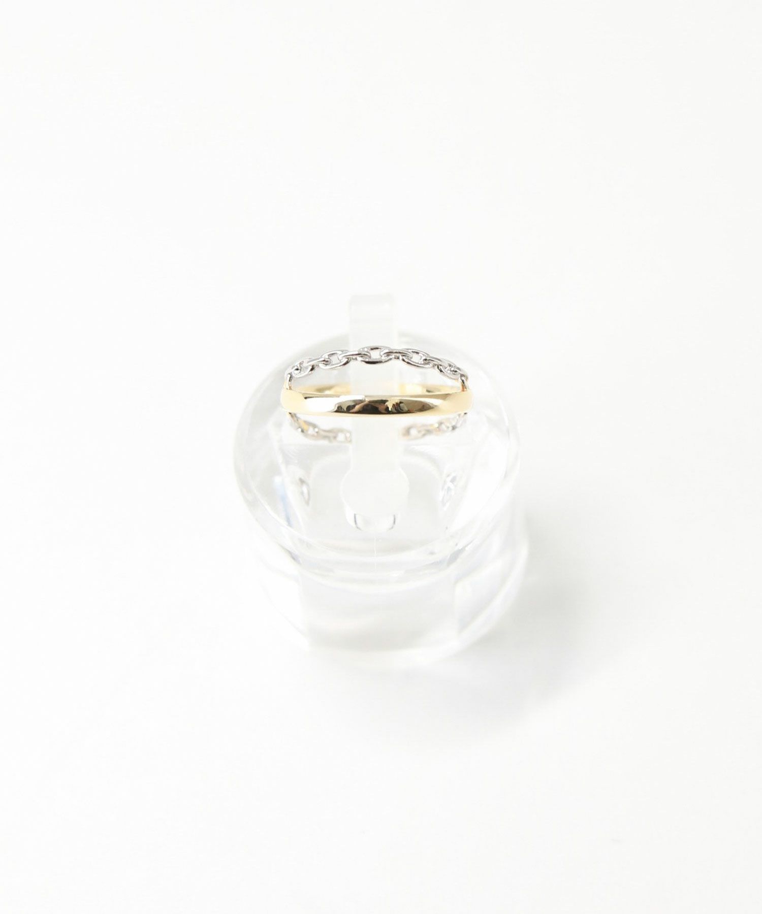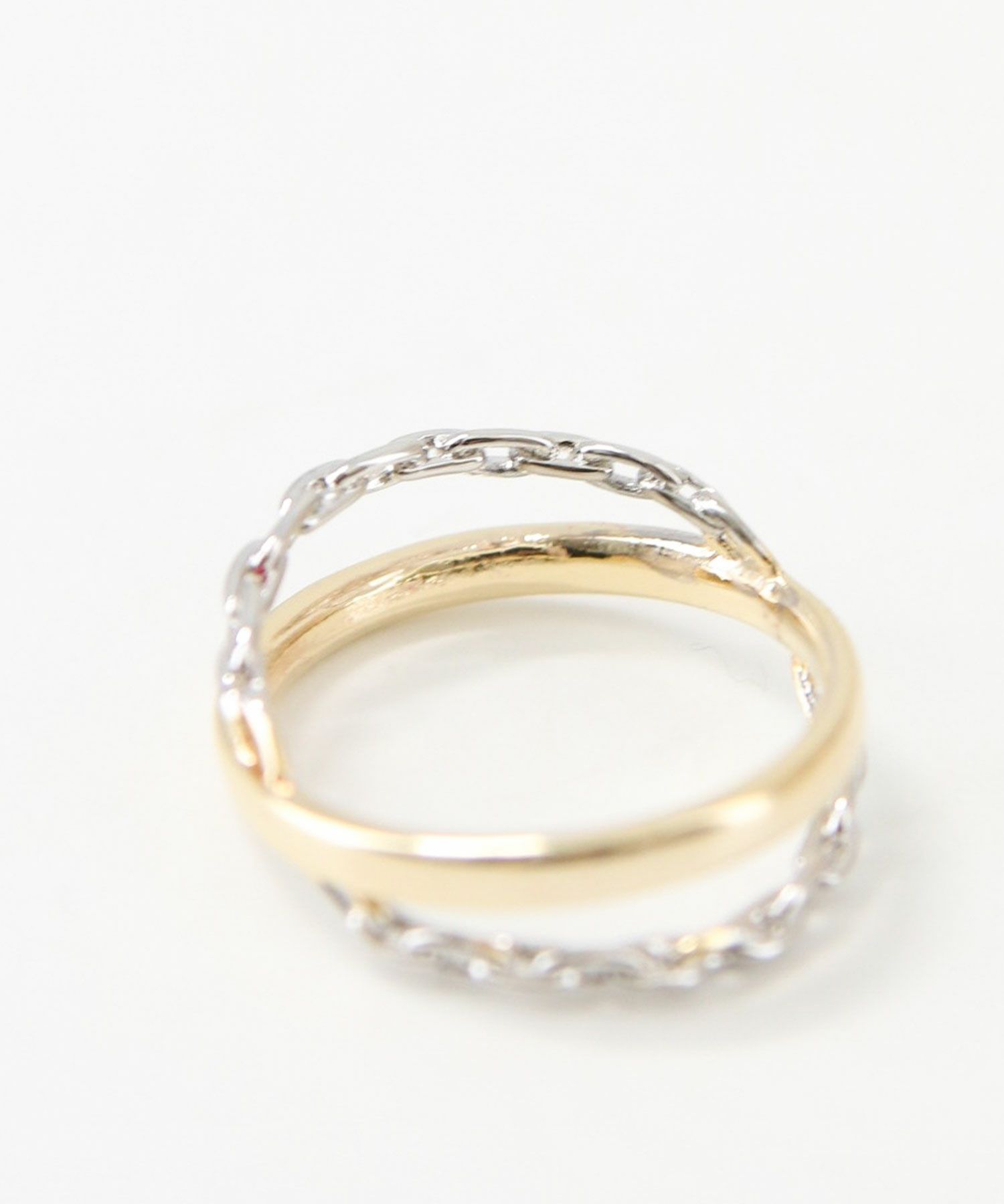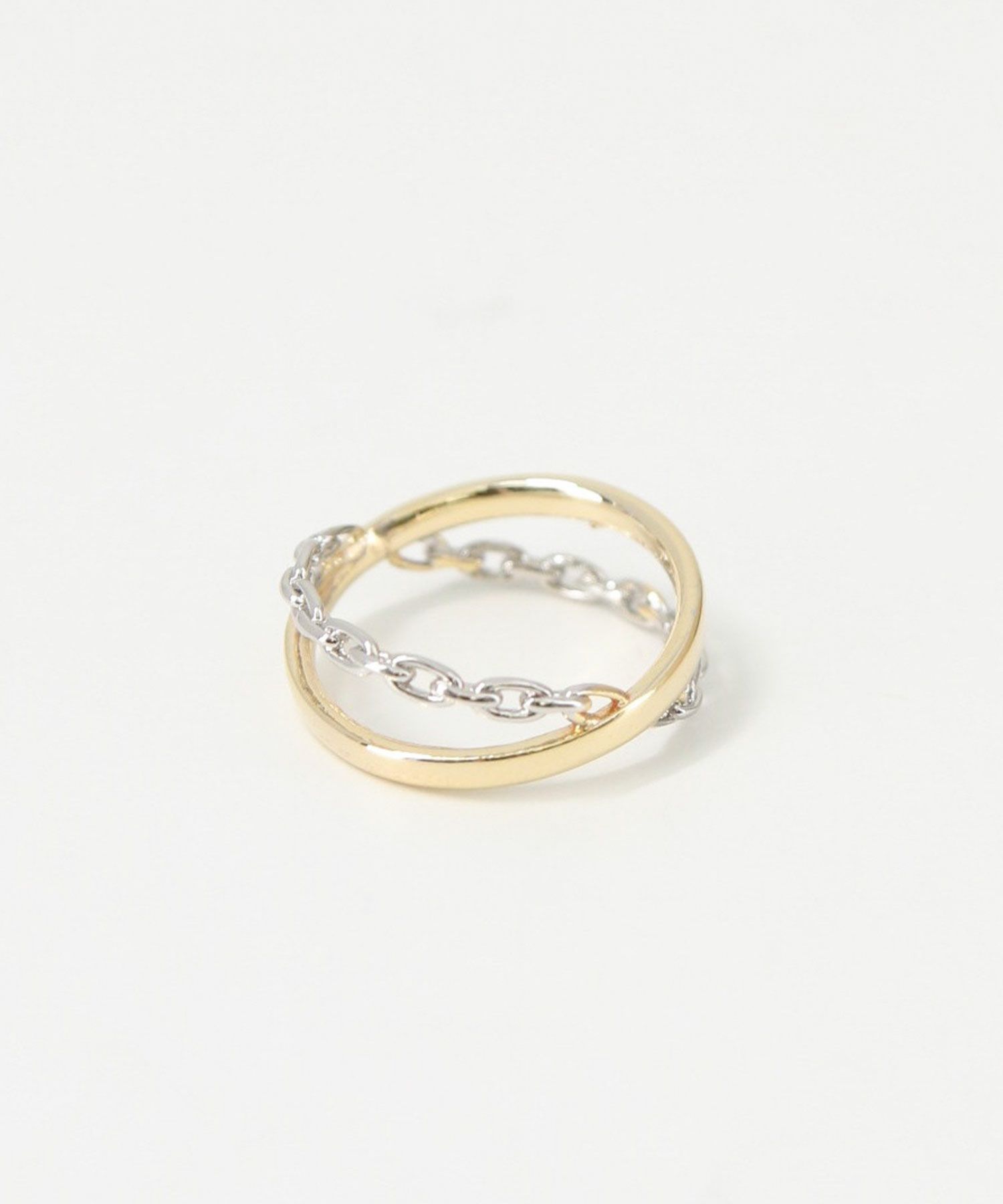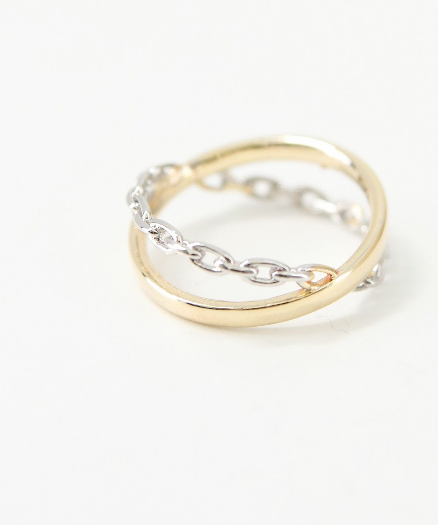 ゴールドのリングとシルバーのチェーンがクロスしたお洒落なリング。