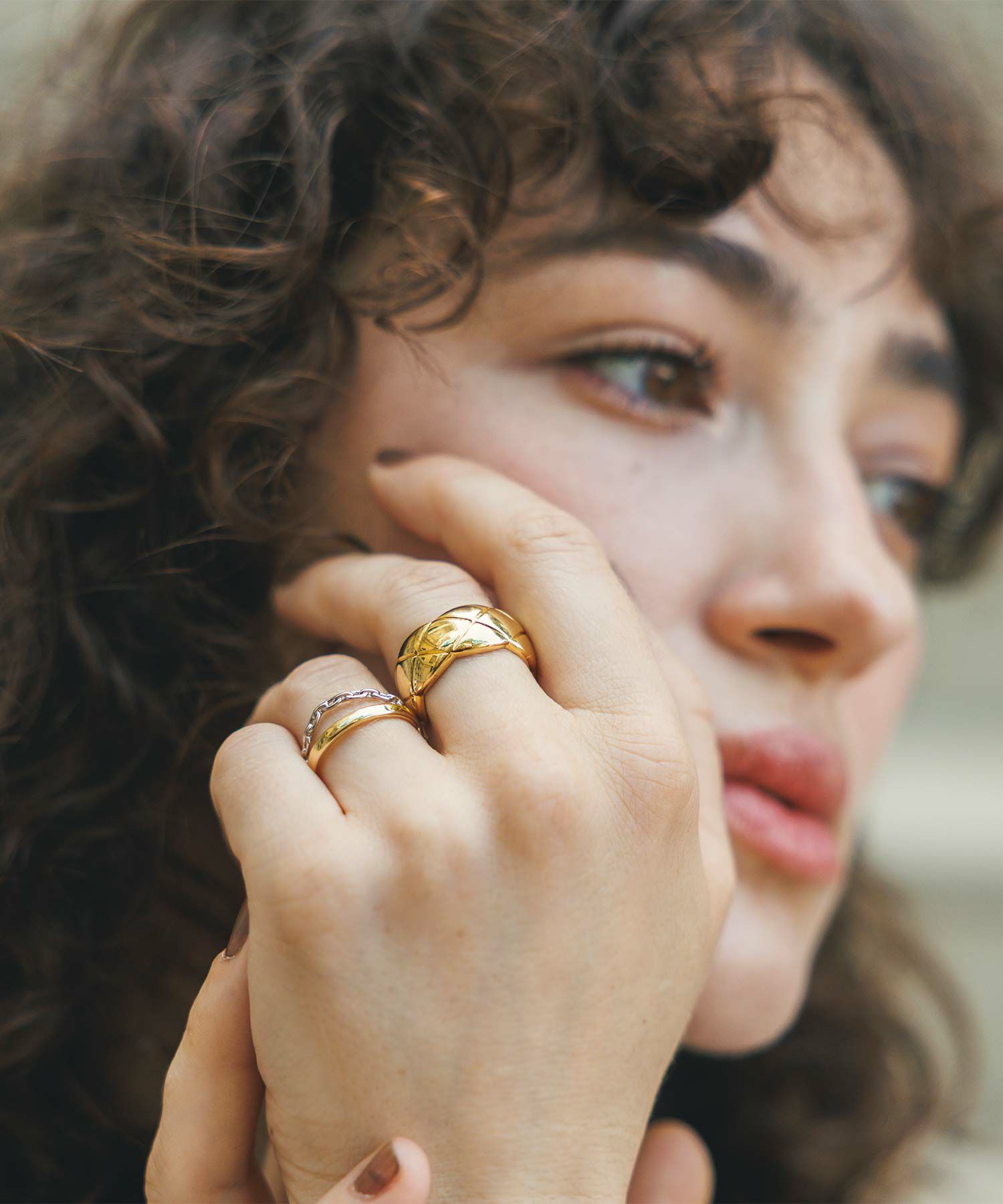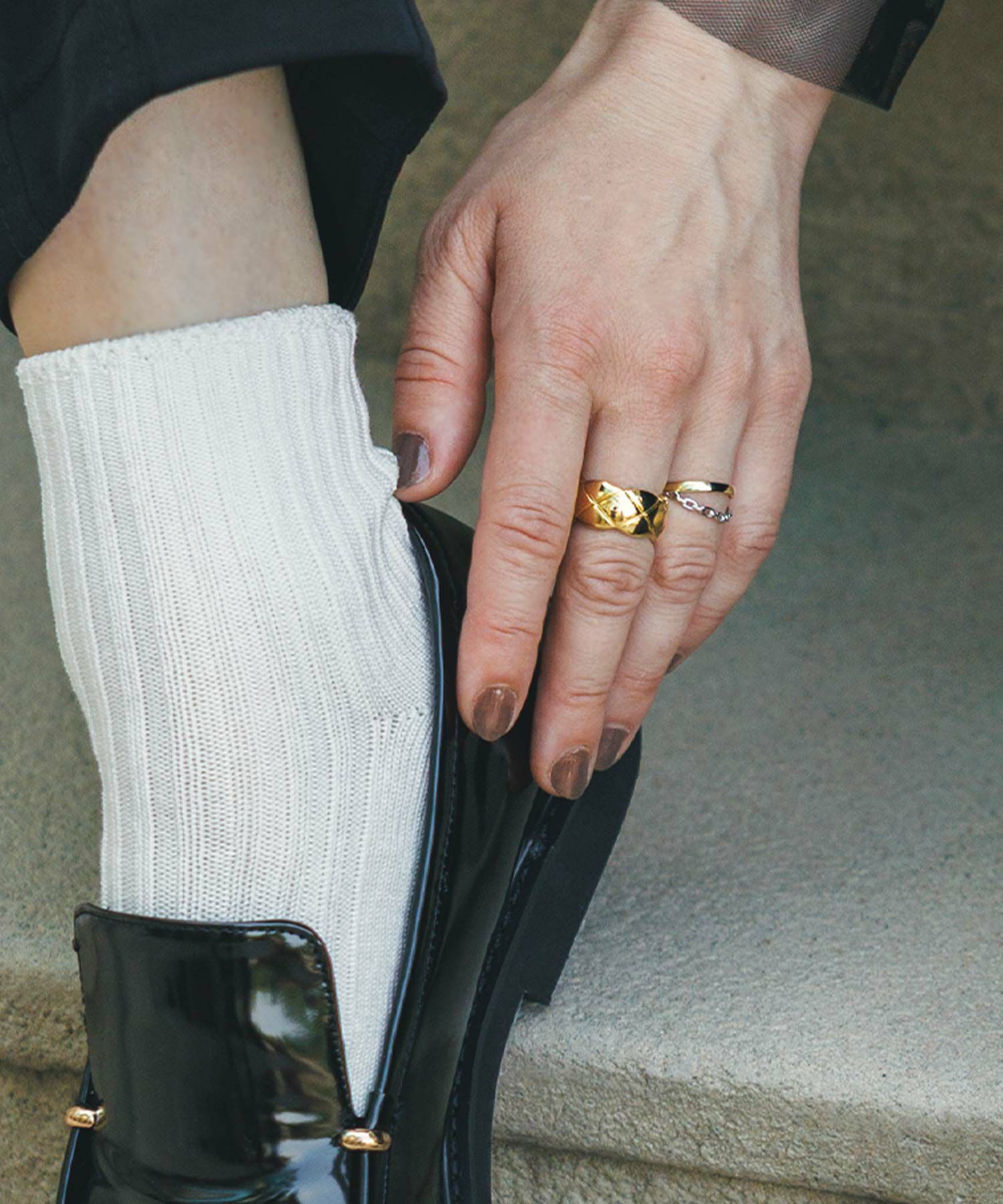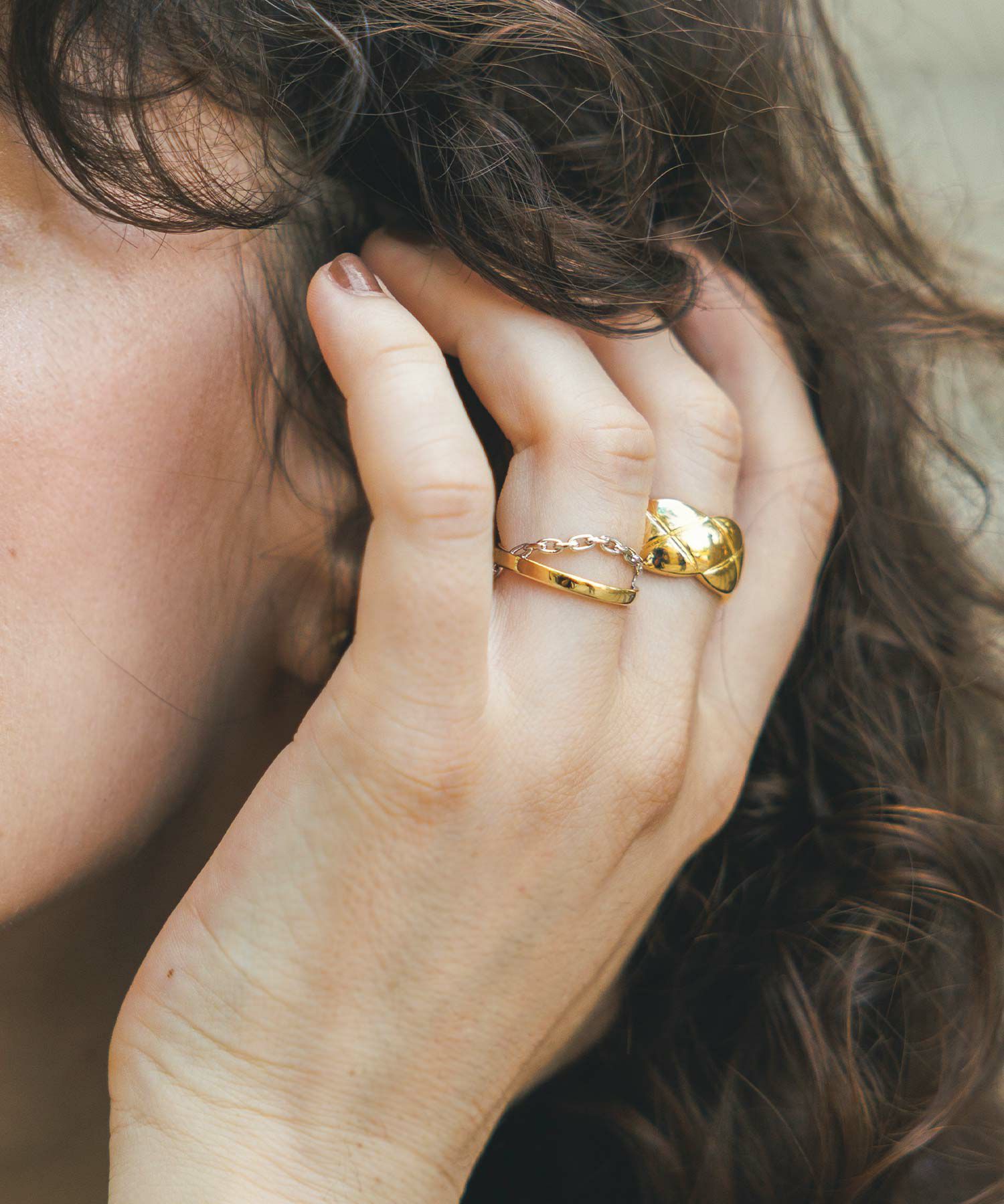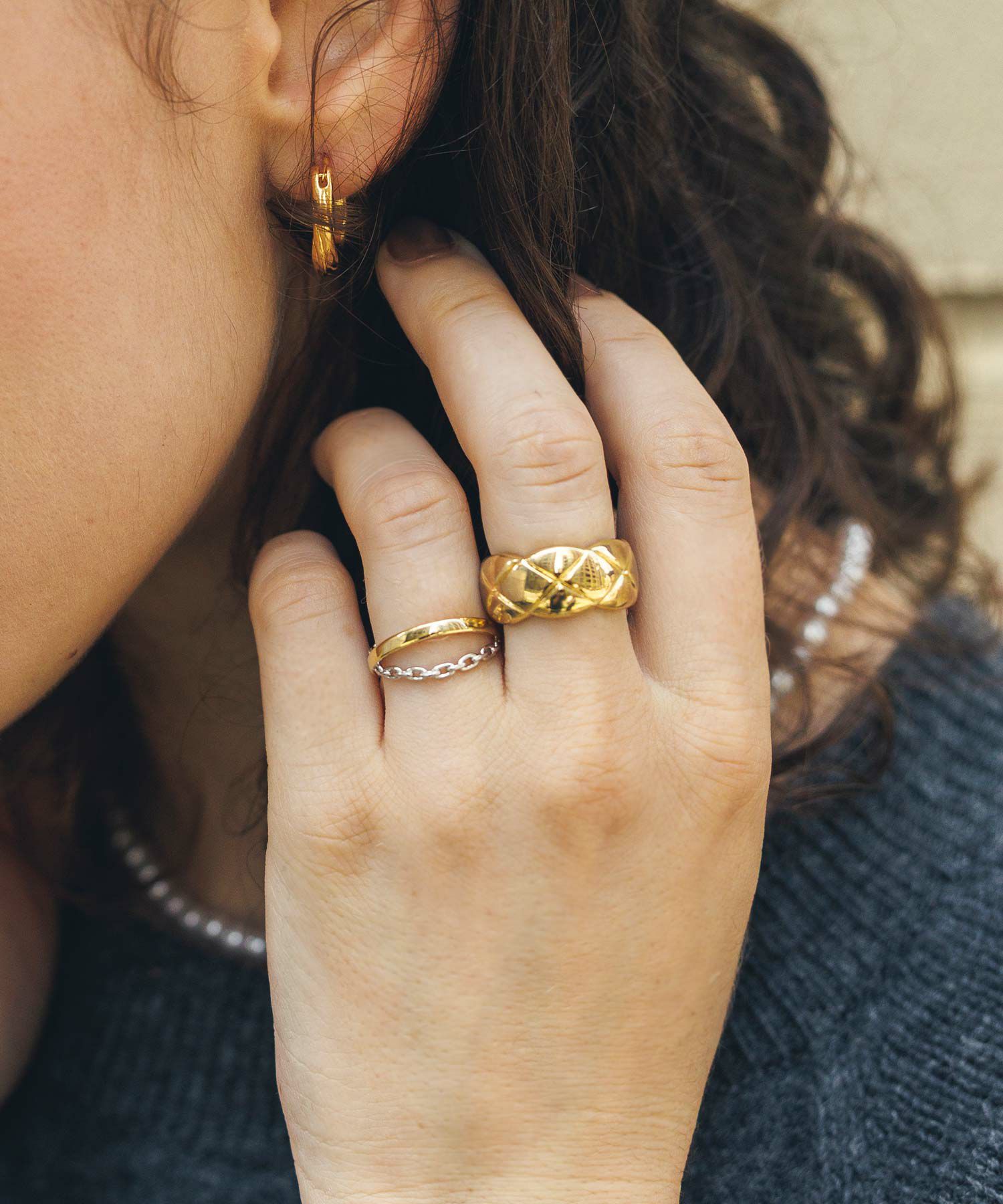 ゴールドのリングとシルバーのチェーンがクロスしたお洒落なリング。
