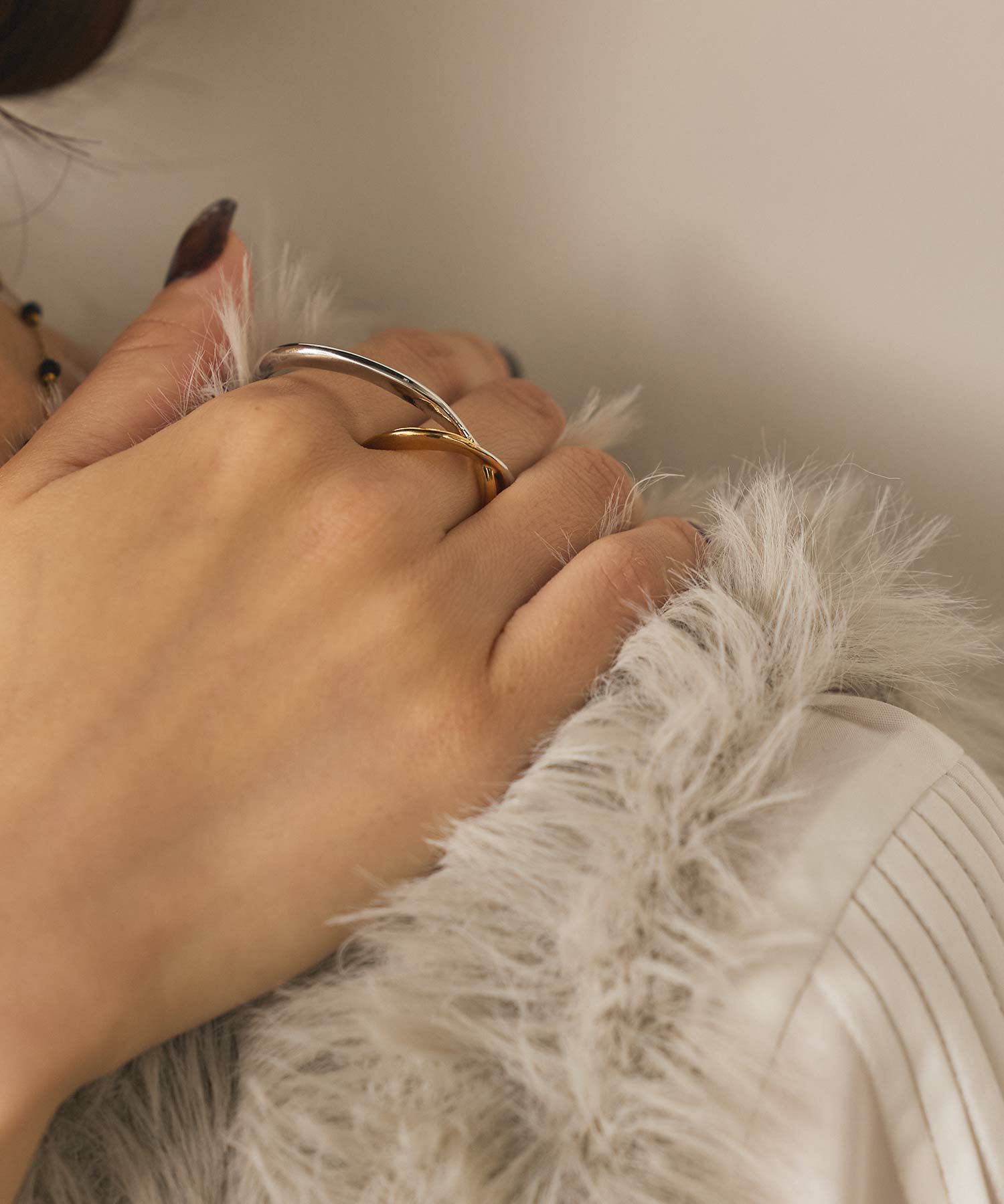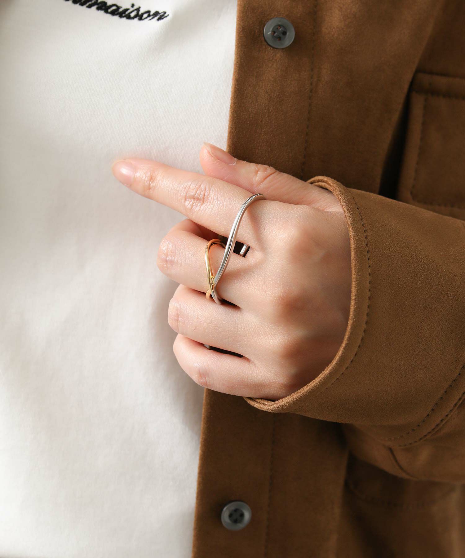 手元にインパクトを与える、二本の指に装着するダブルフィンガーリング。