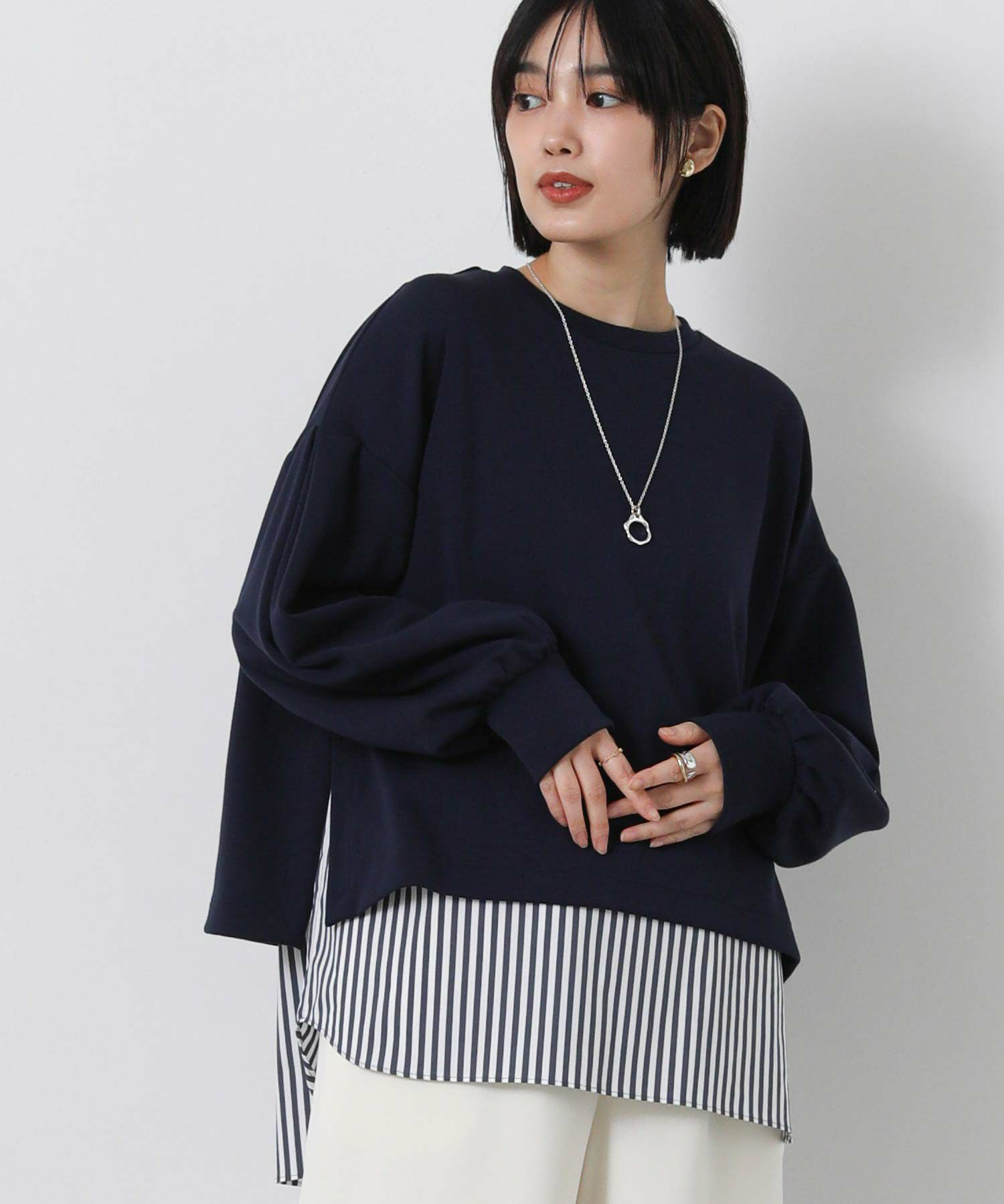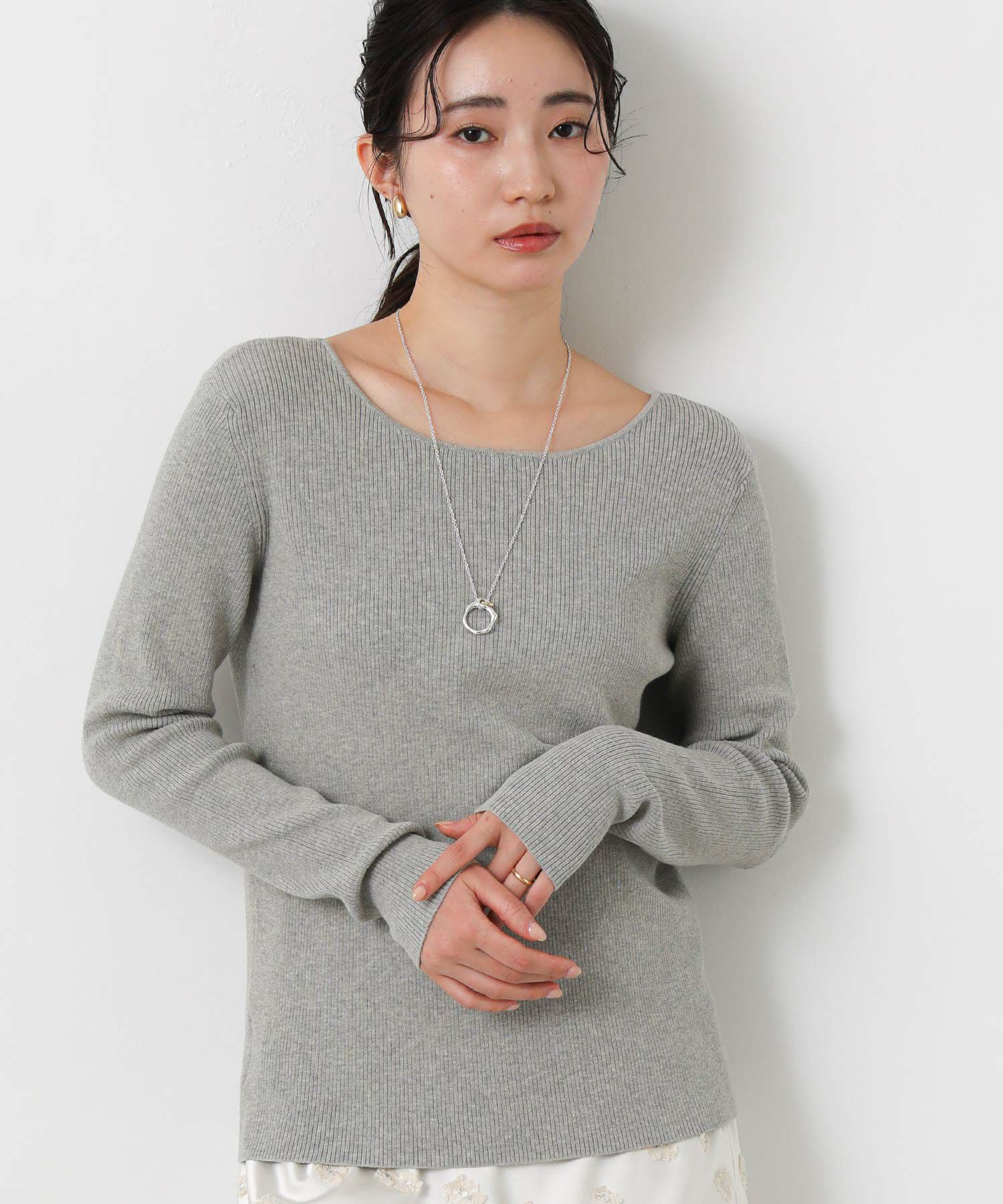 程よくボリュームのあるネックレスは、シンプルになりがちなニットスタイルにアクセントをプラスしてくれます。