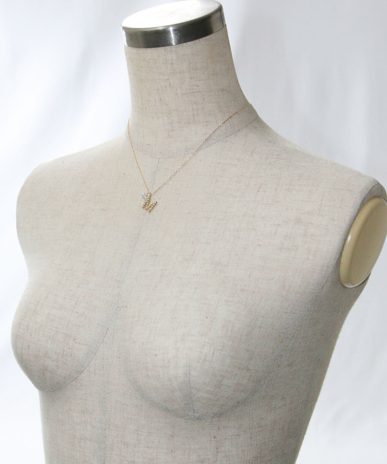 小さな粒をつなぎ合わせたようなデザインのイニシャルは、主張しすぎずさりげない印象で付けられます。