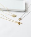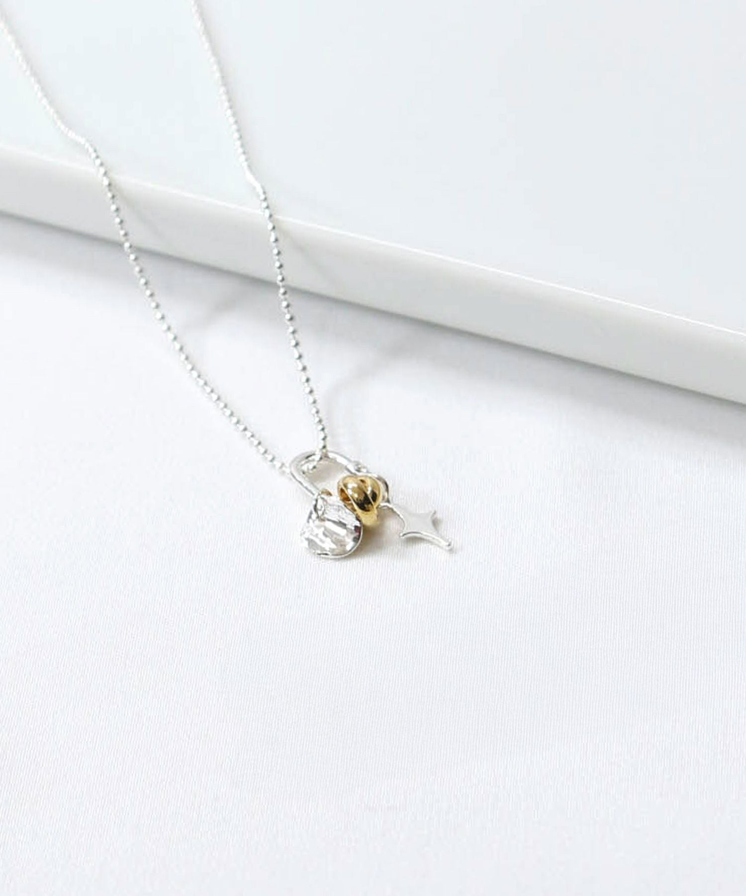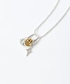 スワロフキーが付いたリングパーツに、プレートチャーム、コイル、オーナメントパーツをあわせた、かわいらしさとトレンド感あるデザインのネックレス。