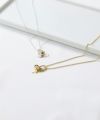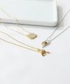 スワロフキーが付いたリングパーツに、プレートチャーム、コイル、オーナメントパーツをあわせた、かわいらしさとトレンド感あるデザインのネックレス。