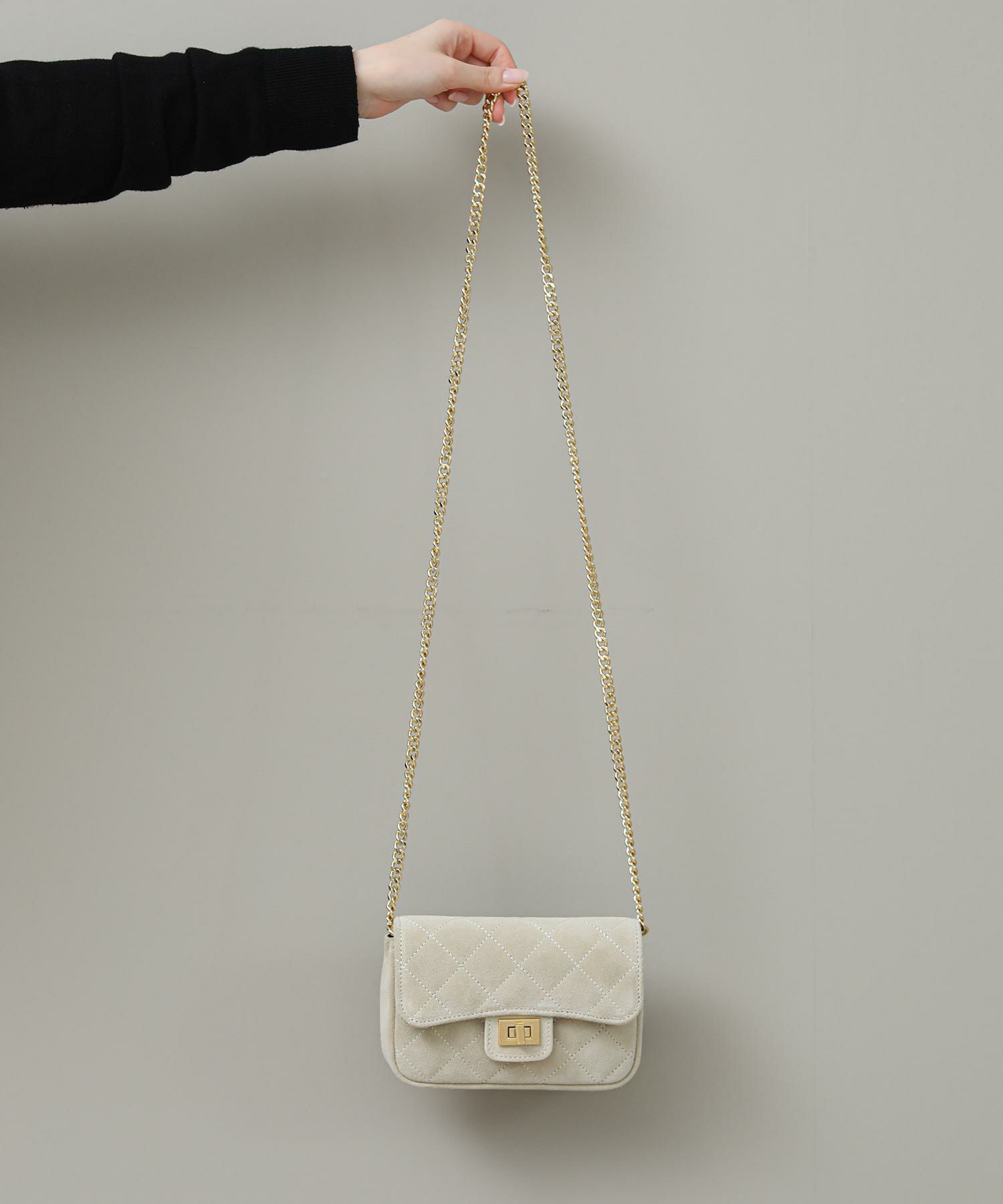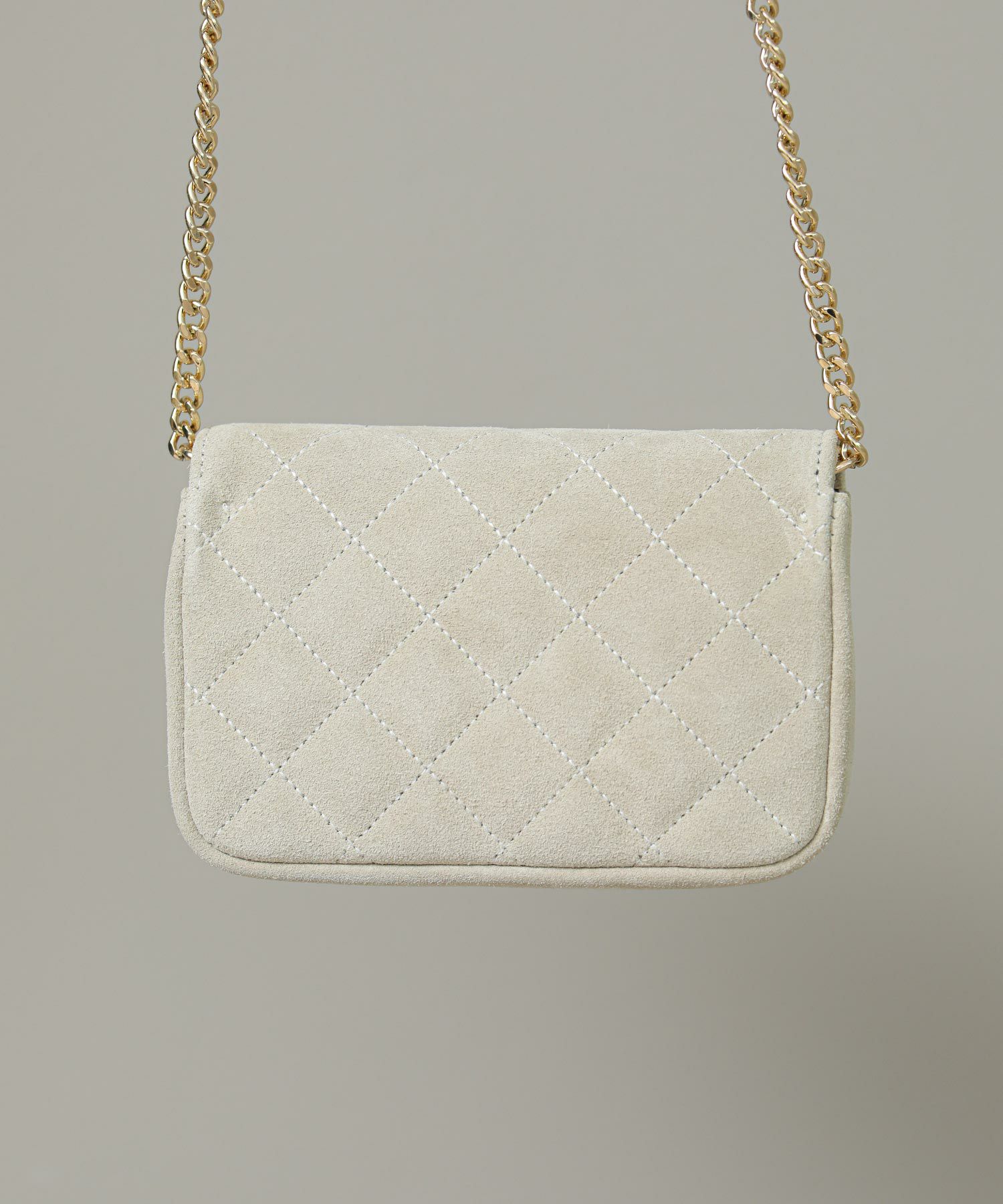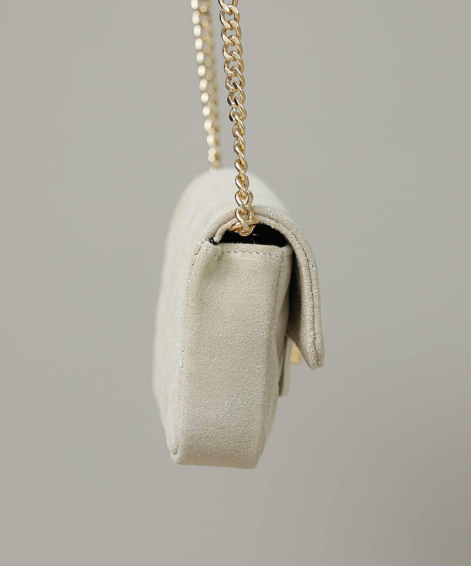 新素材のスエードが登場です。、ゴールドのチェーンと金具が華やかさをプラス。トレンド感あるキルティング加工が、コーディネートに高級感を与えてくれます。コンパクトながらも、スマホやミニウォレット、リップなどの必需品がしっかり収まる収納力で、デイリー使いからパーティーシーンまで幅広く活躍します◎