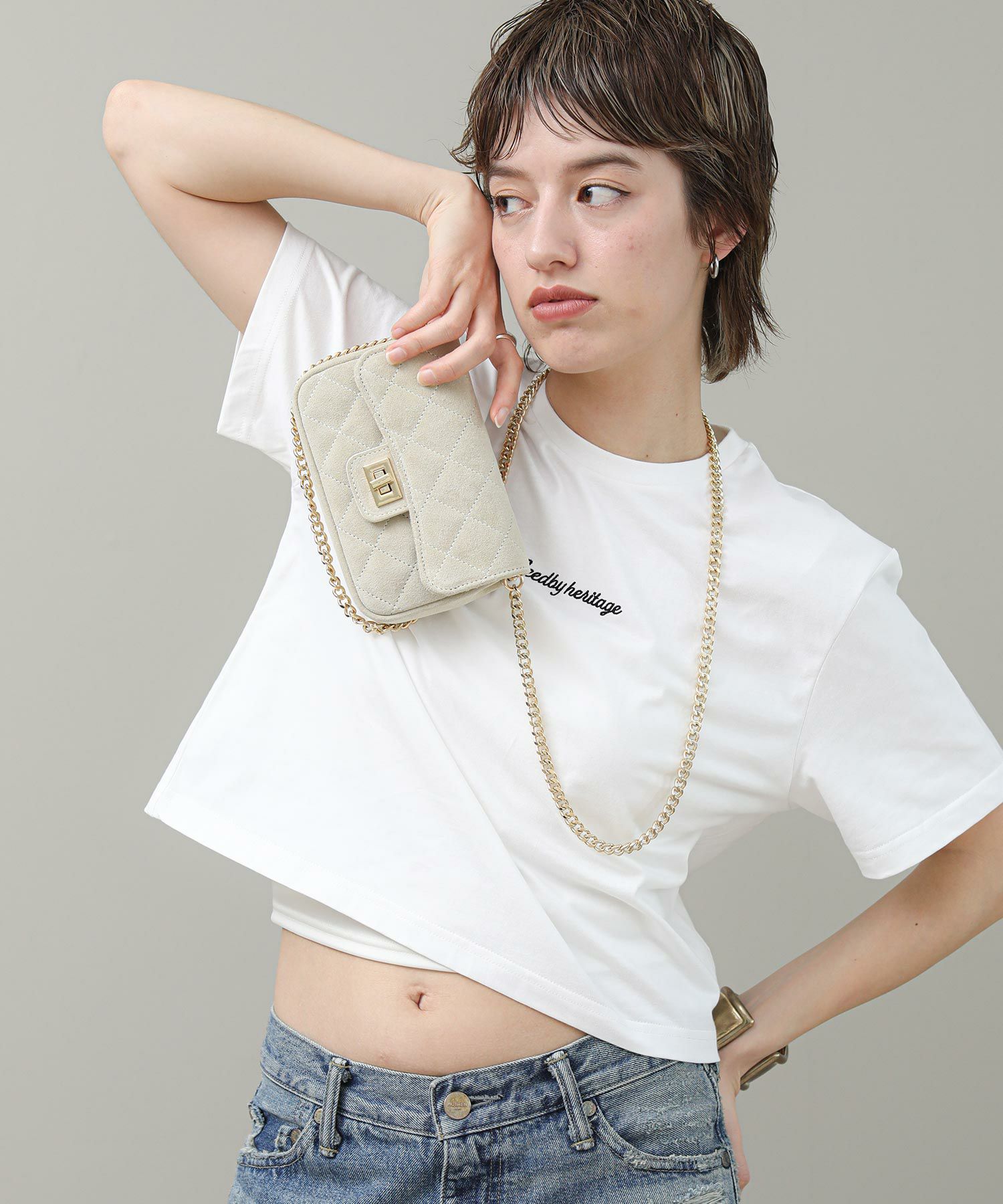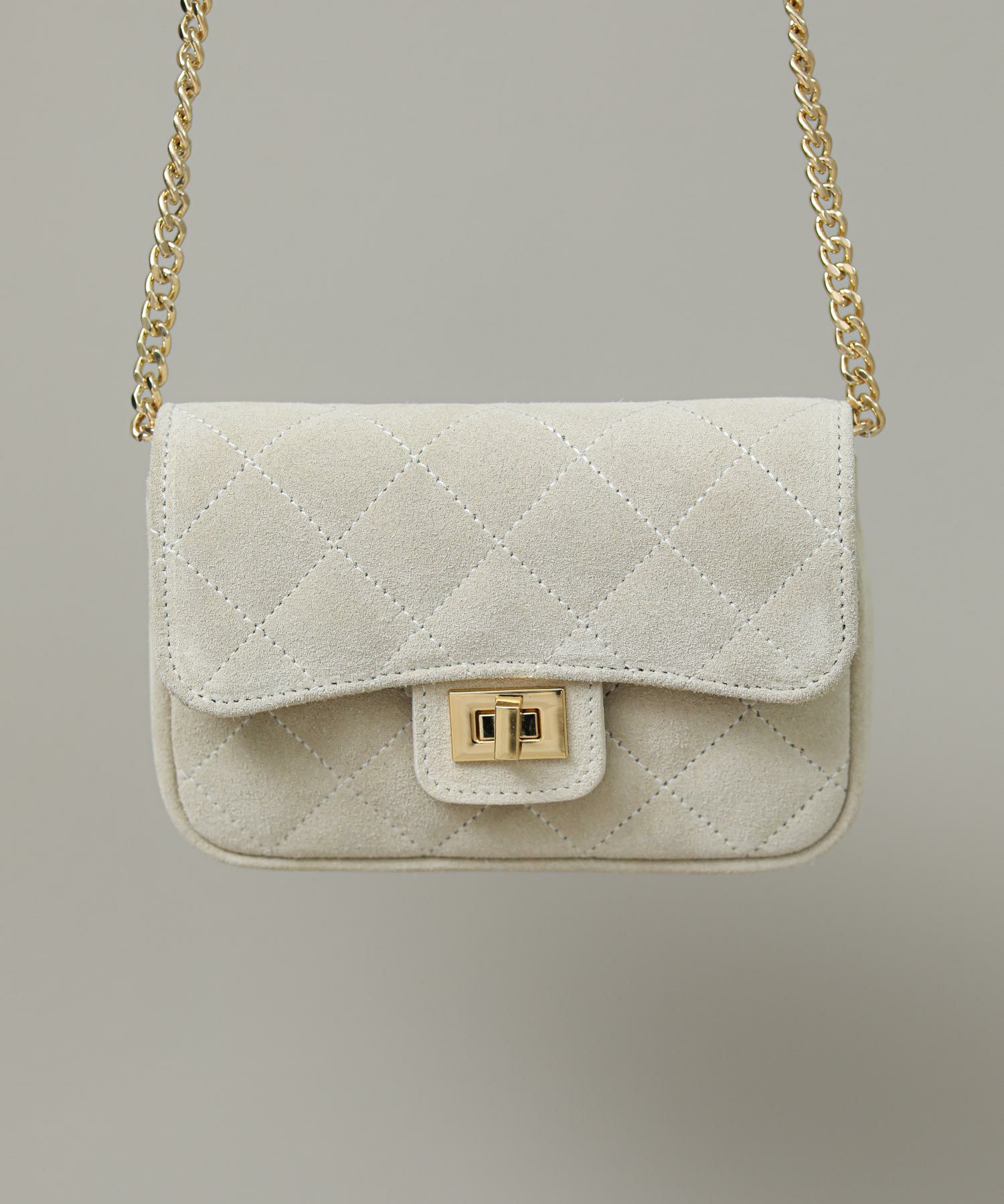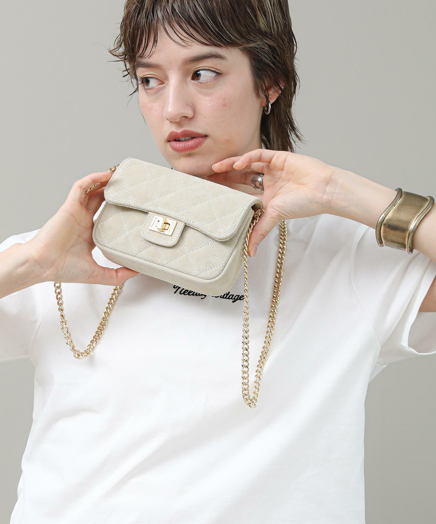 新素材のスエードが登場です。、ゴールドのチェーンと金具が華やかさをプラス。トレンド感あるキルティング加工が、コーディネートに高級感を与えてくれます。コンパクトながらも、スマホやミニウォレット、リップなどの必需品がしっかり収まる収納力で、デイリー使いからパーティーシーンまで幅広く活躍します◎