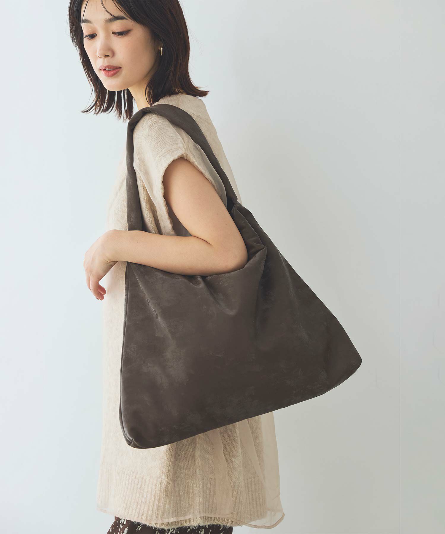 ふんわりと柔らかな形状と軽量で、肩掛けしやすい持ち手が魅力です。