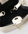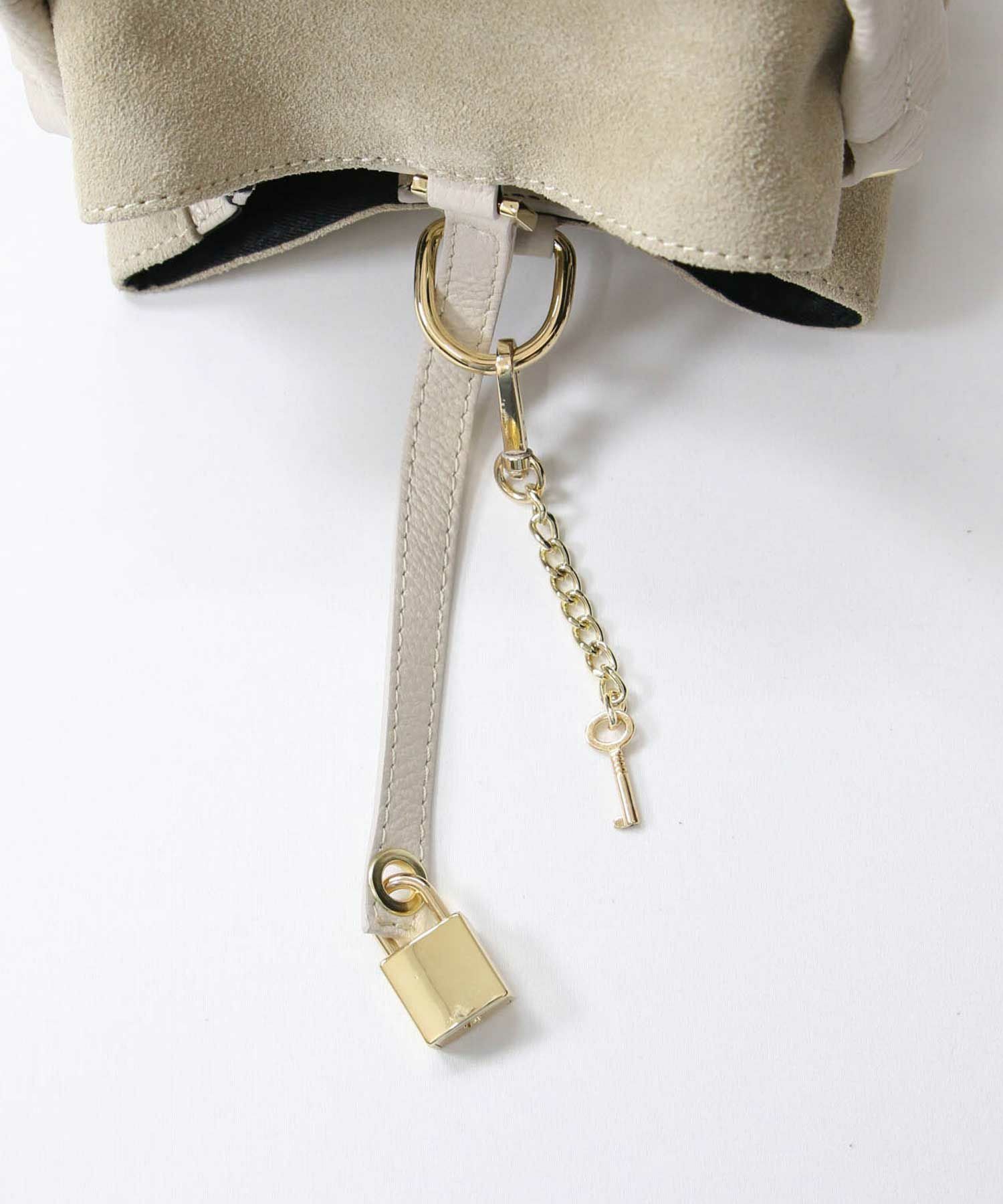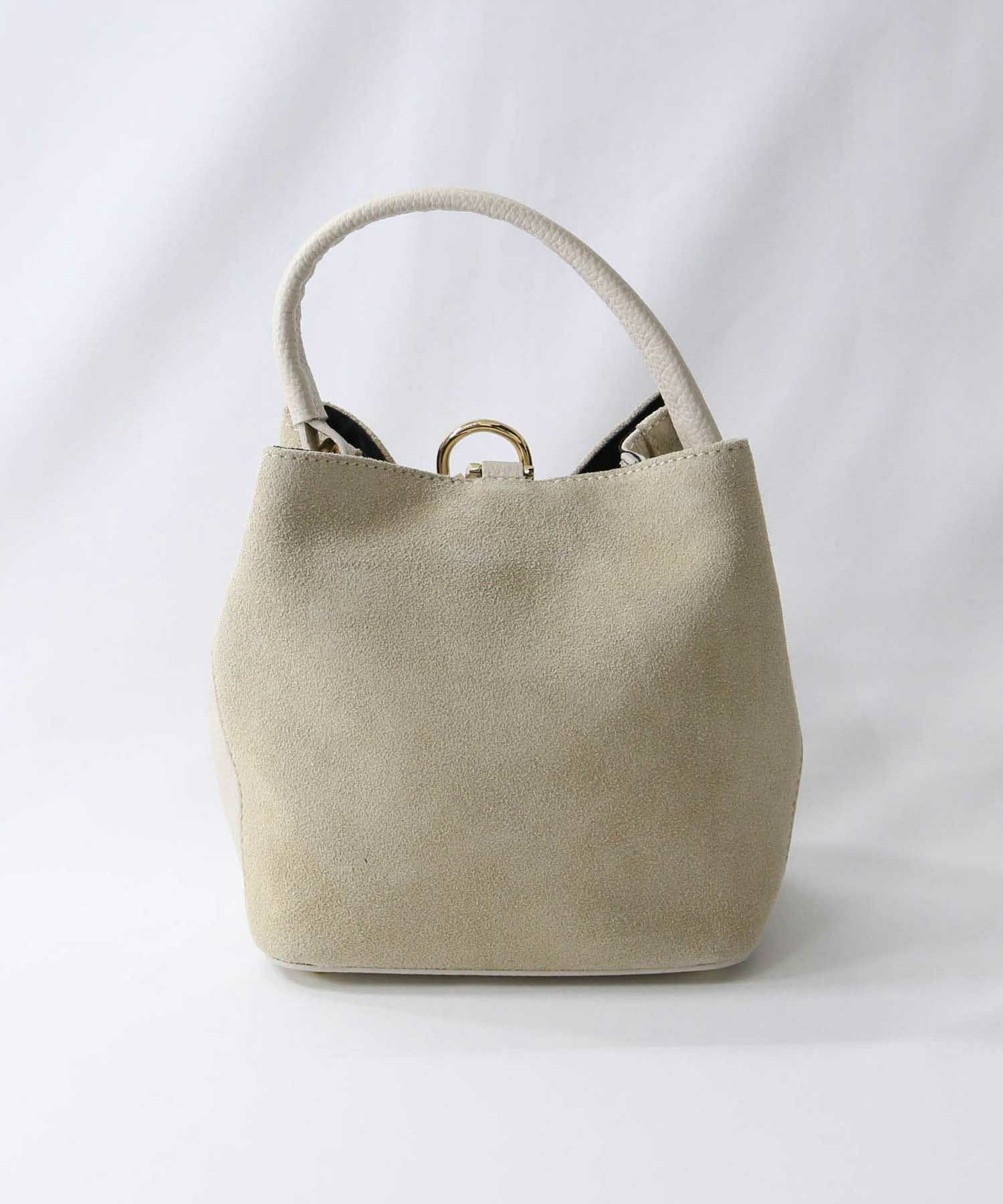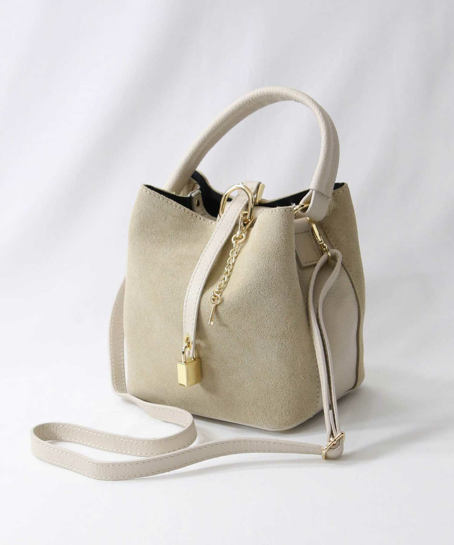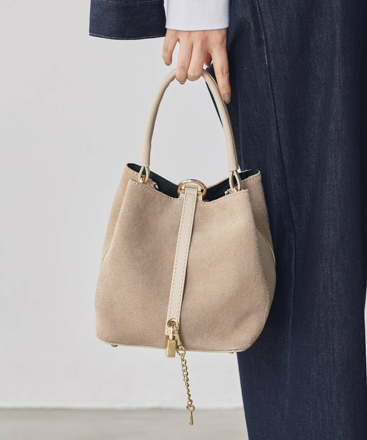 トレンドのアイボリー・ブラウントーンのスタイルに馴染む優しいベージュスウェードをセレクト。