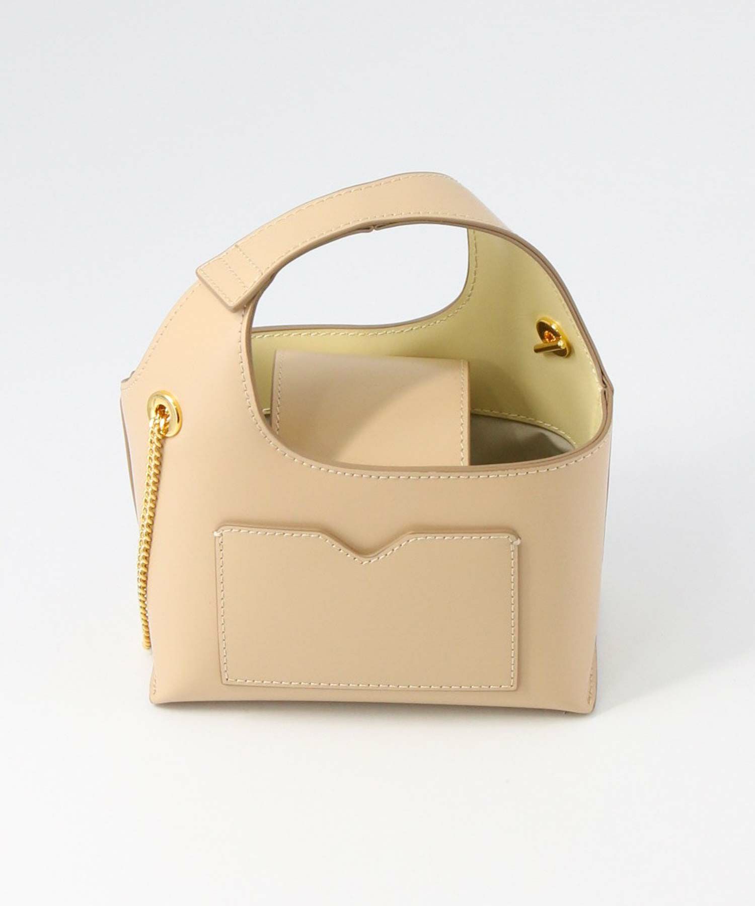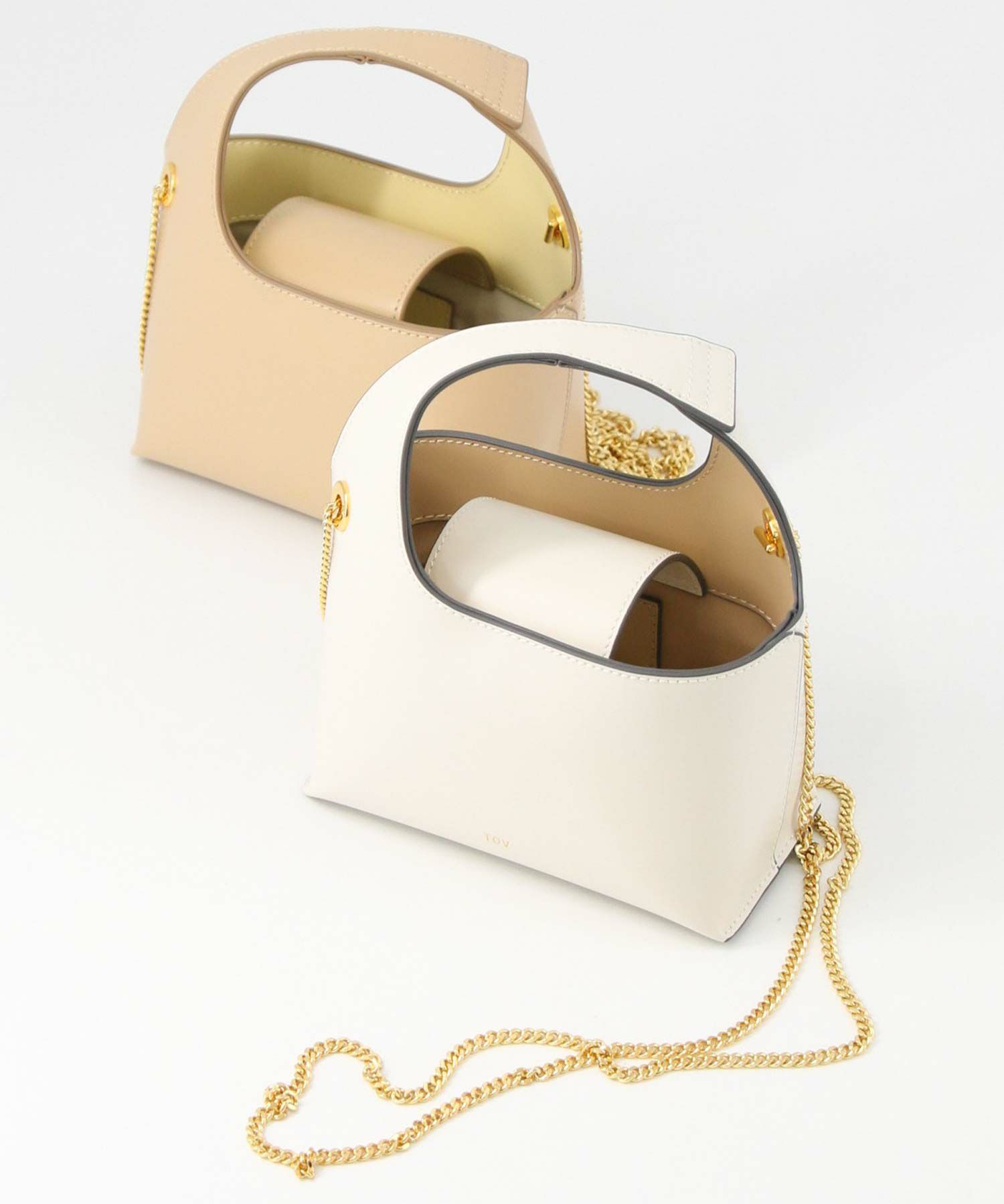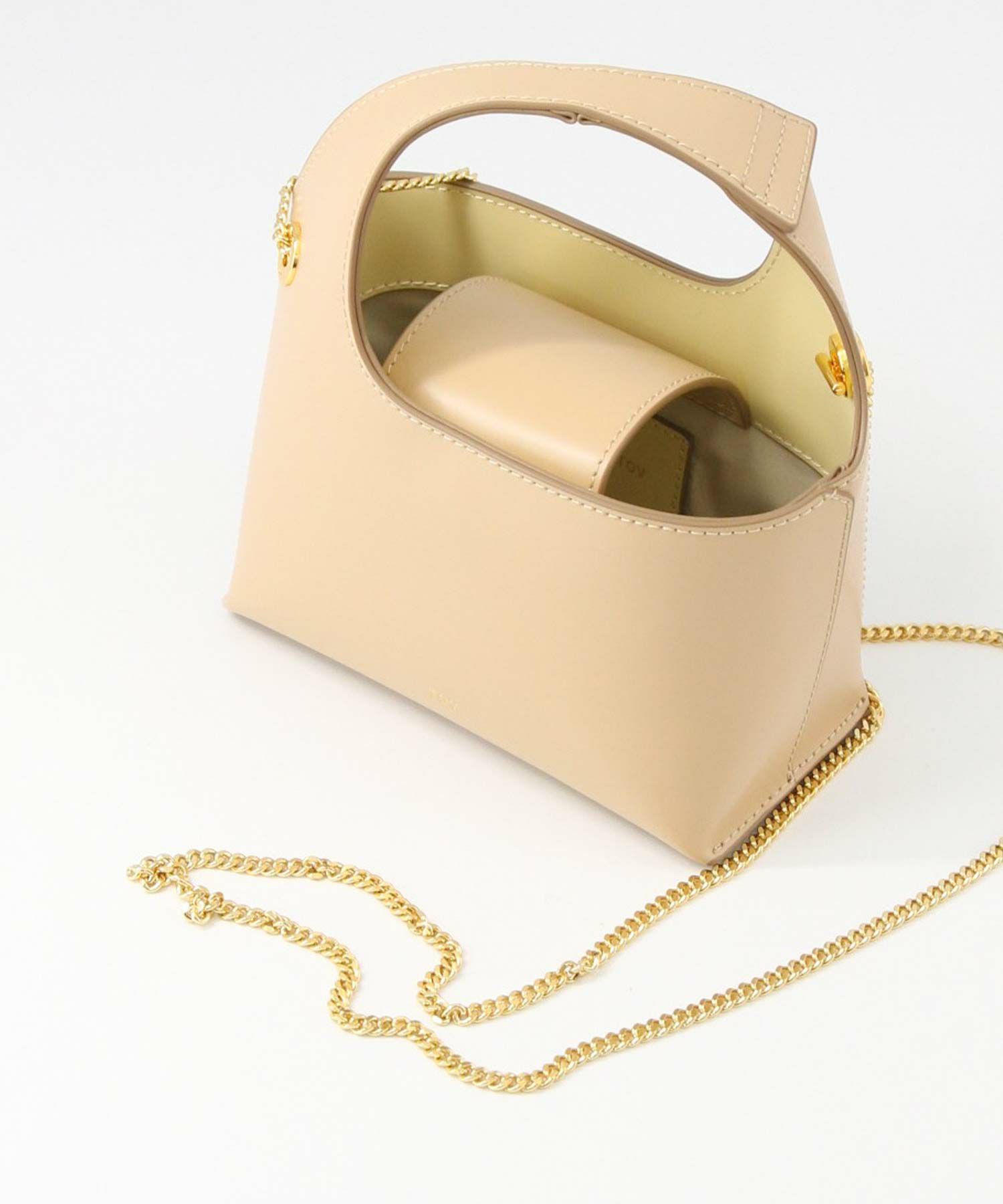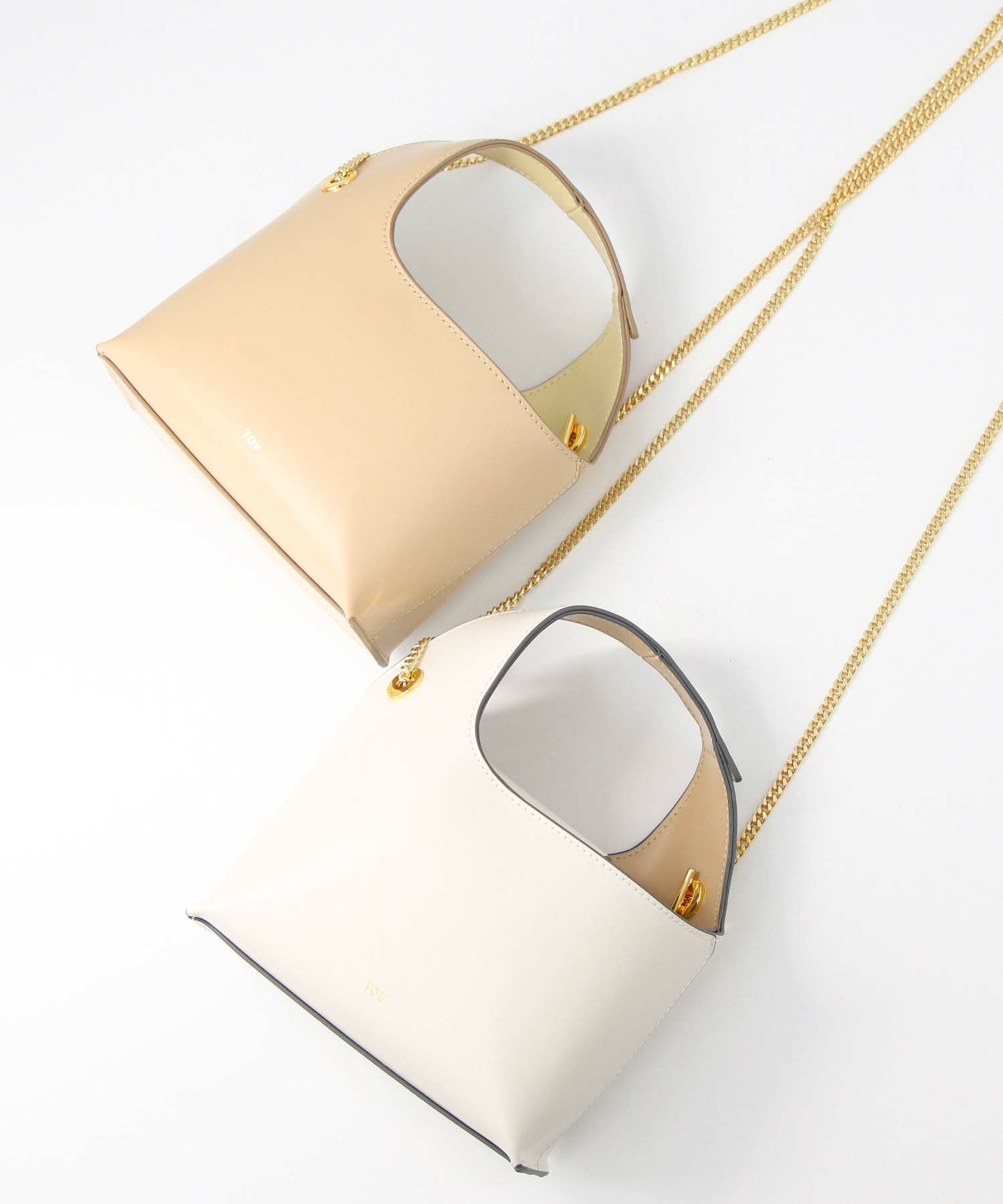素材はやさしい光沢が印象的なガラス調の牛革を使用。表地と裏地をバイカラーにすることや、チェーンストラップで女性らしさをプラス。