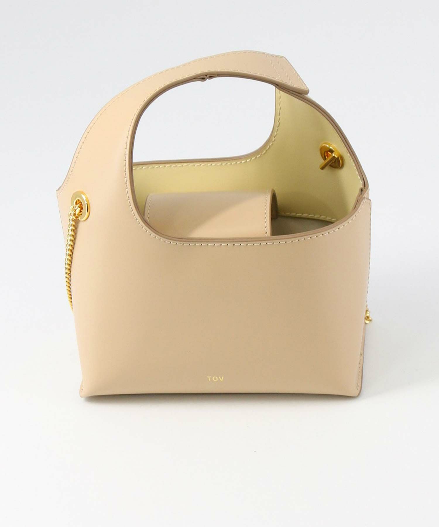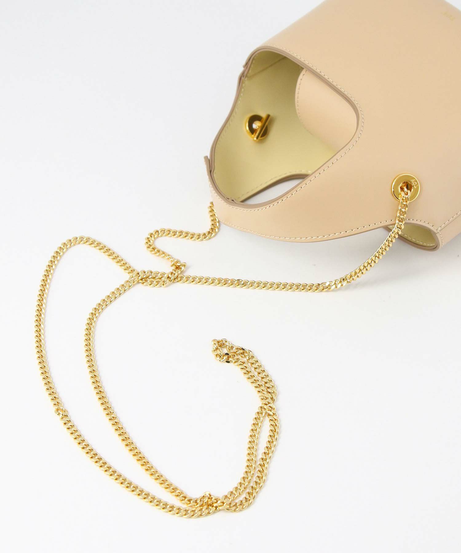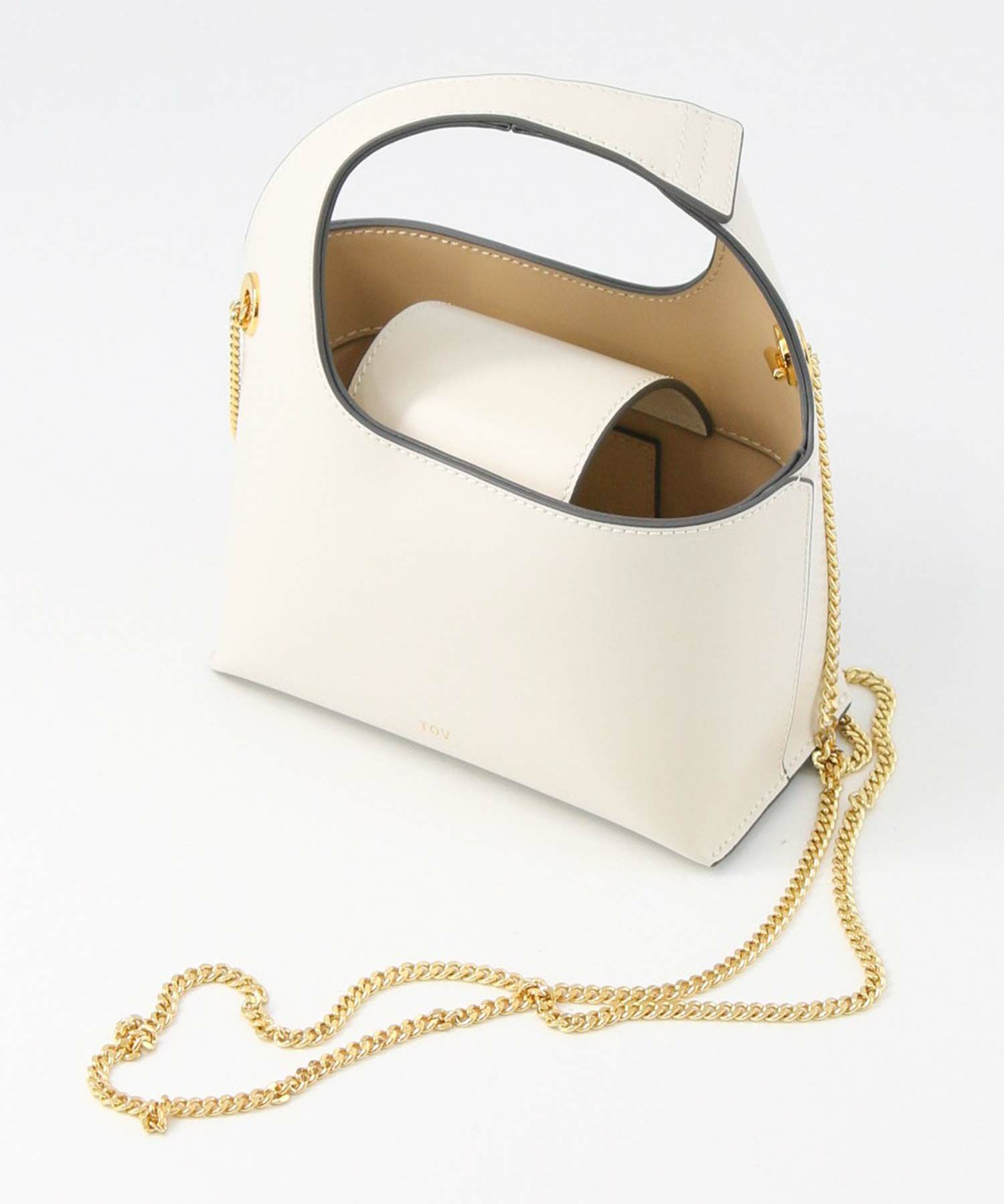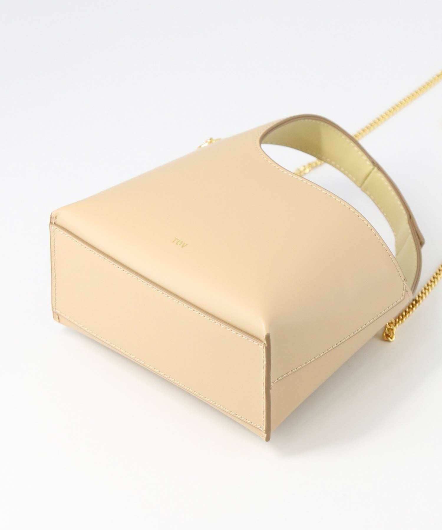 素材はやさしい光沢が印象的なガラス調の牛革を使用。表地と裏地をバイカラーにすることや、チェーンストラップで女性らしさをプラス。