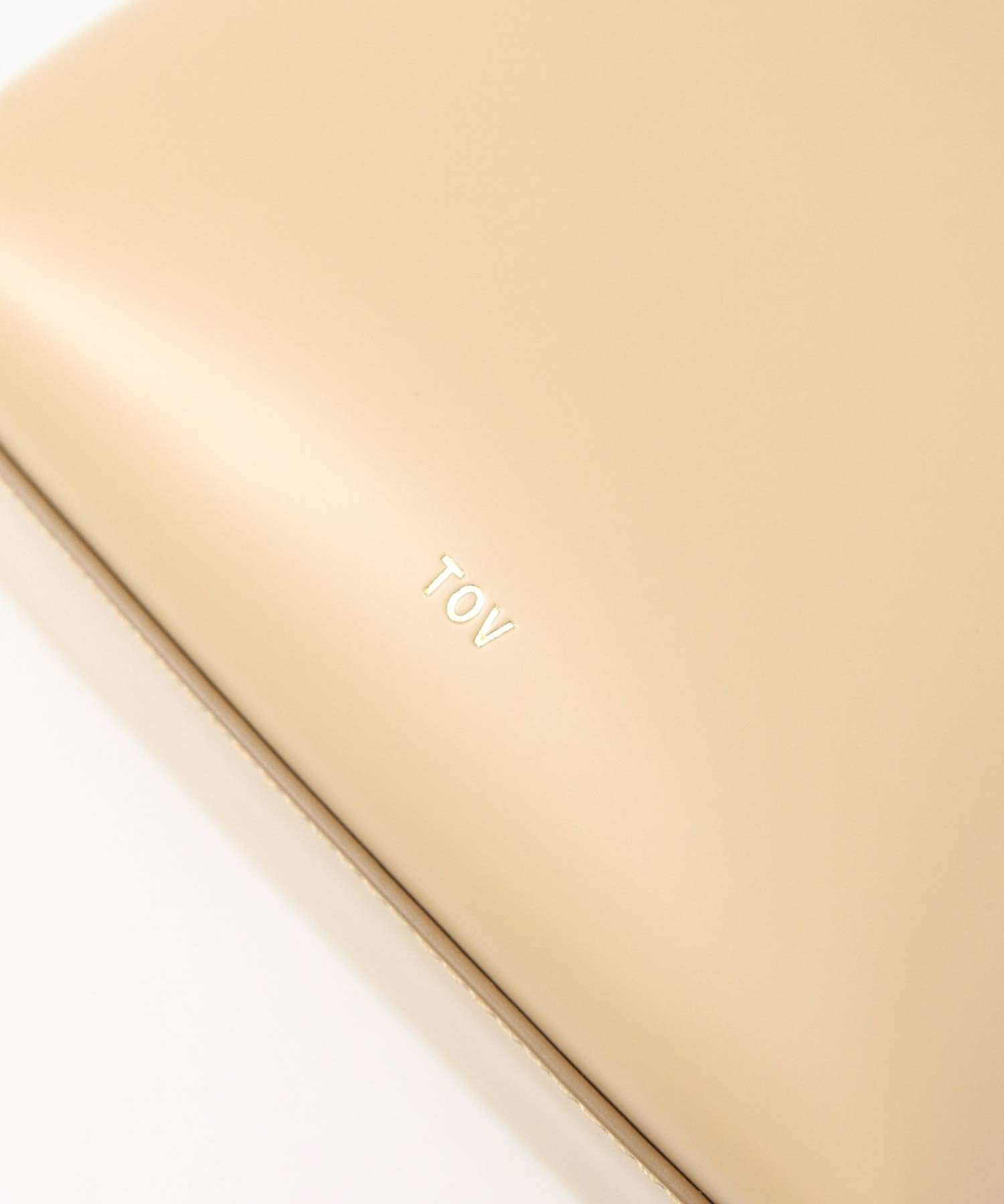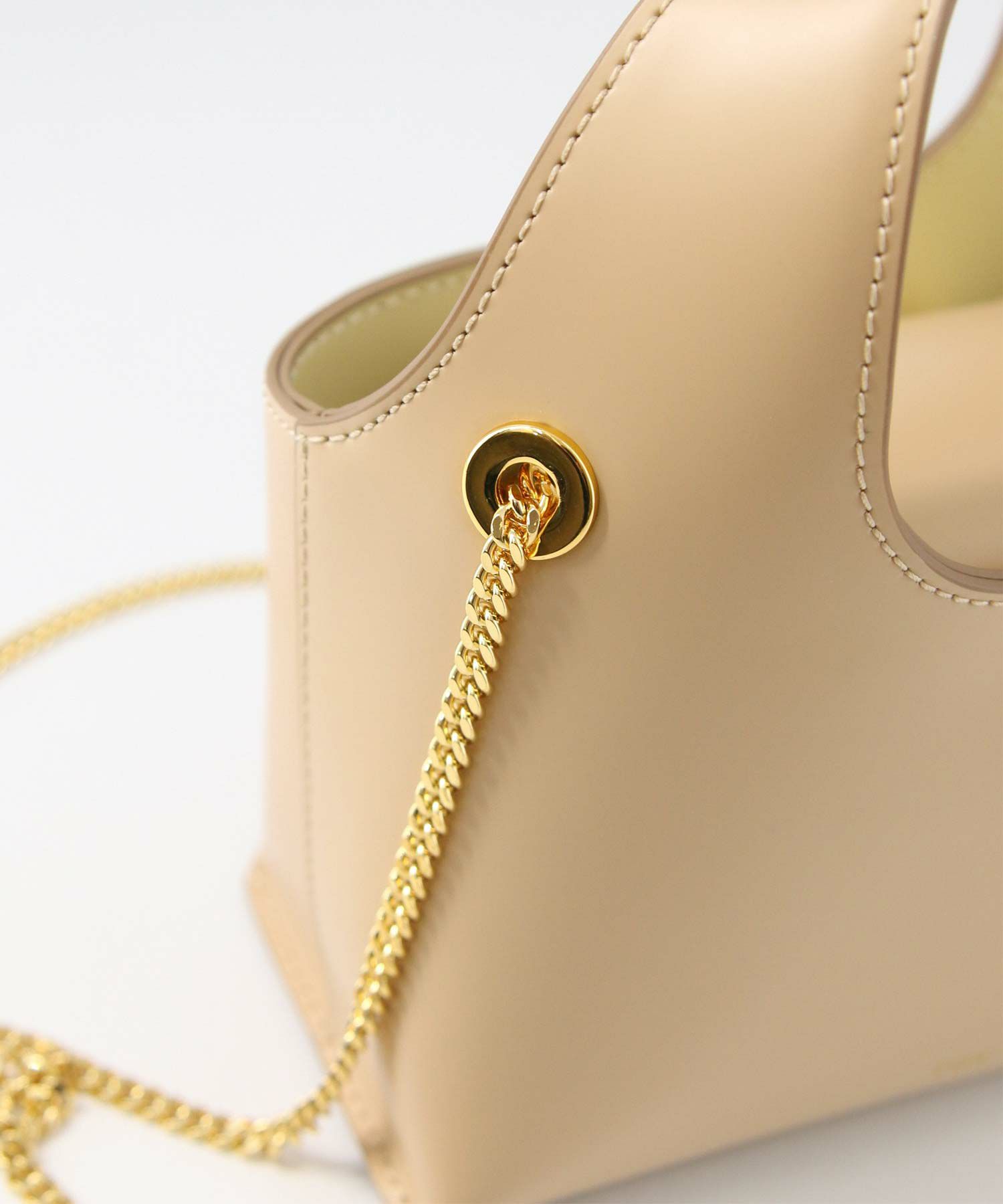 素材はやさしい光沢が印象的なガラス調の牛革を使用。表地と裏地をバイカラーにすることや、チェーンストラップで女性らしさをプラス。